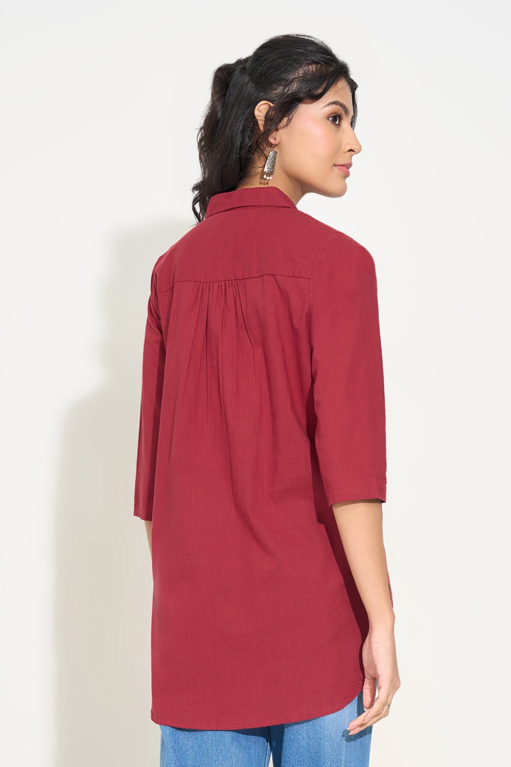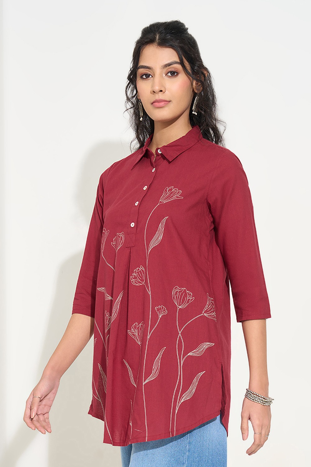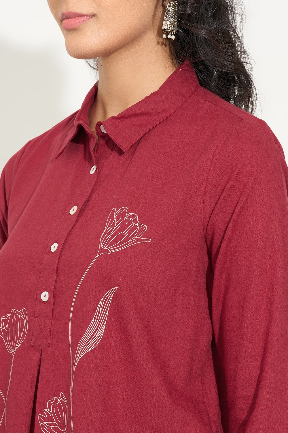 A relaxed tunic with an elegant edge. Featuring a shirt-style collar, buttoned placket, and 3/4 sleeves, it is detailed with tall floral outline prints on the front. The straight fit with subtle pleat enhances comfort and movement.