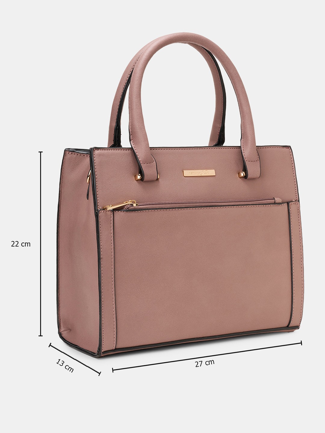 Chic and contemporary, this mini bag lends a polished touch to any look. Designed with a structured silhouette, dual top handles, and gold-tone hardware, it also features a front zip pocket and a detachable strap for added ease. The compact form offers everyday functionality with refined style.