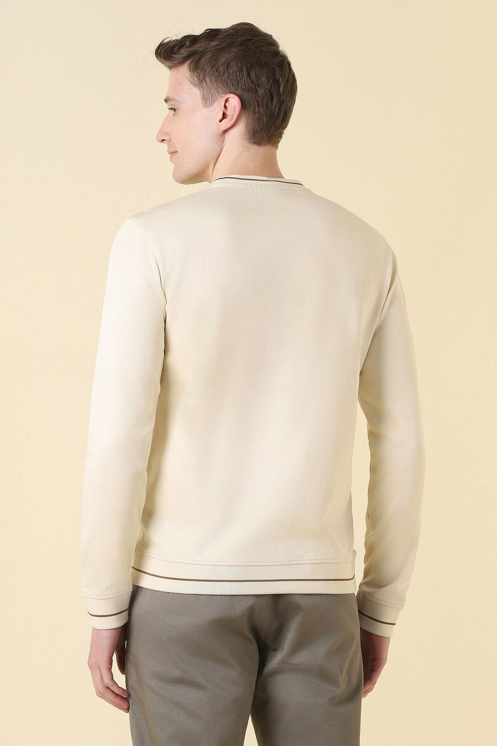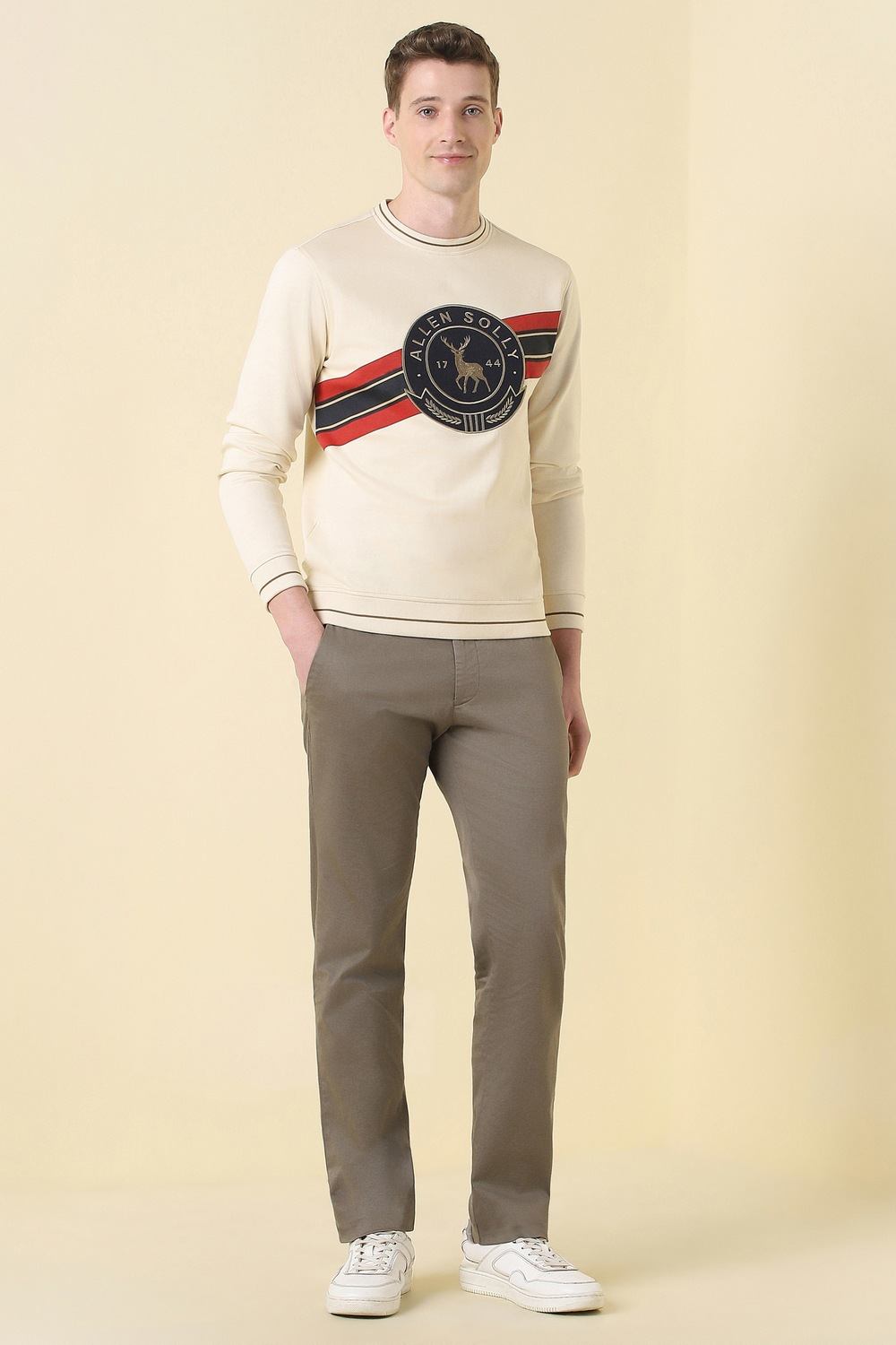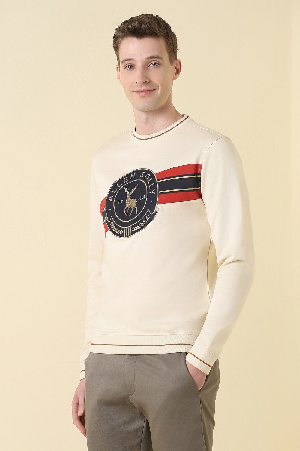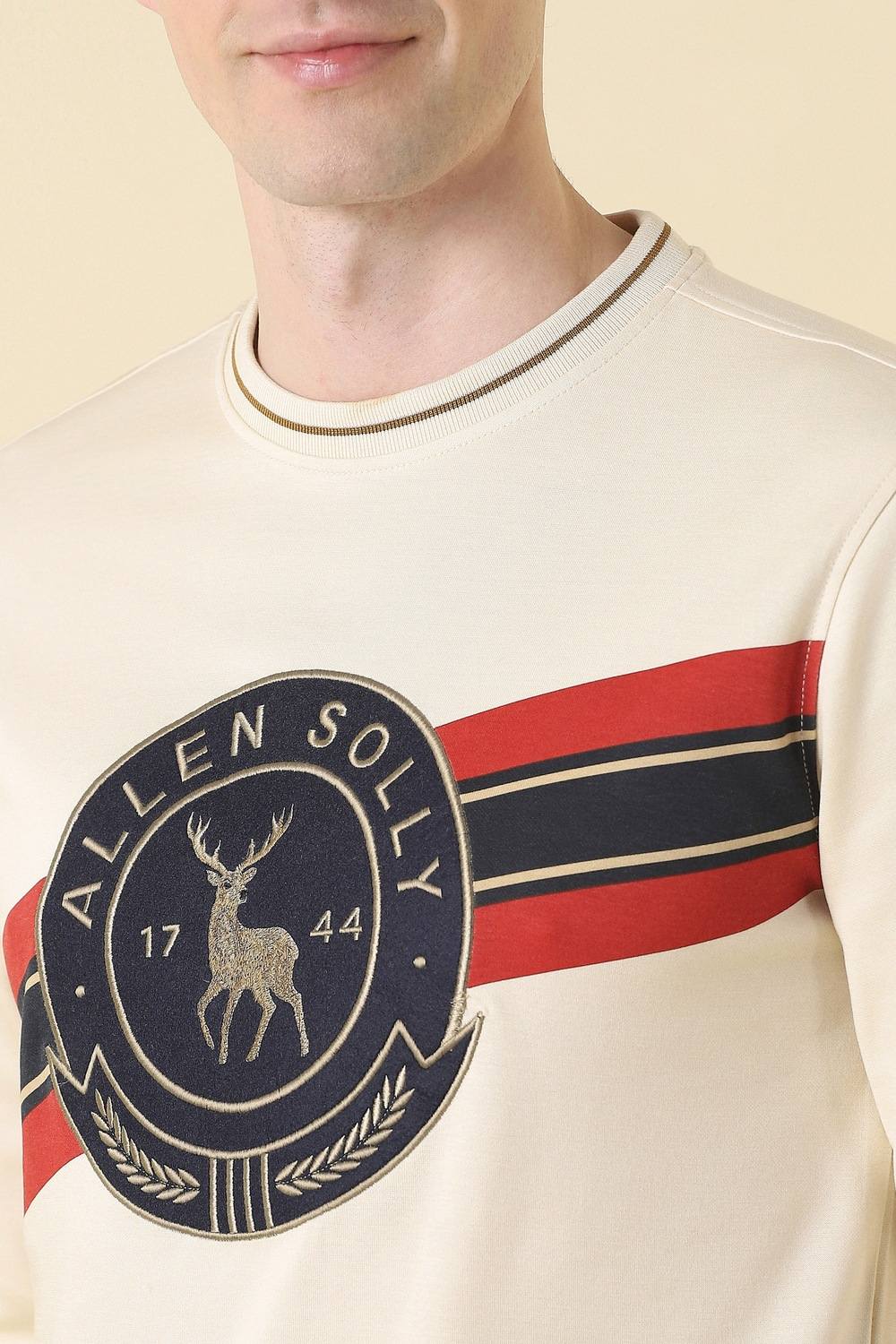 Indulge in the refined leisure of this Allen Solly sweatshirt from the Edition 1744 collection. Crafted from a luxurious blend of cotton and polyester, it features a sophisticated embroidered pattern that adds a contemporary flair to casual ensembles. The crew neck design creates an appealing silhouette, while the beige hue effortlessly complements any palette. A versatile choice for relaxed outings, this piece promises an elevated touch to your everyday attire.