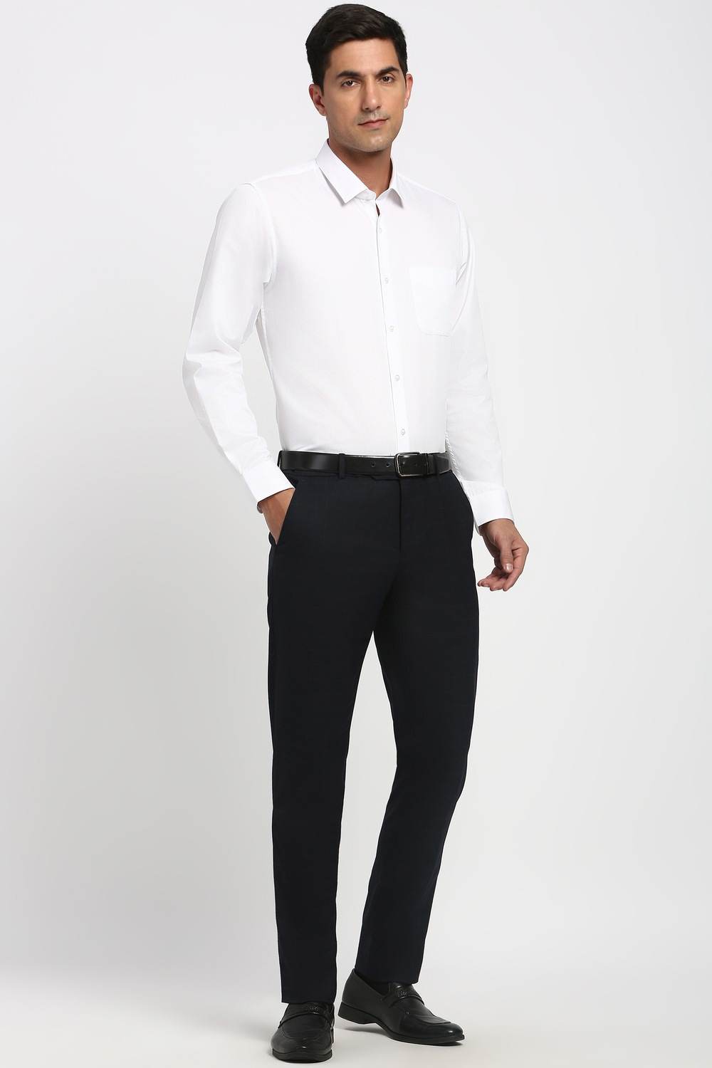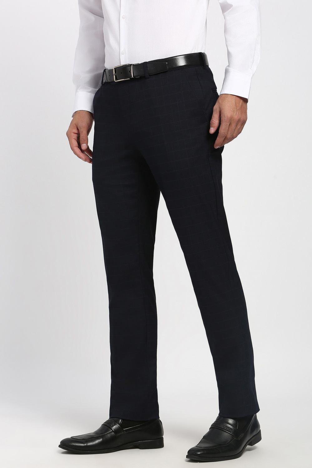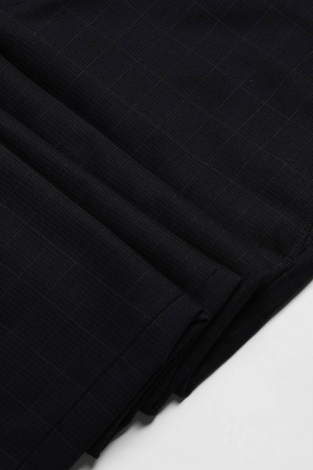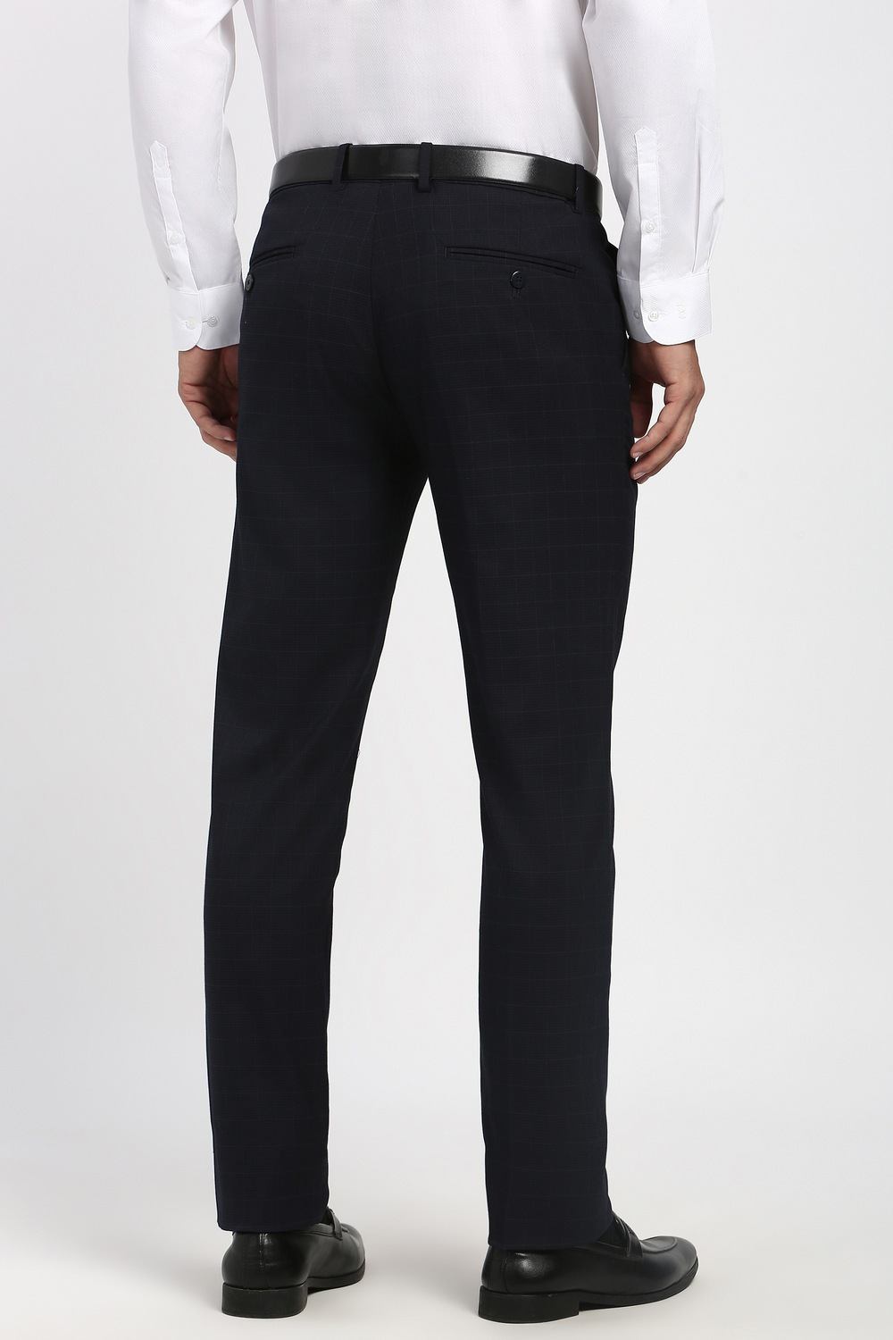Enhance your formal wardrobe with Peter England's black check formal trousers. Crafted from a blend of polyester, viscose, and spandex, these trousers offer a comfortable fit while ensuring a sophisticated appearance for any formal occasion. The timeless check pattern adds a touch of elegance, making these trousers a versatile choice for stylish dressing. Elevate your look with the perfect fusion of comfort and style that these trousers provide.