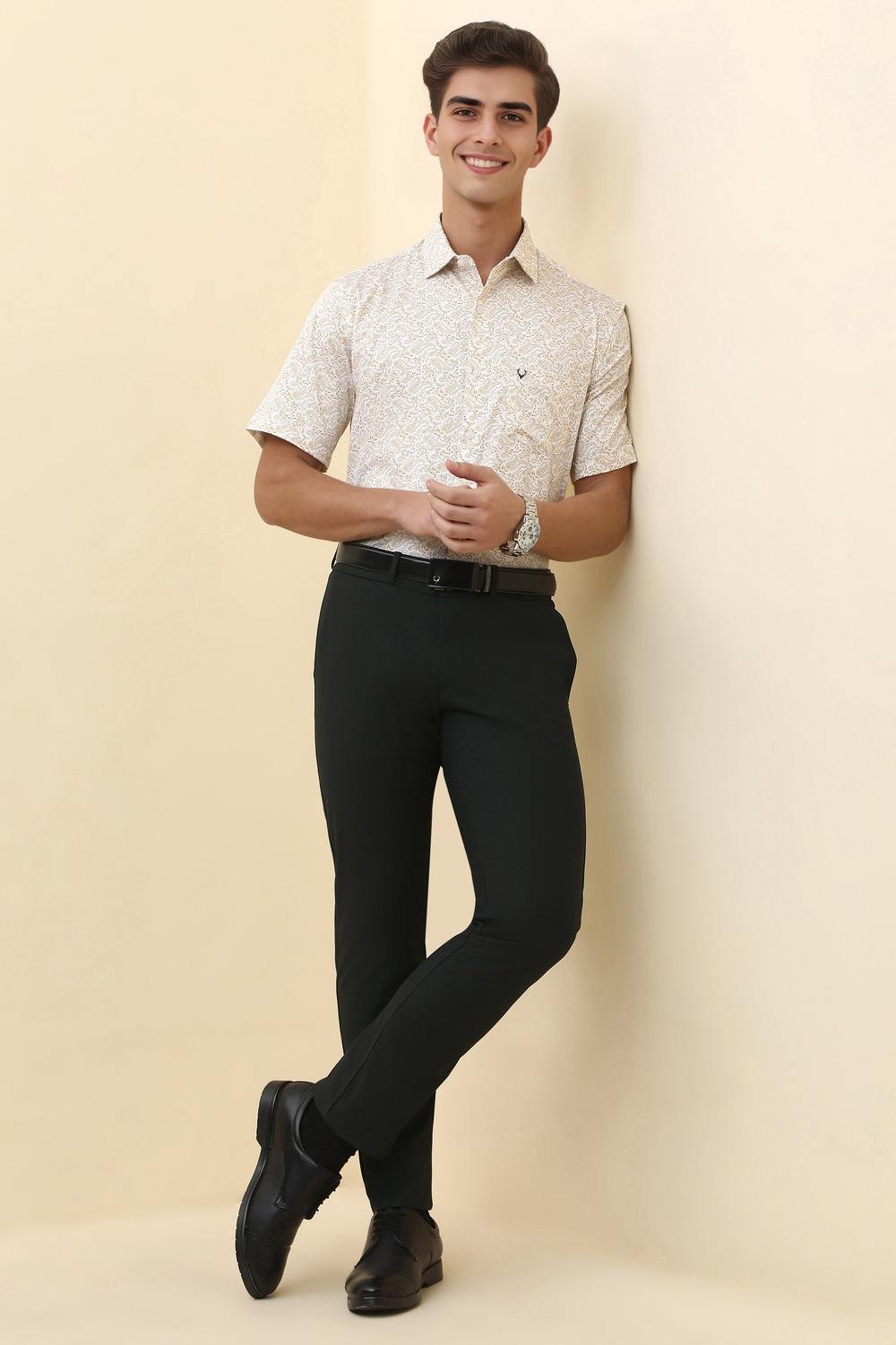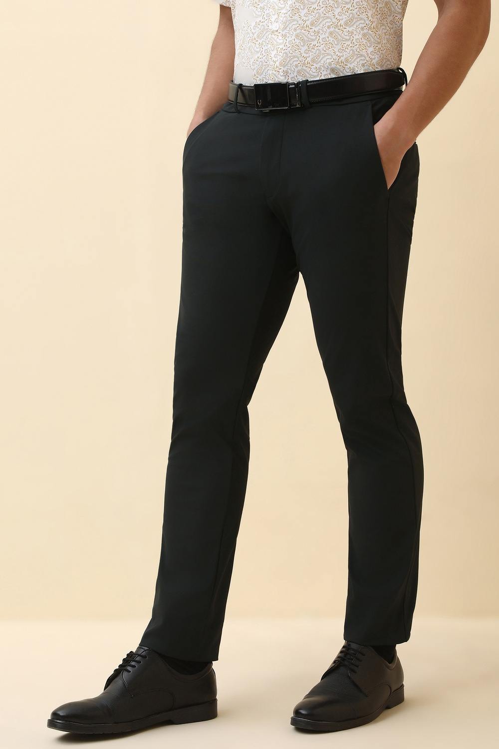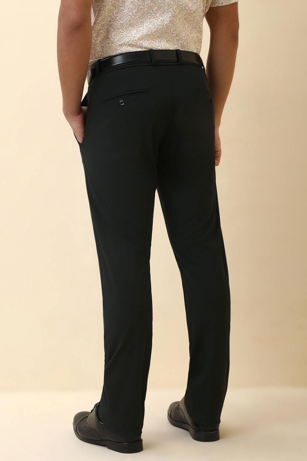 Step up your formal attire with the refined Allen Solly black trousers. Crafted from high-quality polyester, these solid-pattern trousers offer a sleek silhouette suitable for any sophisticated occasion. Their elegant design ensures a polished look, making them an essential addition to your wardrobe. Experience comfort without compromising on style - a must-have for every discerning gentleman. Elevate your ensemble with these classic trousers that perfectly blend timeless elegance and modern sophistication.