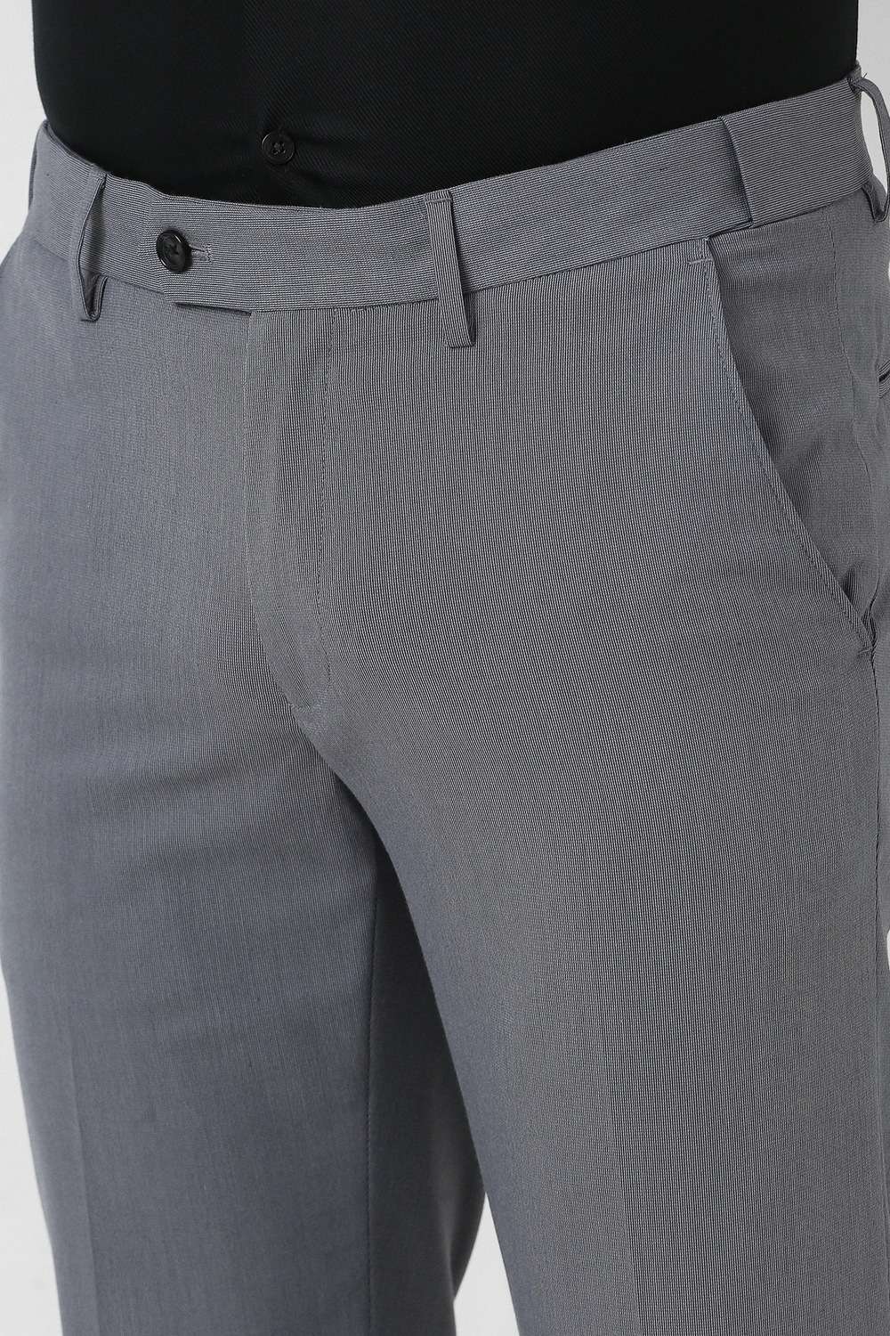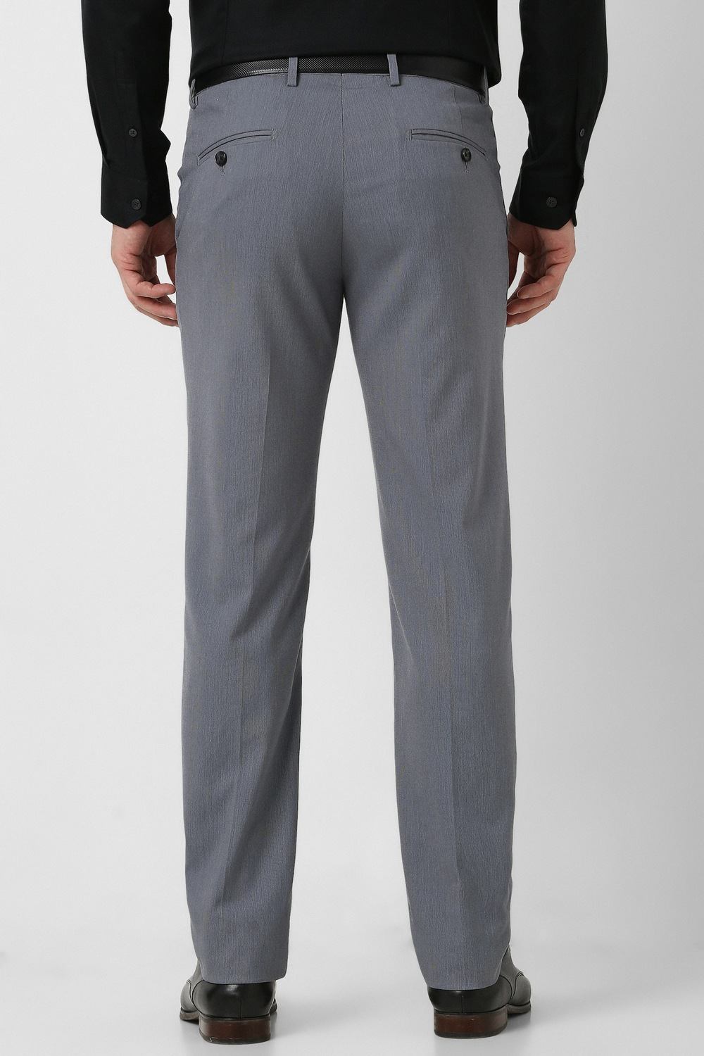 Introducing the Peter England Slim-Fit Formal Trousers in a sophisticated grey hue. Crafted from a premium blend of polyester, viscose, and spandex, these trousers offer both comfort and a tailored silhouette. The textured pattern adds a touch of subtle refinement, making them perfect for any formal occasion. With a flat front design, these trousers enhance your sharp look while ensuring all-day ease. Elevate your style effortlessly with this essential wardrobe addition.