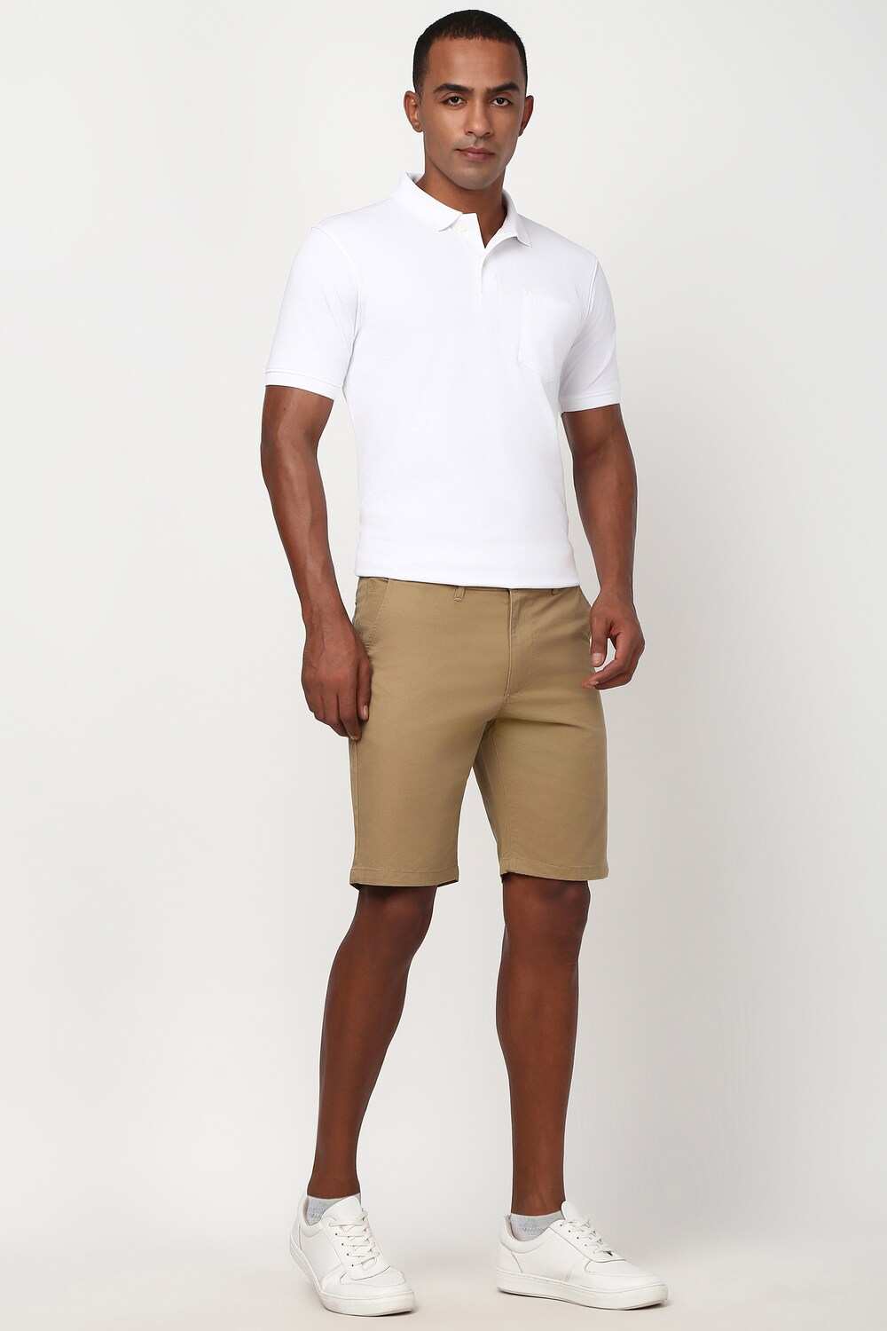 Embrace effortless style with the Peter England Casuals khaki shorts. Crafted from a soft blend of cotton and spandex, these regular-fit shorts ensure all-day comfort and a great fit. The vibrant printed design adds a playful touch, making them perfect for casual outings. With an ideal balance of comfort and style, these shorts are a must-have addition to your wardrobe for warm sunny days. Enjoy versatile styling options with this chic piece.