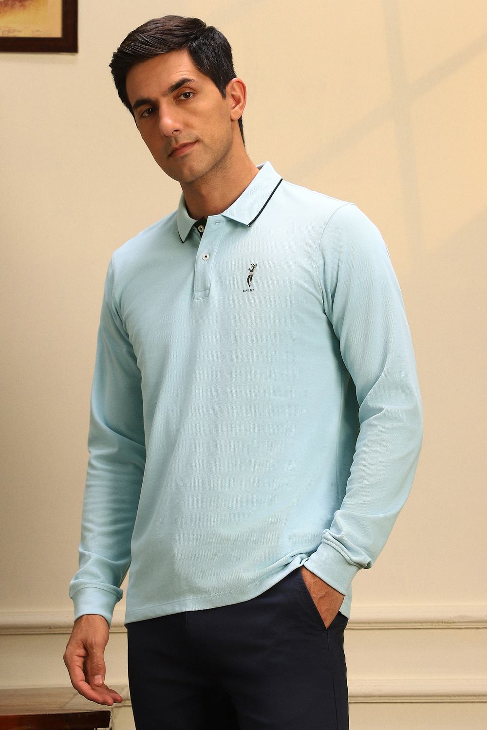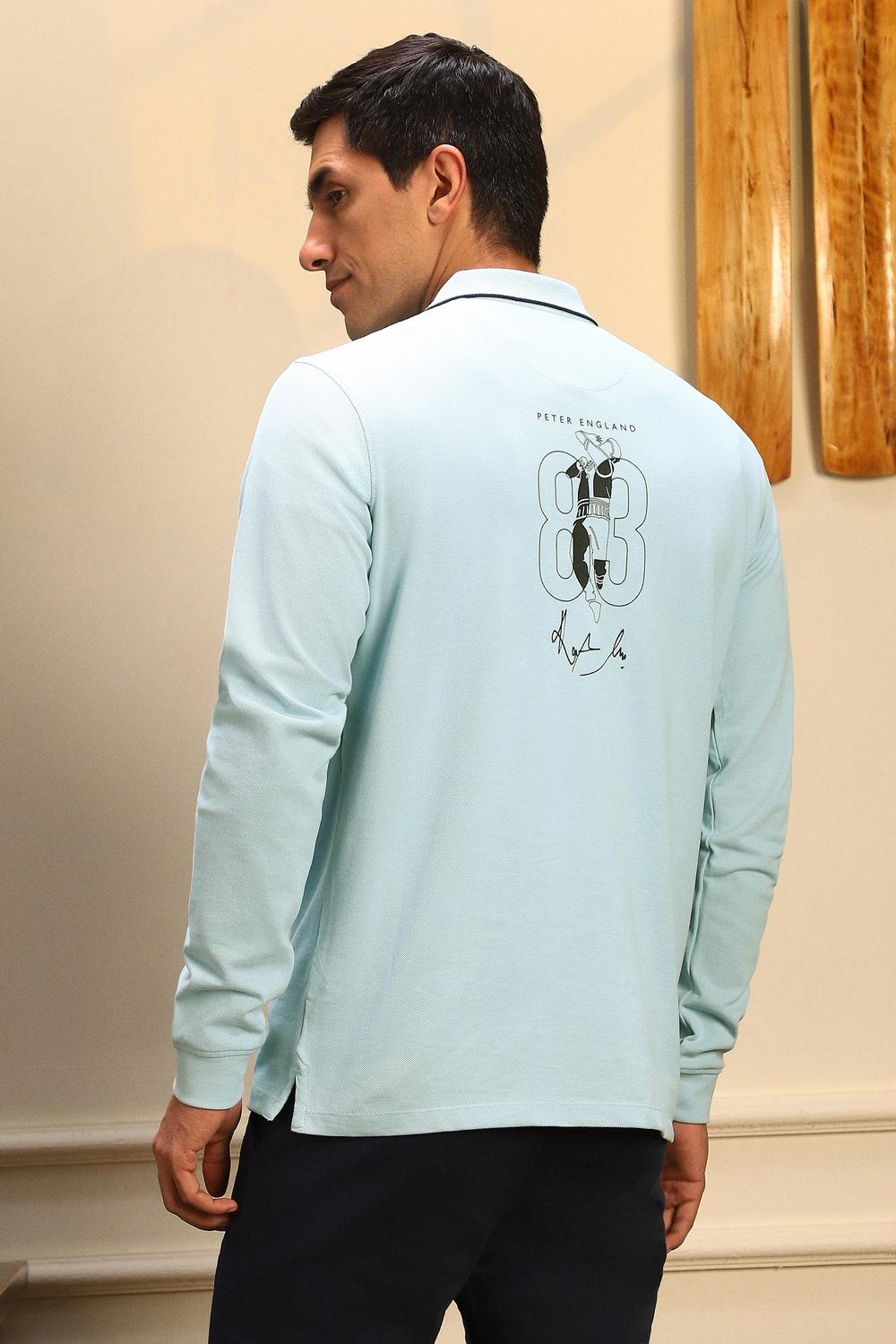 This Peter England Casuals light blue t-shirt features a vibrant graphic print, perfect for a casual day out. Crafted from soft cotton, it ensures comfort while enhancing your style. The classic polo neckline adds a touch of sophistication, making it an ideal choice for laid-back gatherings and outings. Experience a blend of comfort and fashionable flair with this essential t-shirt, designed to elevate your everyday wardrobe.
