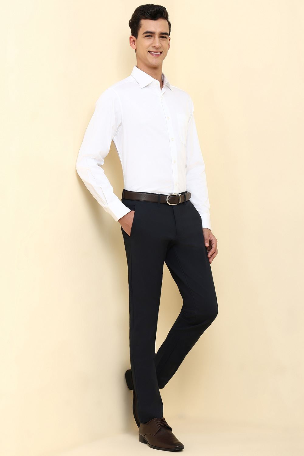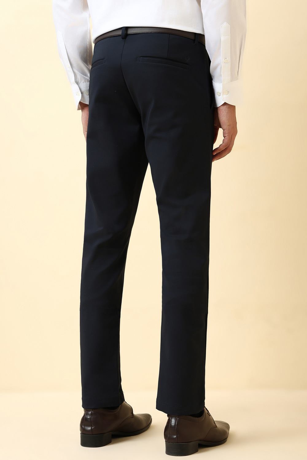 Elevate your wardrobe with the Allen Solly navy trousers from the Edition 1744 collection. Crafted from a premium blend of cotton, nylon, and spandex, these solid trousers provide a tailored fit that ensures comfort and sophistication. Perfect for formal occasions, they effortlessly combine elegance with a modern touch, allowing you to make a lasting impression. Discover the difference in style and quality these trousers bring to your ensemble.