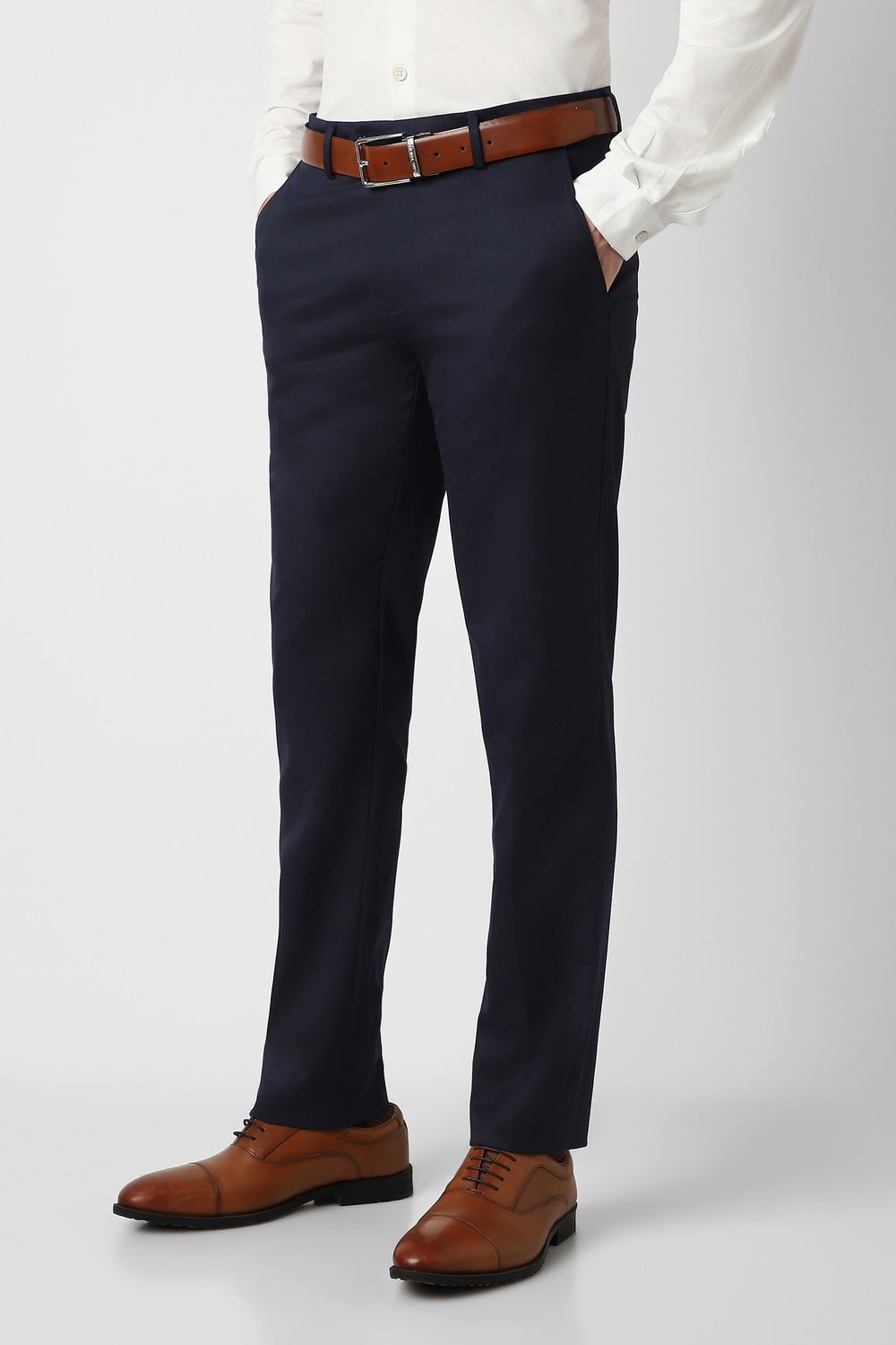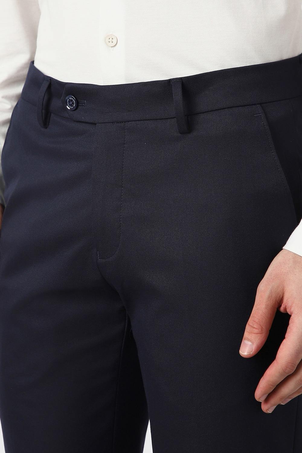 Discover refined elegance with Peter England Elite formal trousers in navy. Crafted from a premium blend of polyester, viscose, and spandex, these trousers ensure comfort and flexibility for a sophisticated look. The solid pattern makes them versatile, seamlessly transitioning from office meetings to formal events. Experience the perfect balance of style and practicality with tailored detailing that enhances your silhouette. Elevate your wardrobe with these essential formal trousers.
