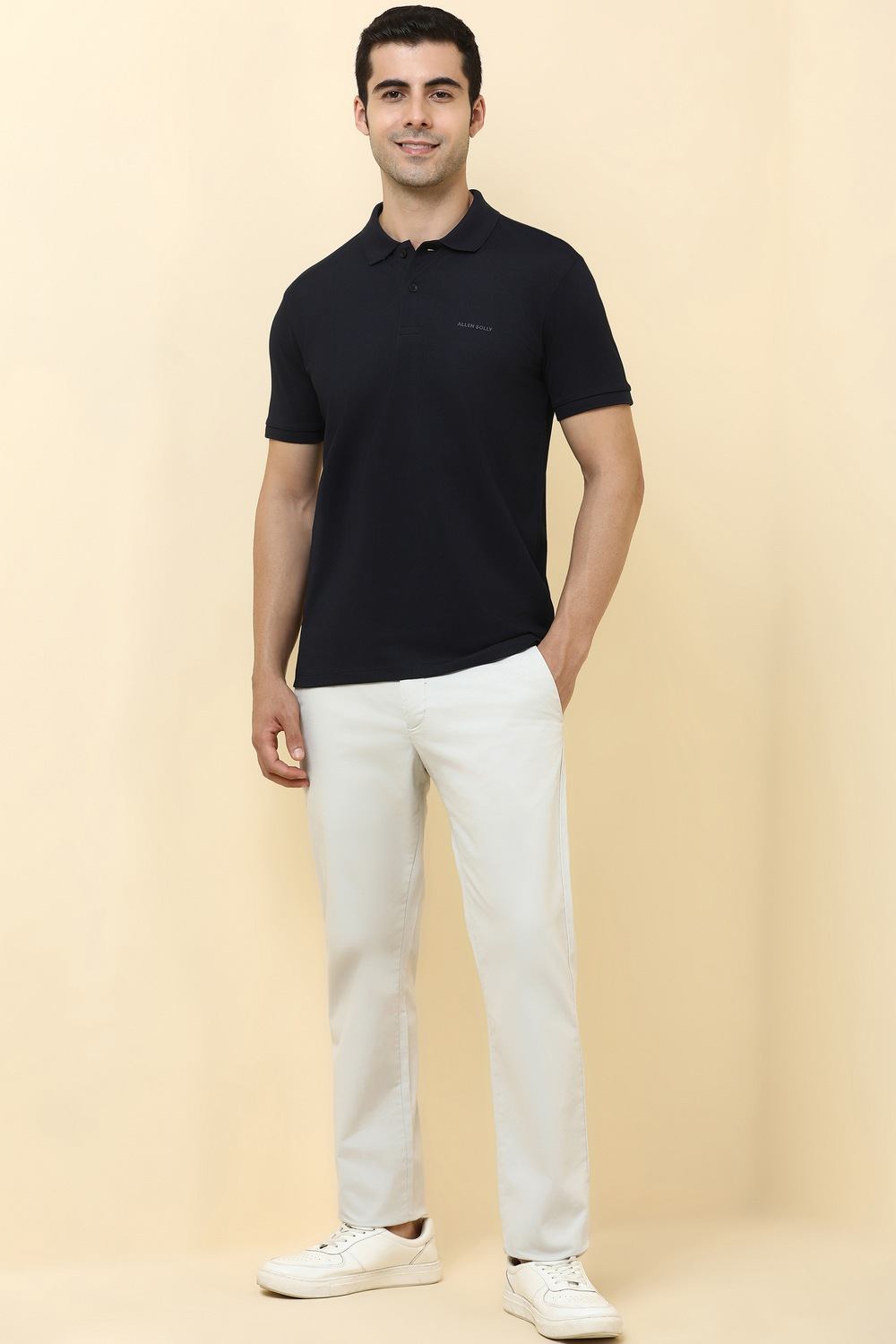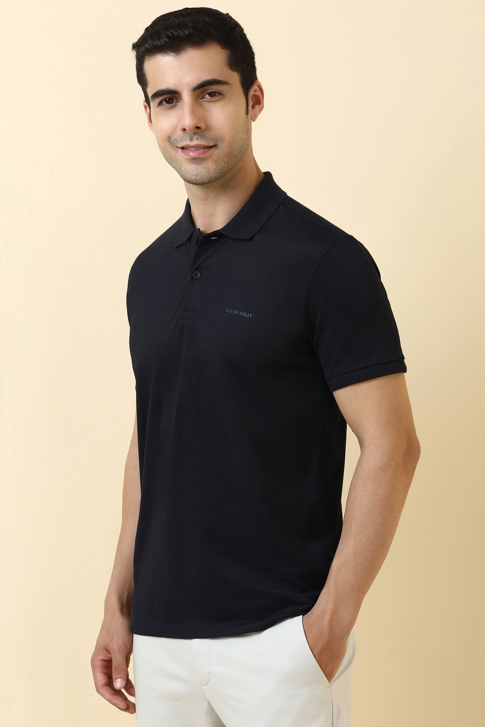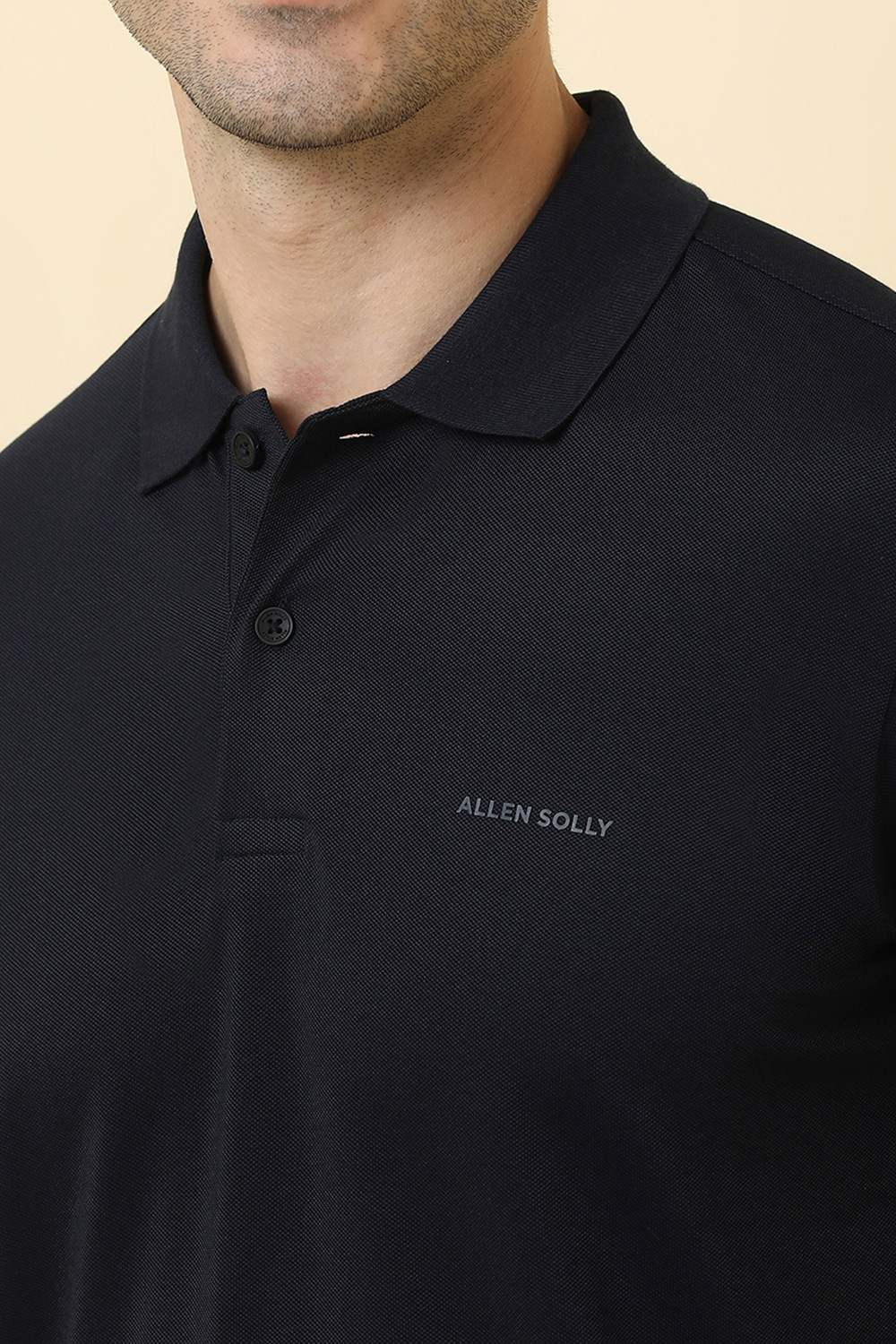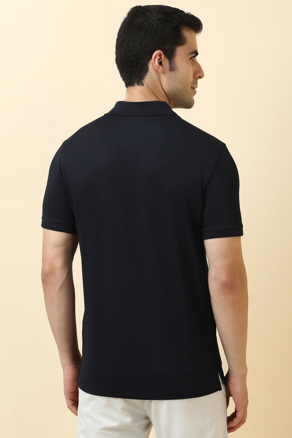 Experience comfort and style with the Allen Solly navy t-shirt. Crafted from soft cotton, it features a textured pattern and a classic polo neck, perfect for casual outings. The breathable fabric ensures ease of movement, making it an ideal addition to your everyday wardrobe. Embrace sophistication and effortless style with this essential piece that elevates any casual ensemble.
