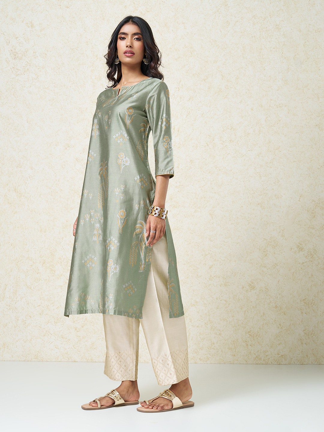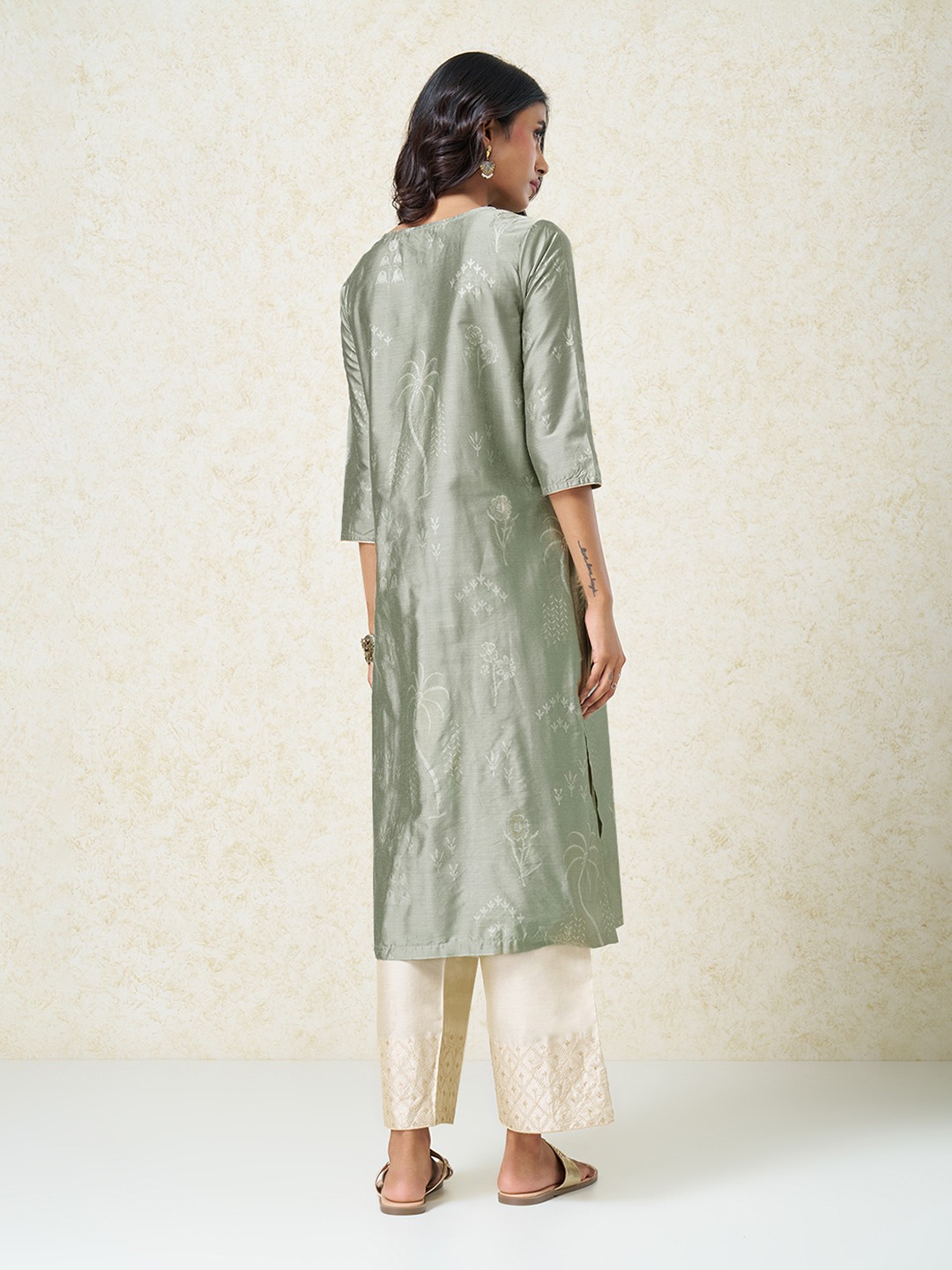 Designed for soft festive moments, this kurta balances freshness with understated elegance. Cut in a fluid silhouette with a subtle split neckline and 3/4 sleeves, it features all-over motifs rendered in a delicate, tonal palette that keeps the look light yet celebratory. Easy and refined, it transitions seamlessly from daytime festivities to evening gatherings.