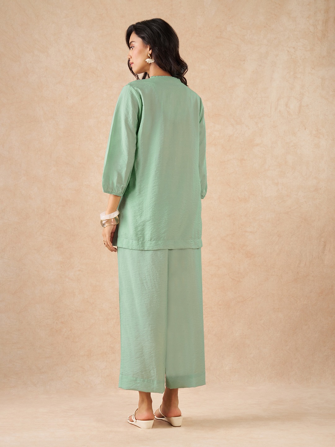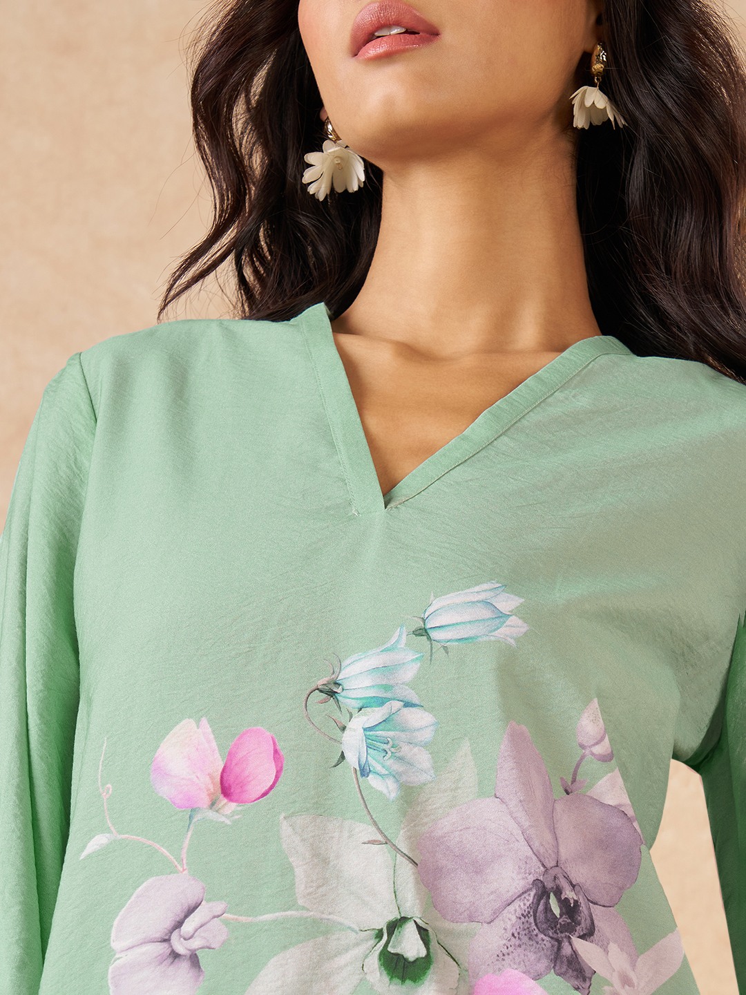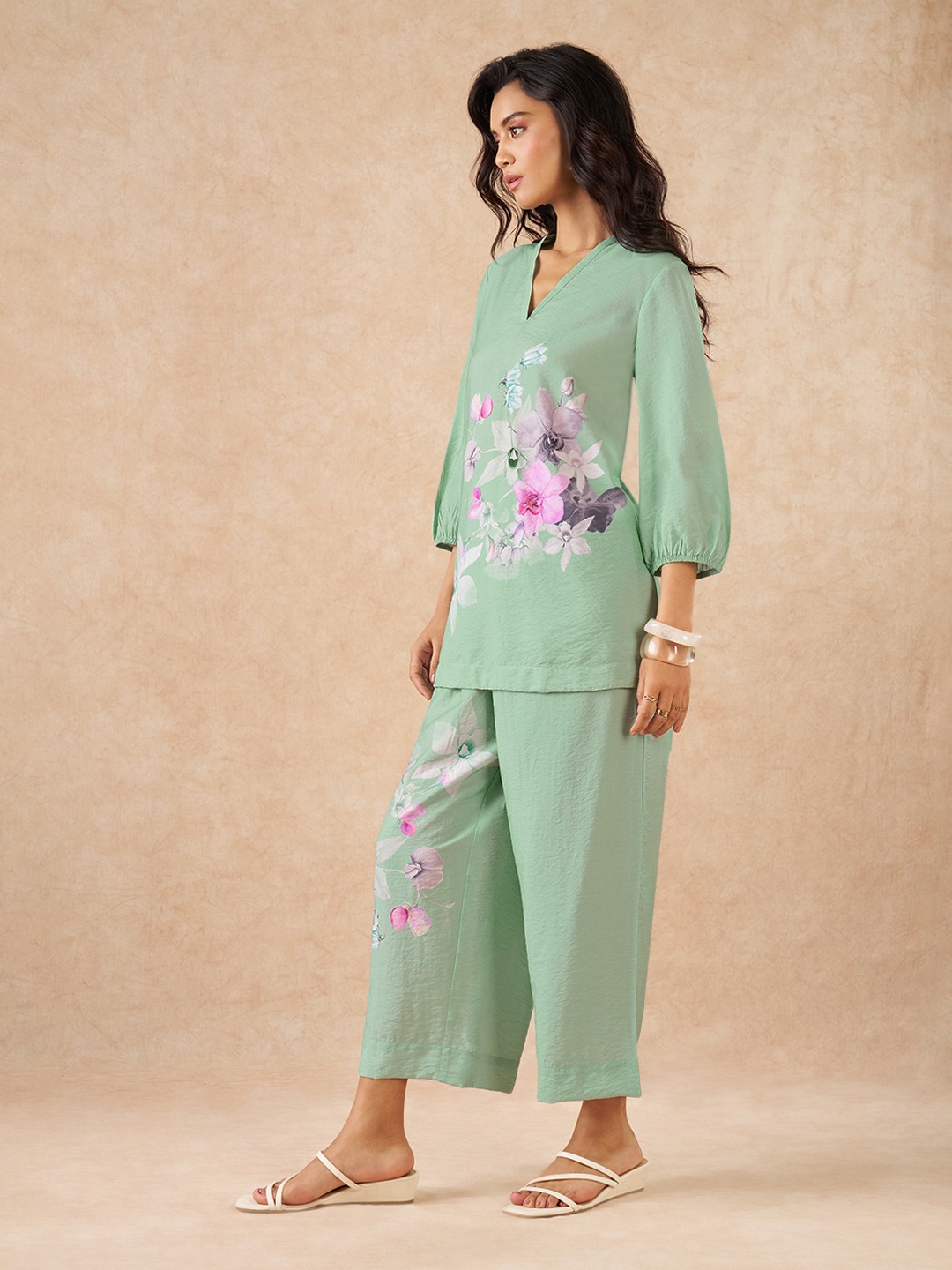 This serene tunic set is from our Water Orchid collection. Featuring fluid silhouettes crafted in a delicately hammered fabric with a soft crinkled texture, the collection is defined by gentle pastel hues and subtle light play, expressing a calm femininity and understated elegance that transitions seamlessly from day to evening. The set features a relaxed V-neck tunic with softly gathered 3/4 sleeves, paired with wide leg pants finished with an elasticated waist and placement floral prints along the leg, both rendered in a fluid viscose-nylon that drapes lightly with a refined sheen.