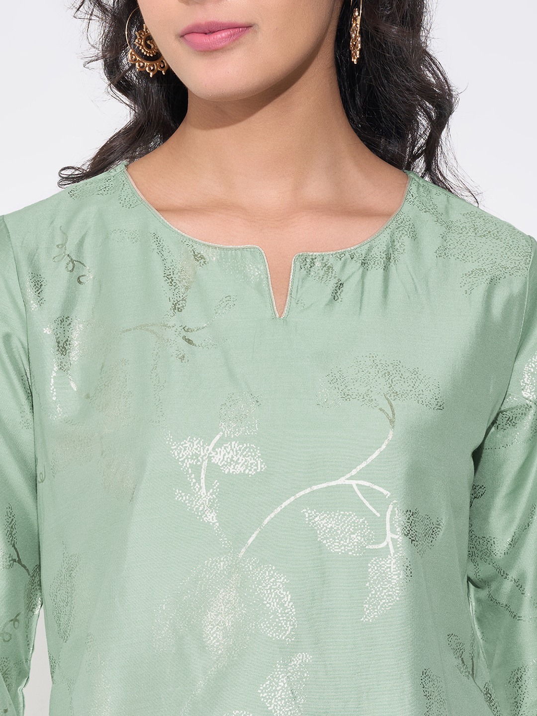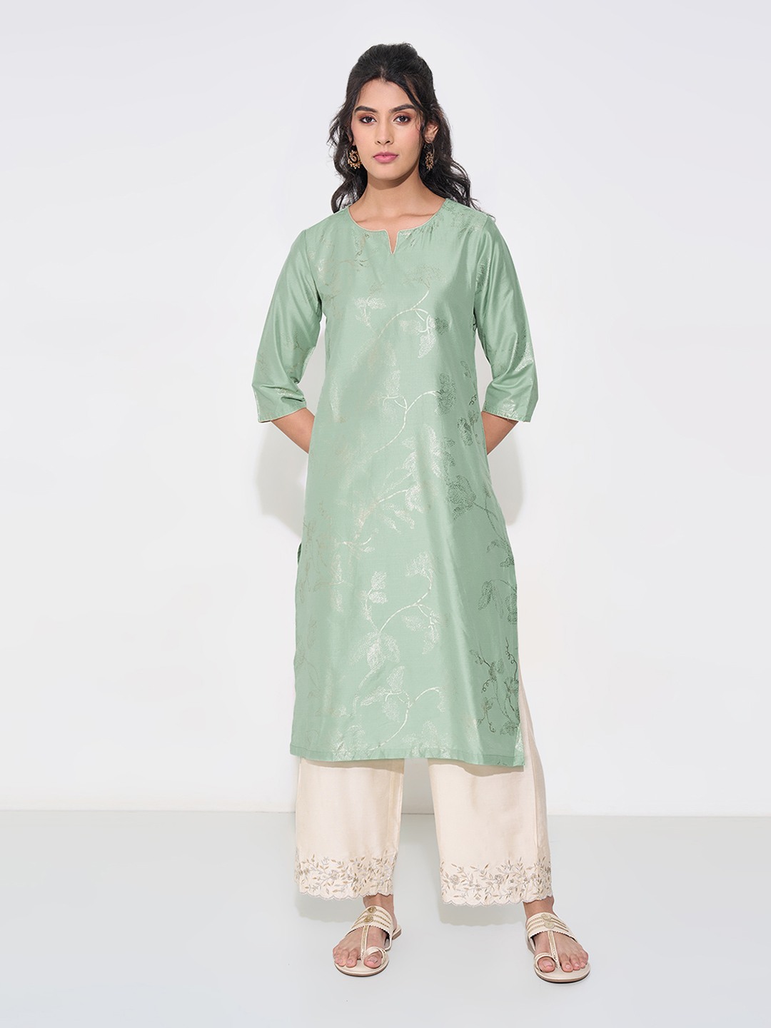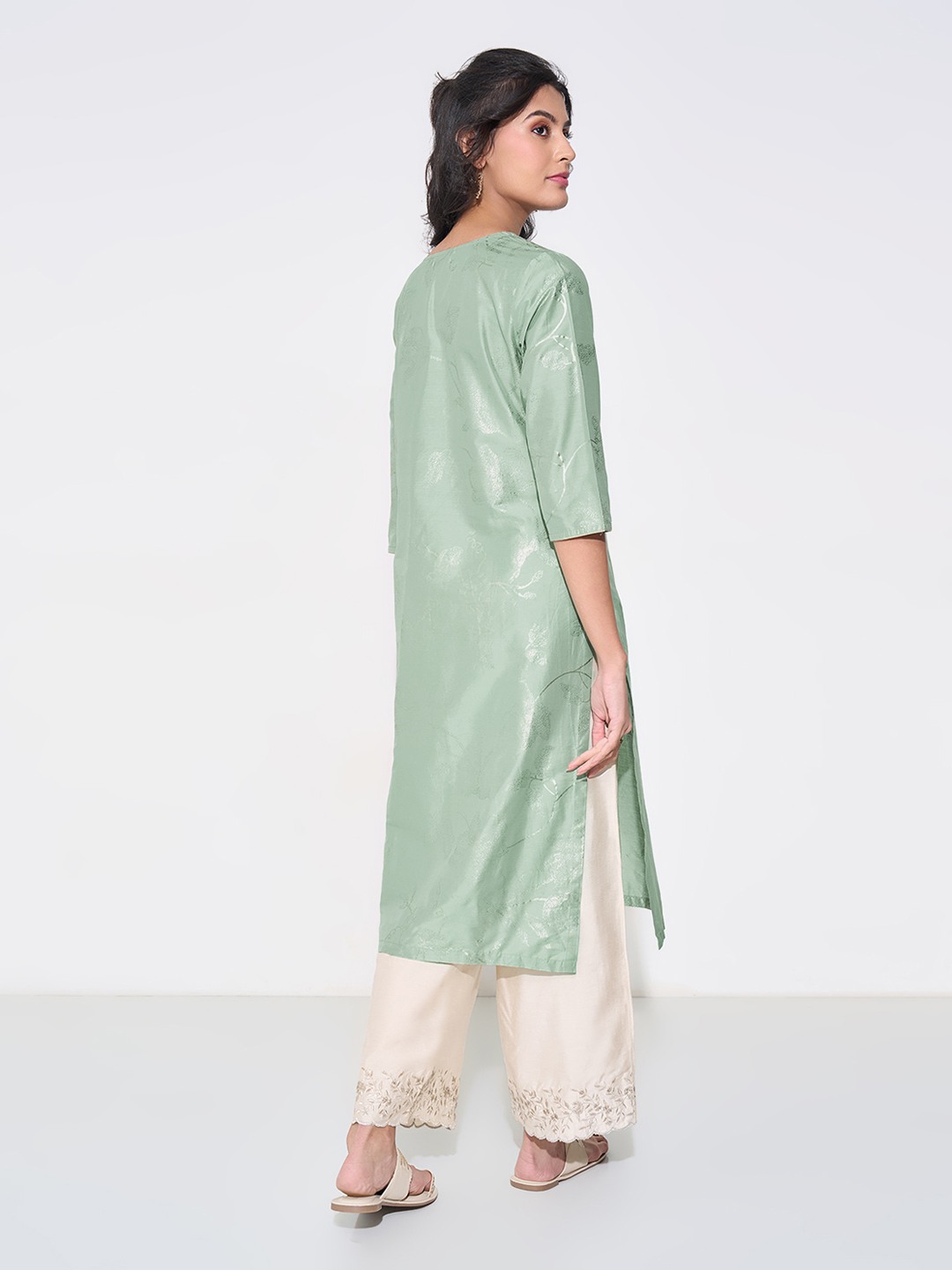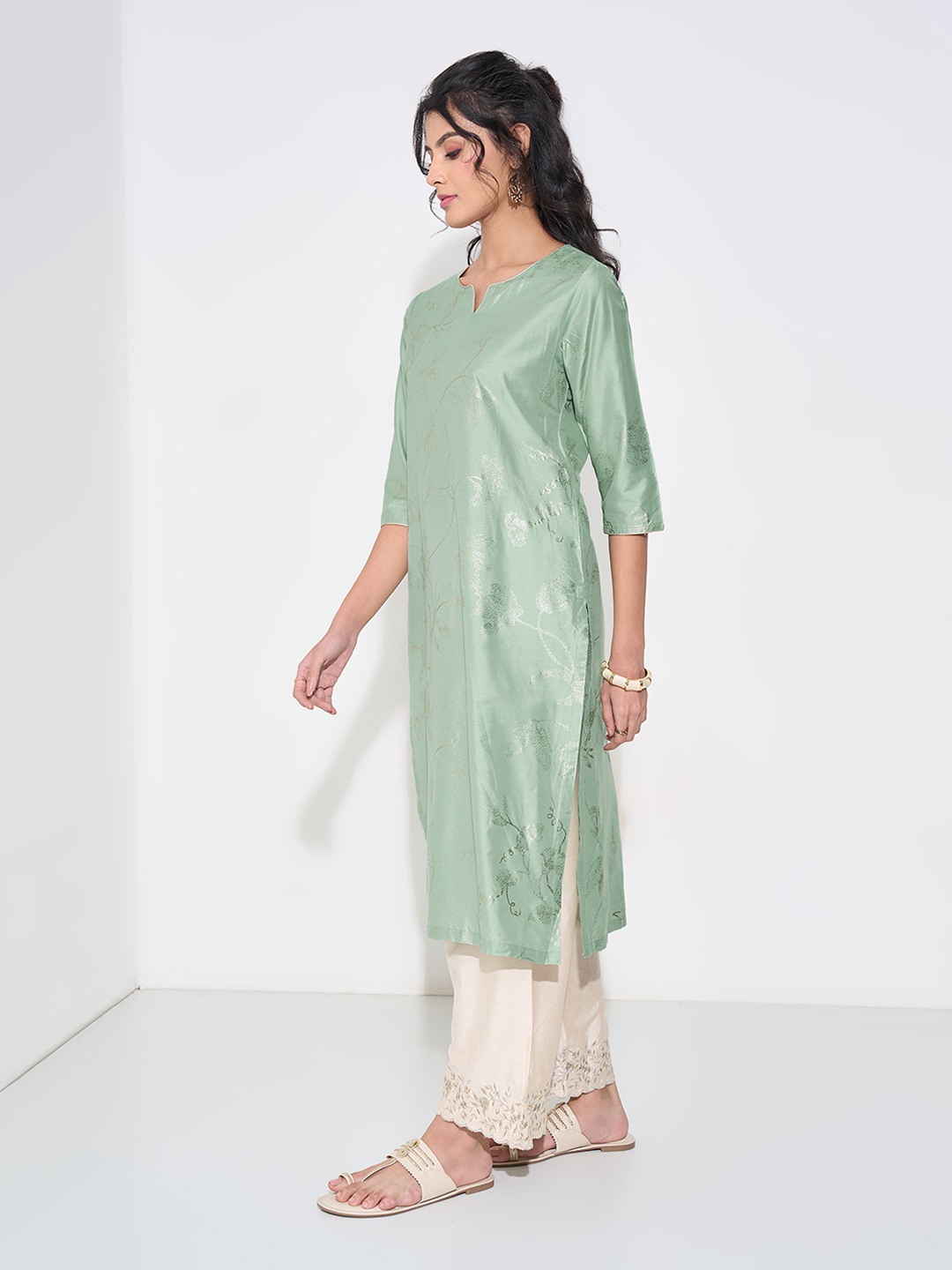 An understated yet luminous piece, this kurta shines with a soft mint hue and delicate foil print motifs. The easy silhouette is framed with 3/4 sleeves and a neat split neckline, lending quiet sophistication to its design. Its fluid woven structure adds just the right touch of festive polish.