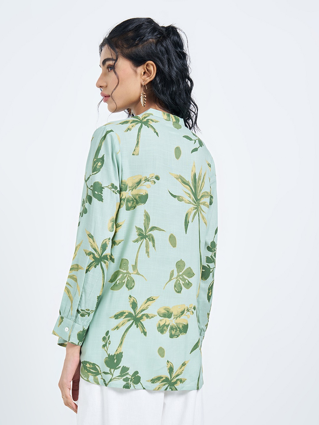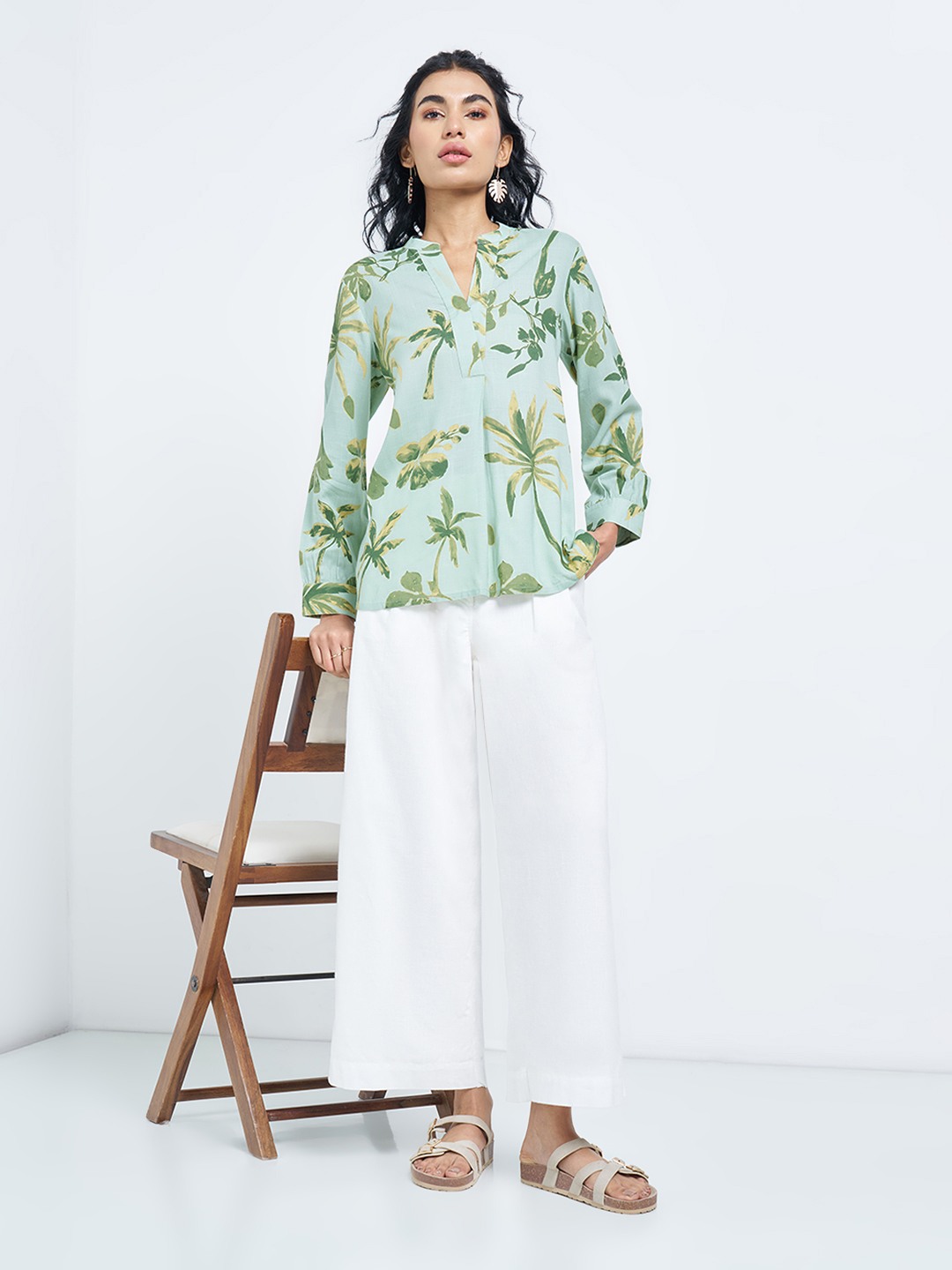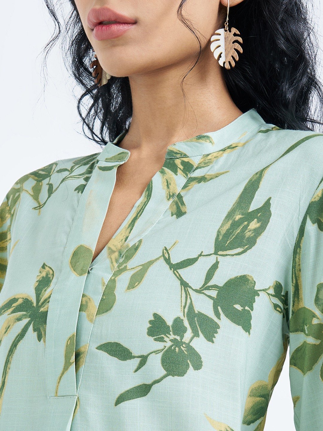 Watercolour prints soften this clean, everyday silhouette. Designed with a split neckline and 3/4 sleeves, this tunic features an all-over palm print on a crisp base with a relaxed fall through the body. Easy yet polished, it brings a fresh, contemporary lift to casual dressing.