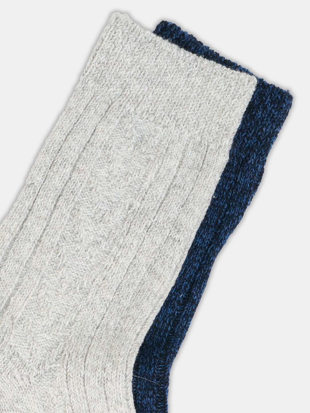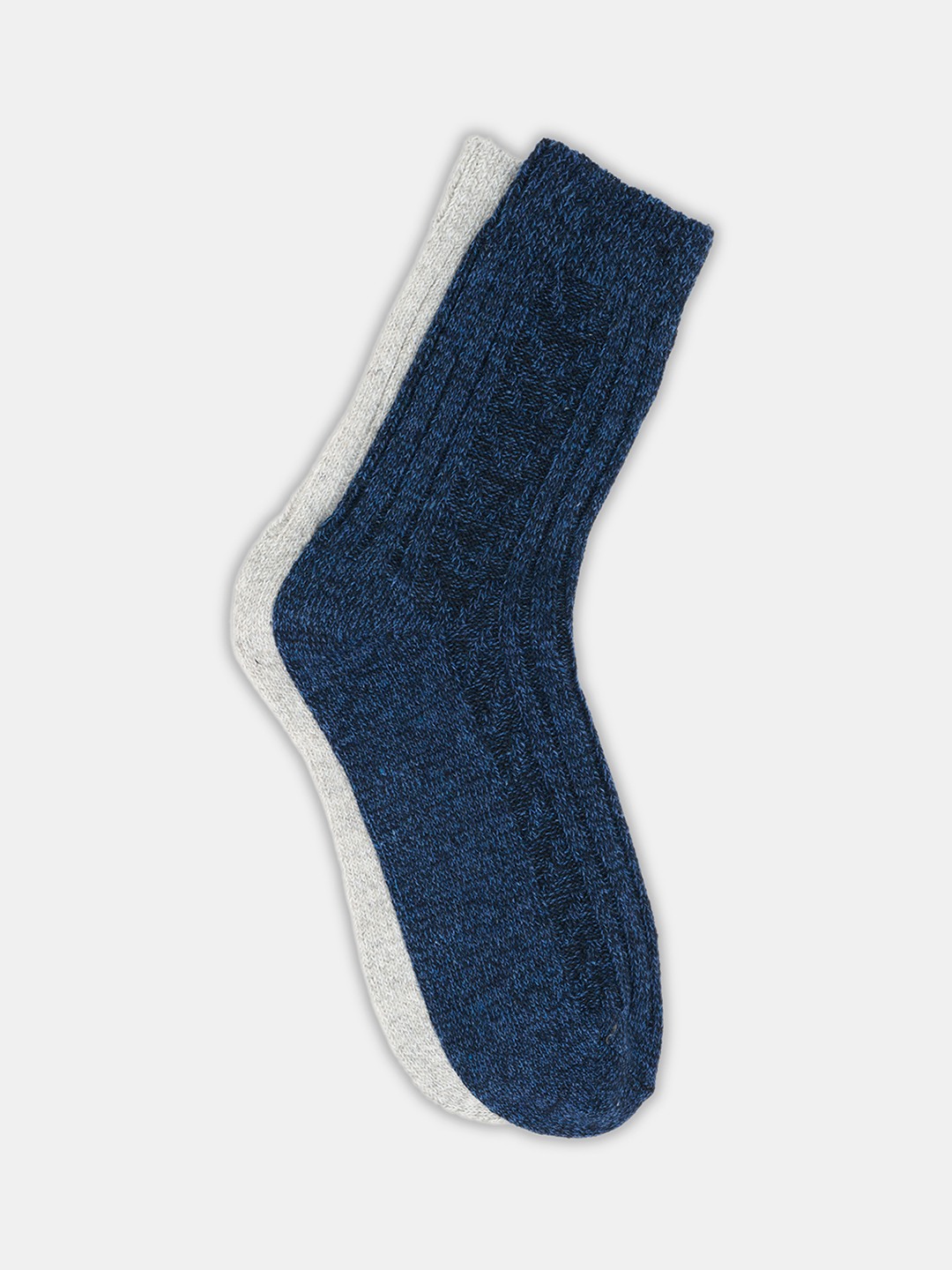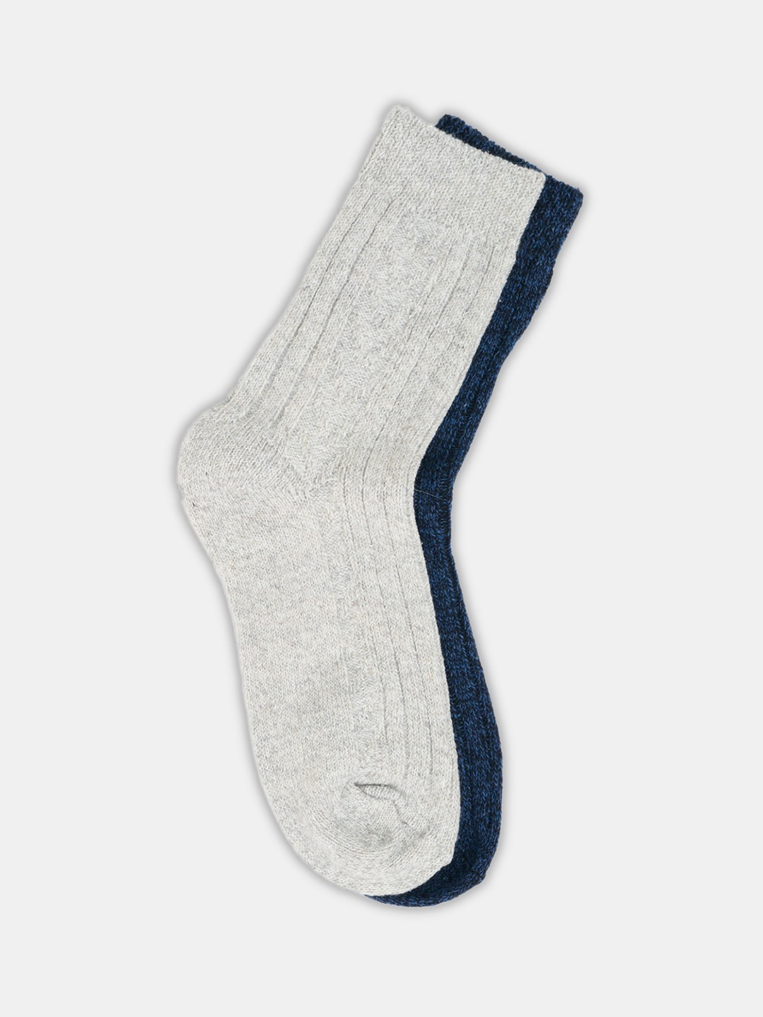 Crafted for cosy comfort, these winter socks bring warmth and texture together in a refined rib-knit design. The set includes navy and light grey pairs, each featuring a subtle woven pattern that enhances grip and insulation. Made from a soft, thick knit that keeps your feet toasty in cooler weather.