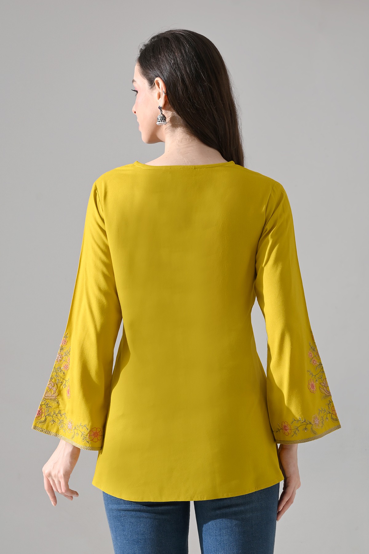 This mustard embroidered straight top features a v-neck, long sleeves, and a straight hemline. with its chic and contemporary design, it is perfect for both casual and semi-formal occasion