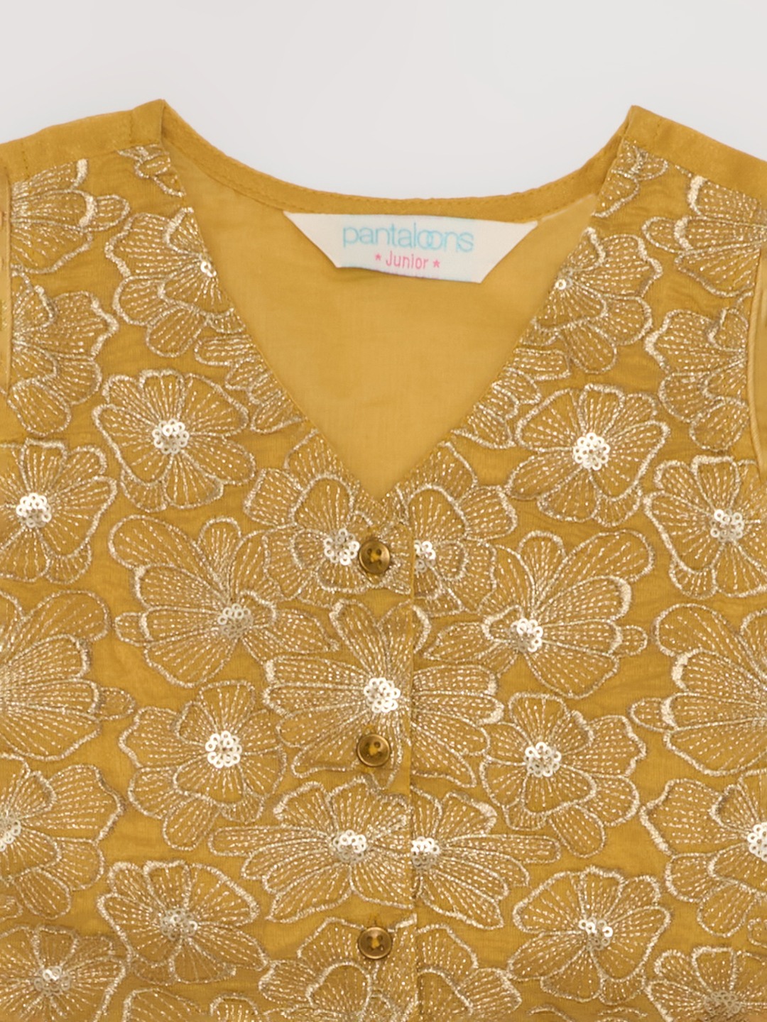 Home/Lehengas/Akkriti By Pantaloons/mustard embroidered waistcoat & foil print ghargra set