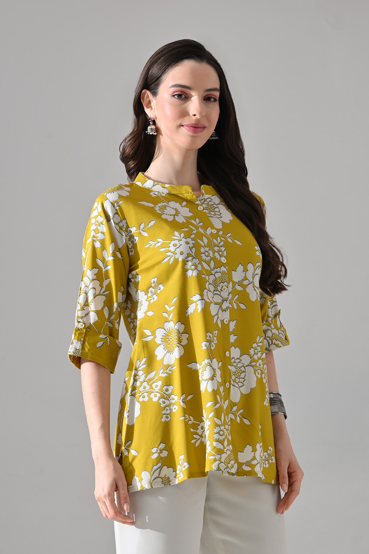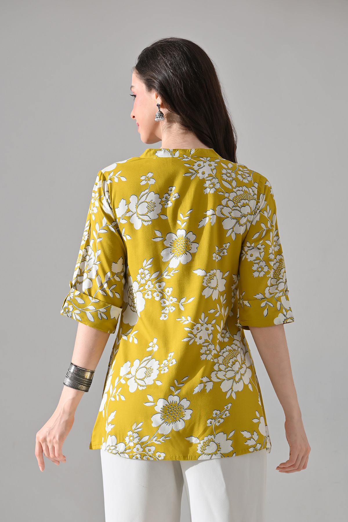 This Mustard Printed Kurti features a mandarin collar, short sleeves, and a straight hemline with stylish multi slits. Designed with chic and contemporary appeal, it’s a versatile piece—perfect for both casual outings and semi-formal occasions