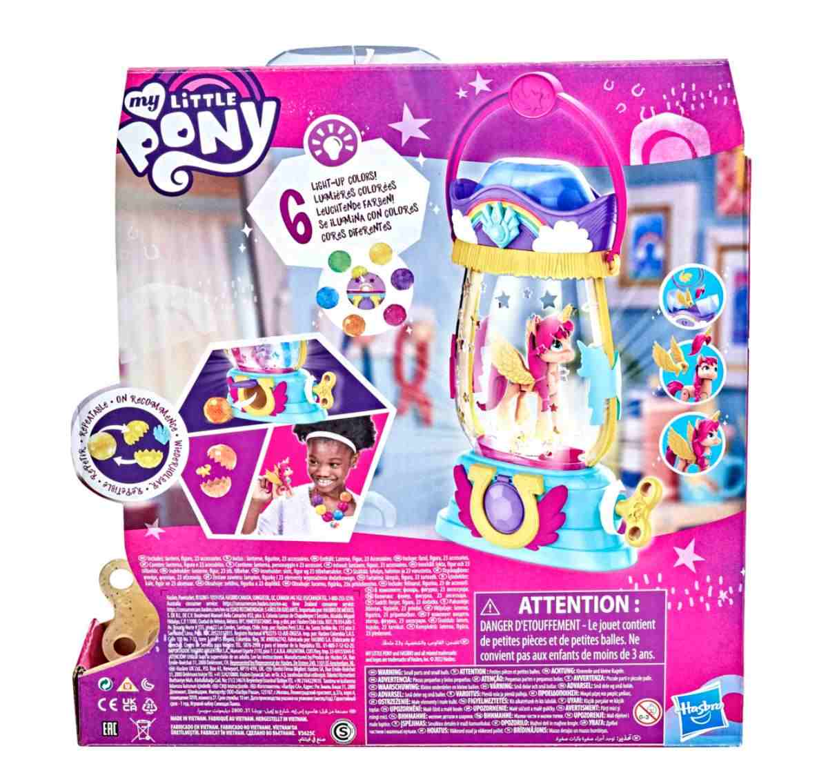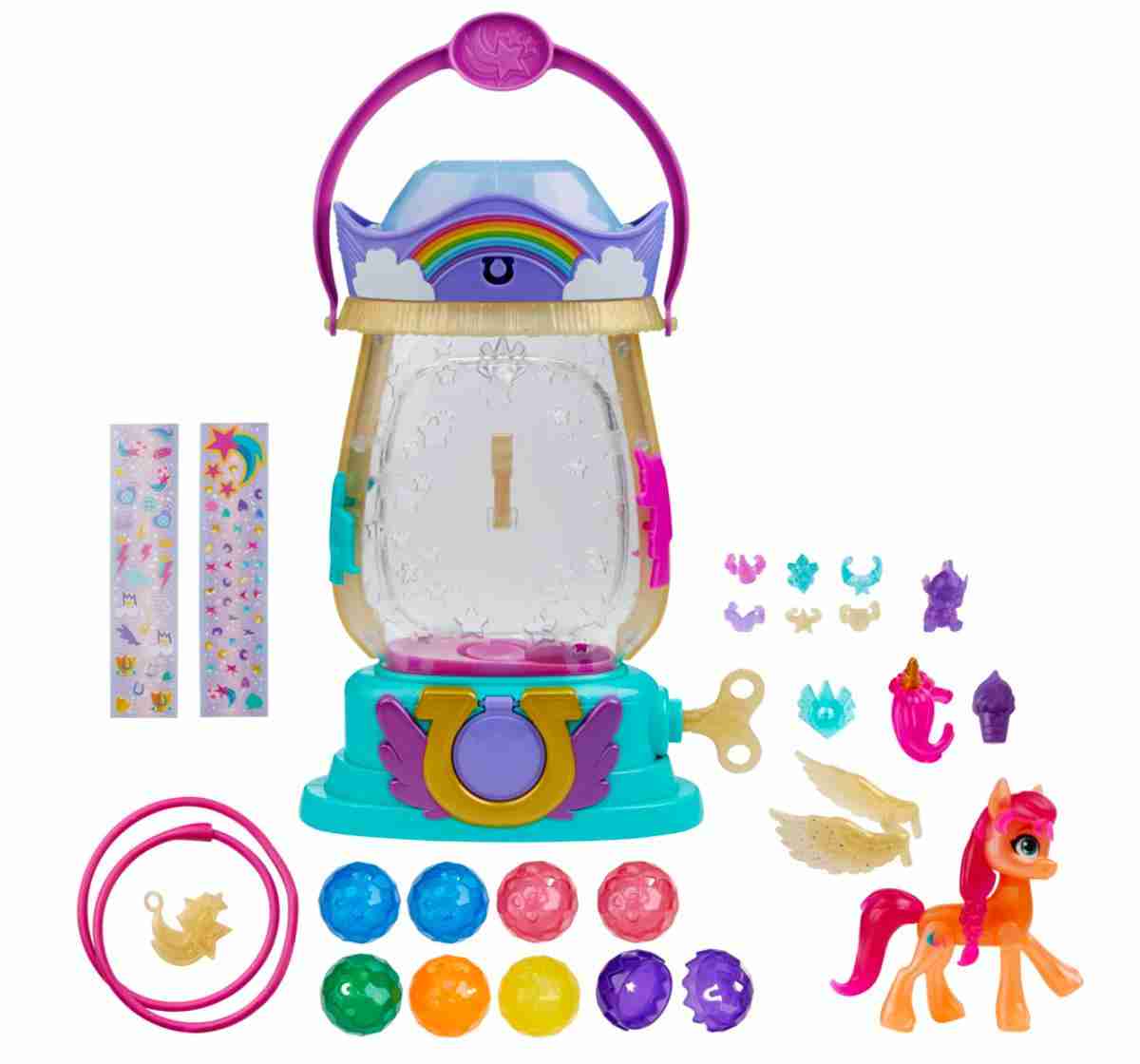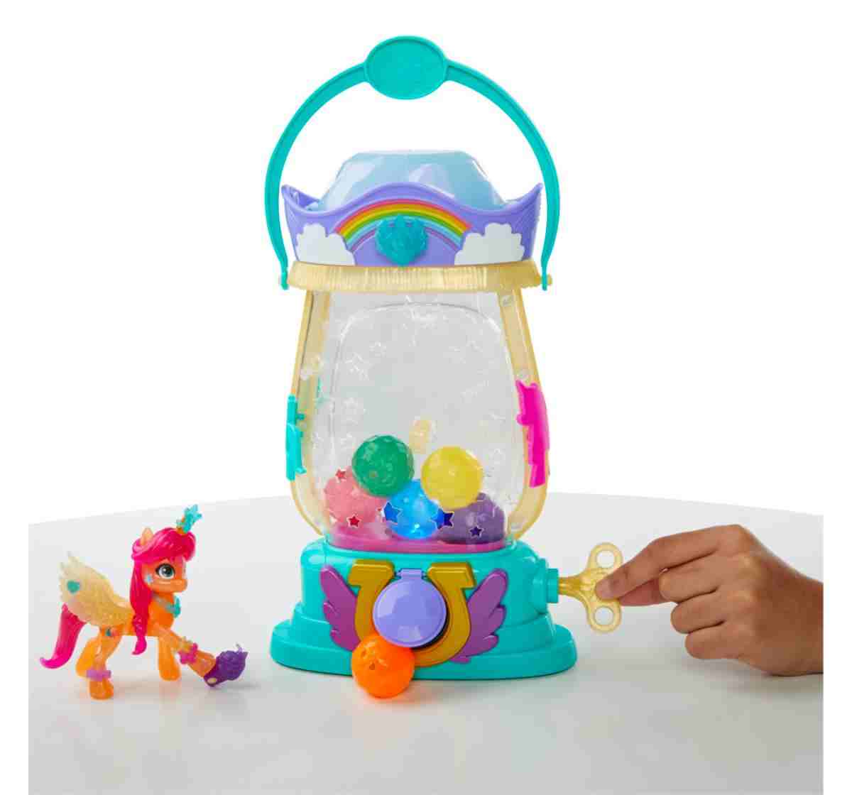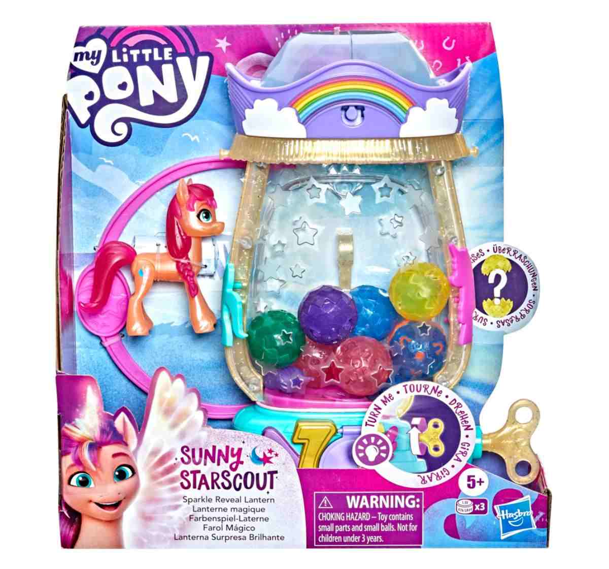 Get to know Sunny Starscout: an Earth Pony from Maretime Bay! Sunny is curious, adventurous, and determined to make the world a better place. Discover a light-up surprise with Sparkle Reveal Lantern Sunny Starscout. Inspired by the My Little Pony: A New Generation movie! Includes a 3-inch Sunny Starscout orange pony figure with a character-inspired shooting star Cutie Mark on one side. Figure is poseable with plastic pink hair in her signature braid style. Twist the key on the lantern (colors may vary) to see it light up and dispense crystal-shaped containers. There are surprise accessories hidden inside each container, and in the top of the lantern! Place the crystal-shaped containers over the lantern light to change the color of its glow - 6 different colors! Fans new and old can imagine adventures with My Little Pony movie-inspired toys. Makes a great holiday or birthday gift for kids ages 5 years old and up!