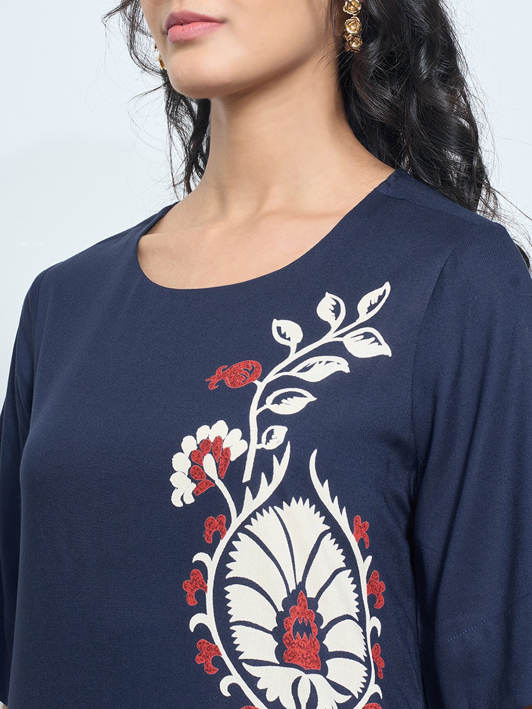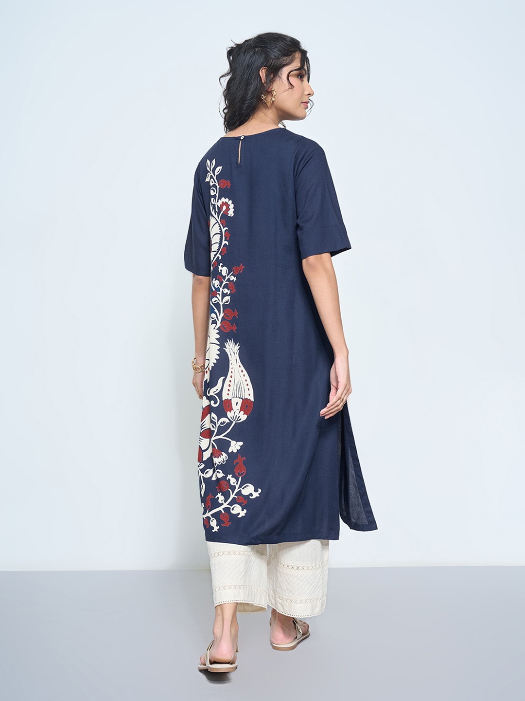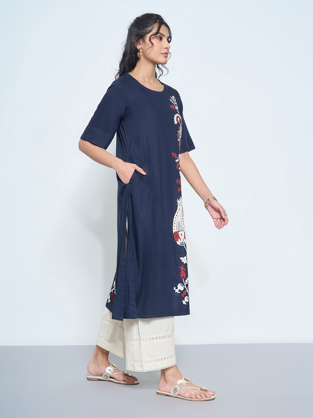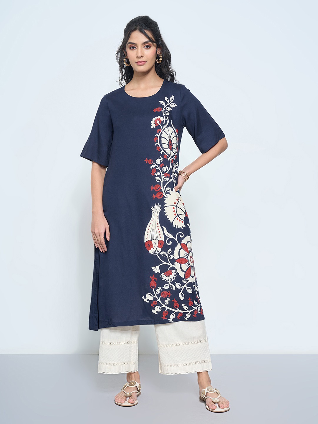 Refreshing and effortless, this kurta showcases a large-scale floral placement print in contrasting tones. Designed with a round neckline, elbow-length sleeves, and side slits for easy movement. The soft woven fabric drapes fluidly, offering everyday comfort with a touch of artistry.