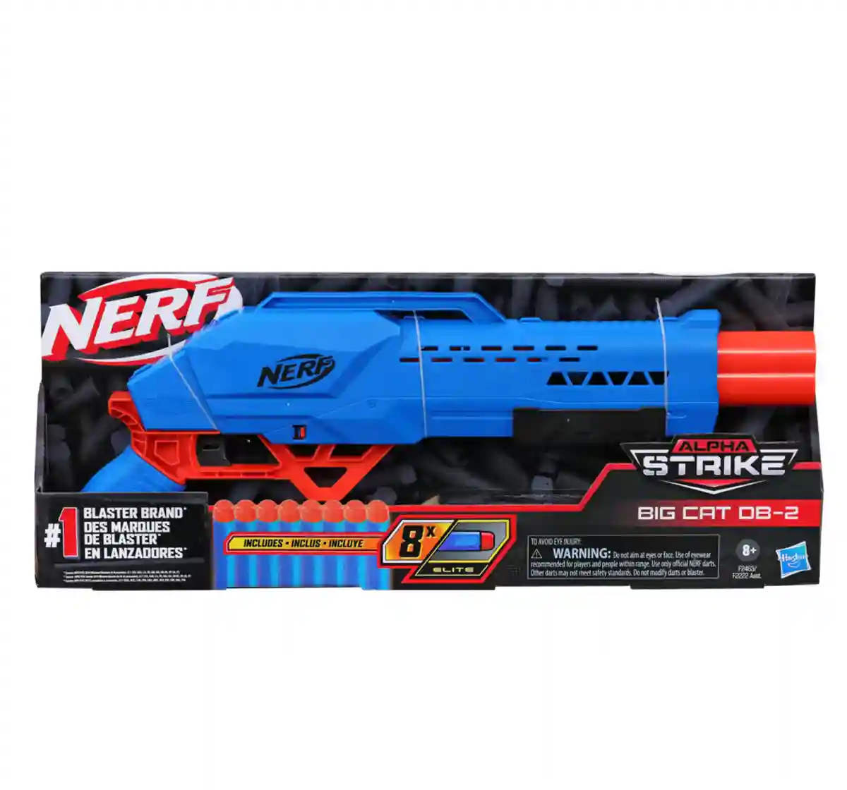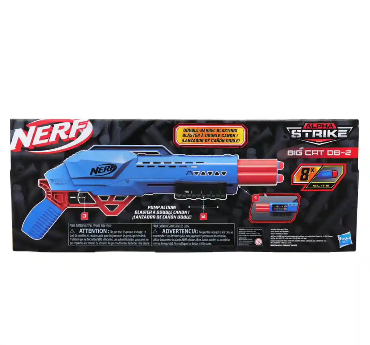Start blasting with Alpha Strike blasters from Nerf, the number one blaster brand*! The Nerf Alpha Strike Big Cat DB-2 blaster features double-barrel blasting -- fire 2 darts in a row! To fire, open the breech on the side of the blaster and load 2 darts inside, close the breech, pump the priming handle, and press the trigger to fire 1 dart. Includes 8 Official Nerf Elite darts for multiple reloads. If you’re new to the Nerf brand, Alpha Strike blasters are an awesome way to get into adrenaline-pumping Nerf battles and experience the power and performance of the Nerf brand. They’re easy to use so first-time battlers can begin blasting fast. And if you’re already a Nerf fan, these blasters make great additions for your Nerf collection! No batteries required. Eyewear recommended (not included). *Source: NPD POS Full Year 2019 Blasters/Shooters & Accessories, G11 (US, AUS, CA, FR, GM, MX, BR RS, SP, UK, IT) Nerf and all related properties are trademarks of Hasbro.