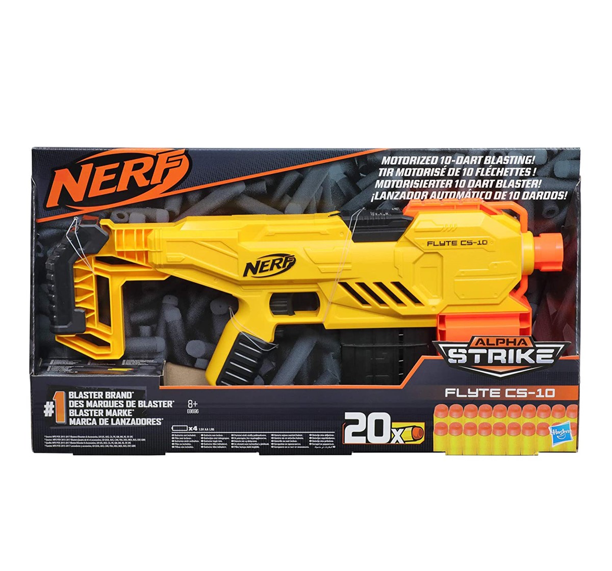 Start blasting with Alpha Strike blasters from NERF, the number one blaster brand! | If you’re new to the NERF brand, Alpha Strike blasters are an awesome way to get into adrenaline-pumping NERF battles and experience the power and performance of the NERF brand. They’re easy to use so first-time battlers can begin blasting fast. And if you’re already a NERF fan, these blasters make great additions for your NERF collection! | It comes with a 10-dart clip, so you can unleash 10 darts in a row before you need to reload. And this motorized blaster comes with 20 Official NERF Elite darts, so you have 10 for the clip, and 10 for reloads | Official NERF Elite darts are tested and approved for performance and quality and constructed of foam with a flexible, hollow tips.