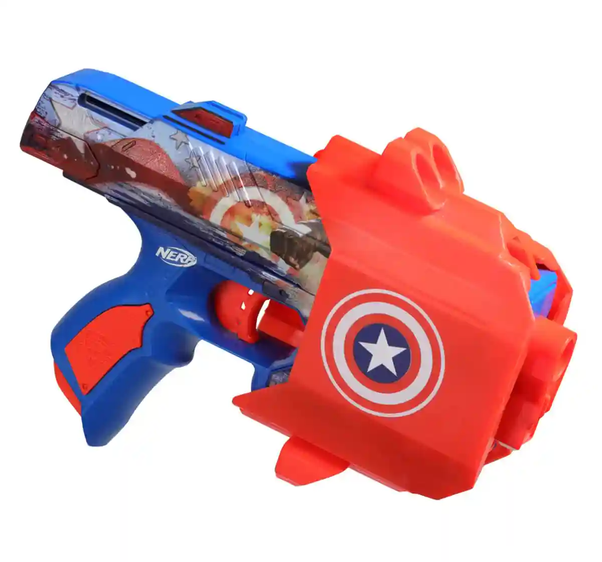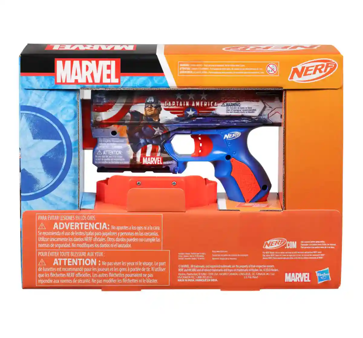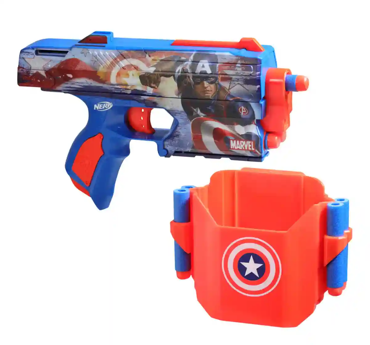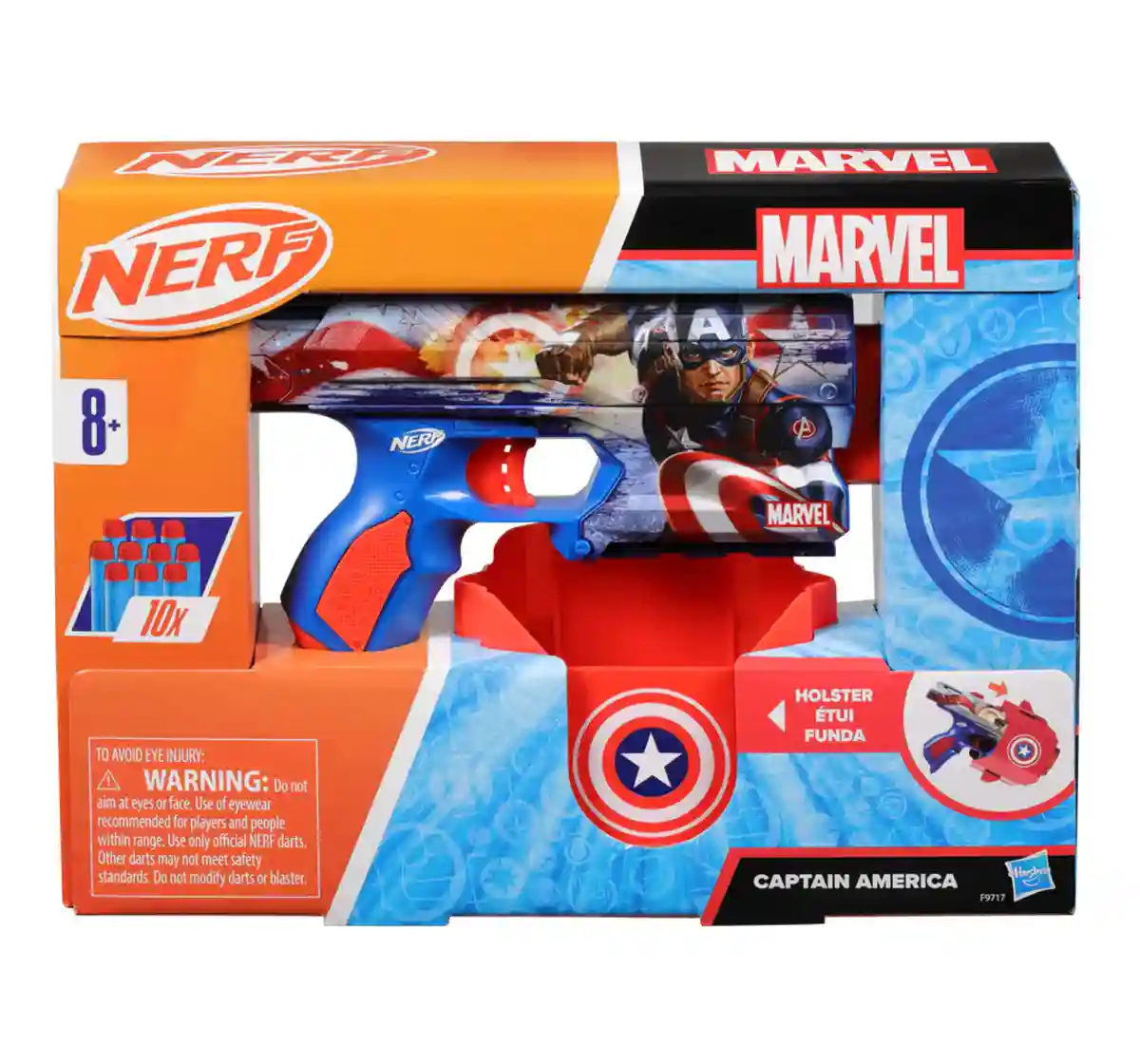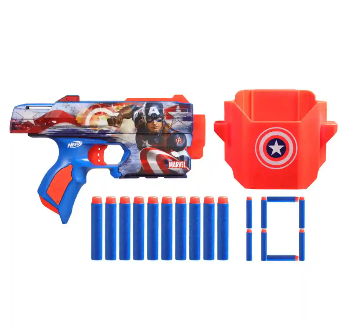 The Nerf Marvel Captain America dart blaster is fully decorated on both sides with big, bold Captain America designs! With its eye-catching looks and easy-to-use design, the blaster is a superhero in Nerf outdoor games. It comes with 10 Nerf Elite foam darts for multiple reloads. It includes a clip-on holster with Captain America deco, allowing you to keep the blaster by your side as you launch into indoor and outdoor play. The holster has onboard storage for 4 darts for fast reloading. You're ready for action in 3 simple steps: Front load 1 dart into the barrel, pull back the priming slide and pull the trigger to fire. Nerf blasters are great toys for 8 year old boys and girls and up to enjoy fun, active indoor and outdoor play. Eyewear recommended (not included). Nerf accessories each sold separately, subject to availability. No batteries required. Copyright 2022 Marvel Hasbro and all related terms are trademarks of Hasbro.