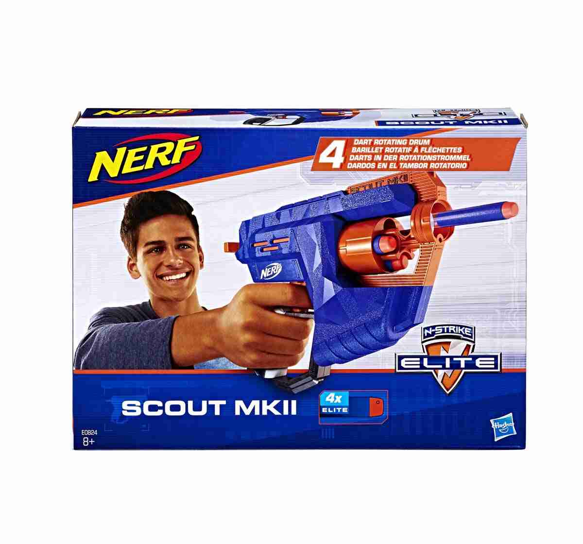 Scout out the competition and strike fast with the Nerf N-Strike Elite Scout MKII blaster! The rotating barrel holds 4 Nerf Elite darts and unleashes them 1 at a time. Load 4 darts into the front of the barrel, pull back the handle to prime the blaster, and pull the trigger to fire 1 dart. When the battle calls for mobility, grab the Scout MKII blaster to stay ready to act quickly as the action heats up. The Nef N-Strike Elite Scout MKII blaster comes with 4 Nerf Elite darts designed for distance.4-dart rotating drumIncludes 4 Nerf Elite darts designed for distanceFires 4 darts in a rowFALSEIncludes: blaster and 4 darts.