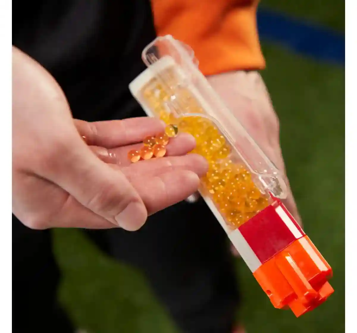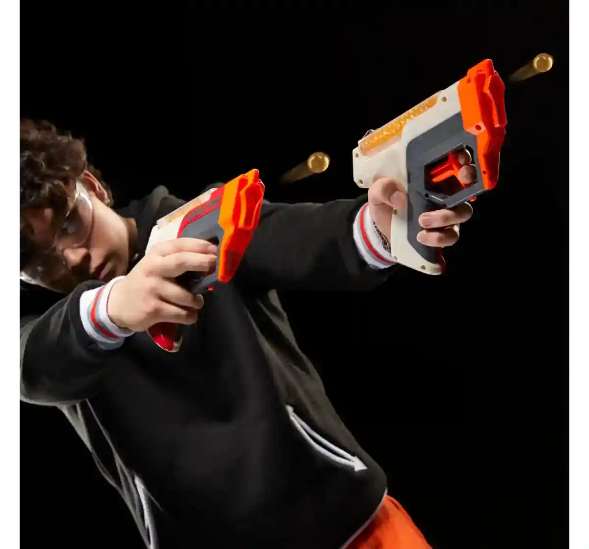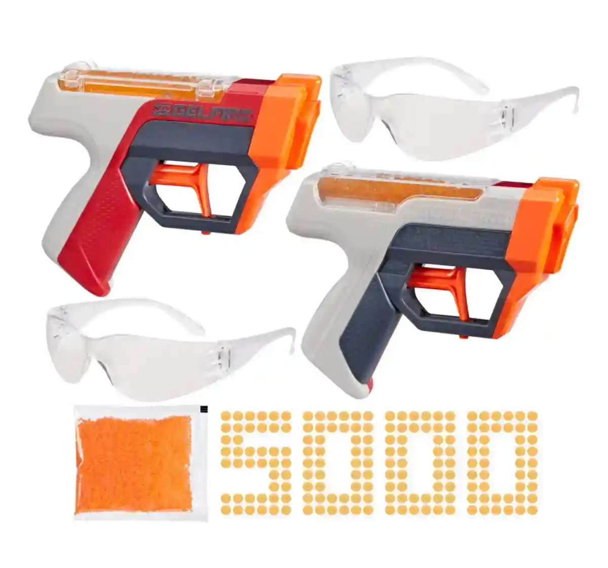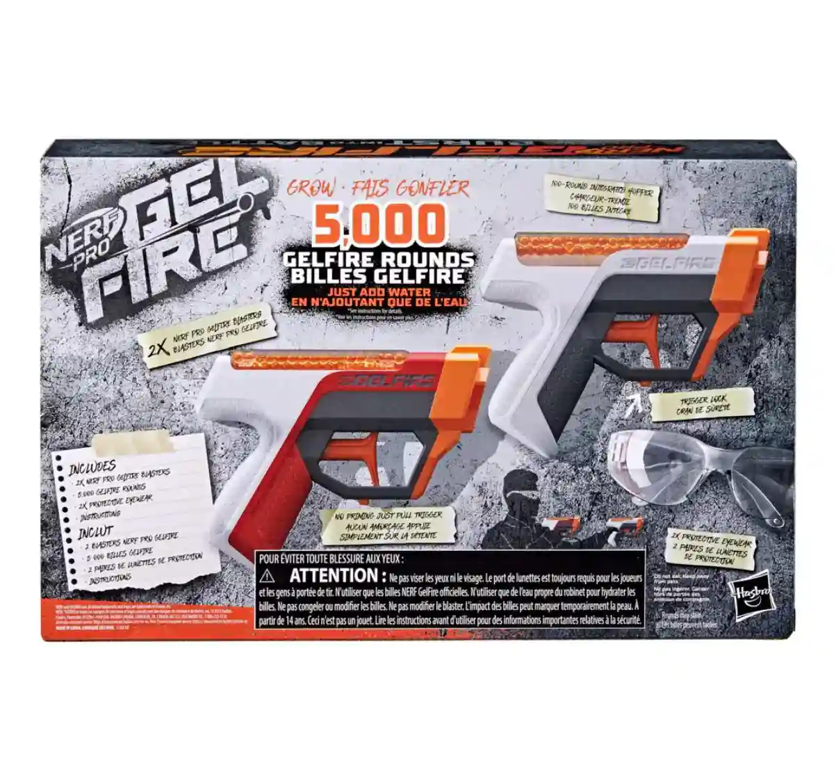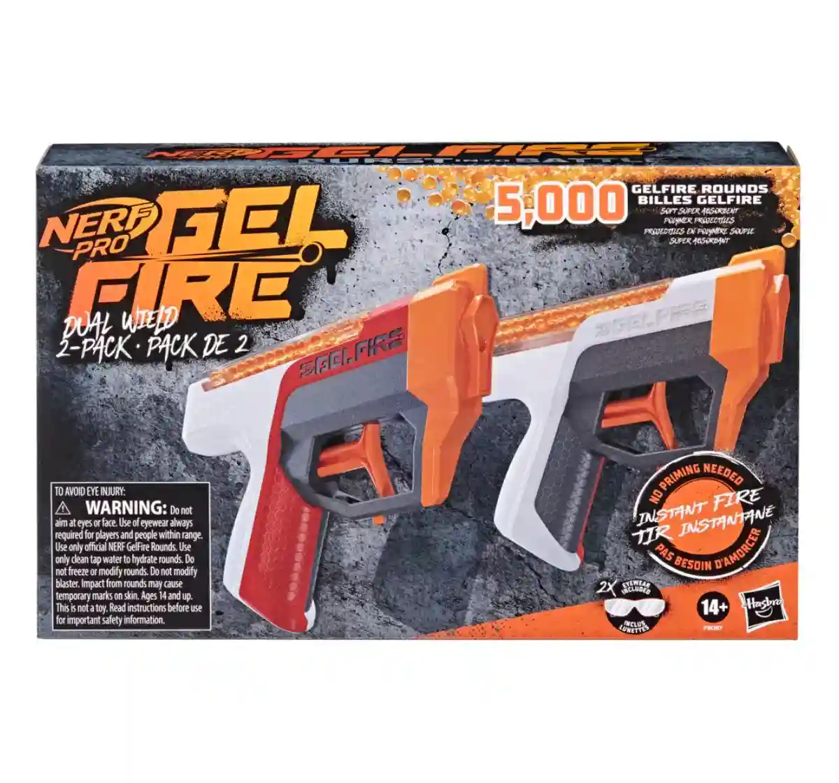 Burst into battle with Nerf Pro Gelfire blasters that deliver high-performance blasting and feature hydrated rounds that burst on impact! Nerf Pro Gelfire rounds come dehydrated in the box, add water to hydrate them. The hydrated rounds fire from the blaster at a high velocity and burst when they hit a target. No need to pick up rounds! The Nerf Pro Gelfire Dual Wield Pack includes 2 blasters that feature instant firing, no priming needed! Simply pull the trigger to fire rounds. You can hold and fire a blaster in each hand for a double-fisted battle advantage in competitive outdoor games. Fire as fast as you can pull the trigger! No batteries needed. Each blaster has a 100-round capacity integrated hopper for easy fill and high capacity. Includes 5,000 dehydrated Nerf Pro Gelfire soft super absorbent polymer projectiles, 2 pairs of protective eyewear, and trigger lock. The quality design provides durability for competitive Gelfire games. Outdoor use recommended. For ages 14 and up.