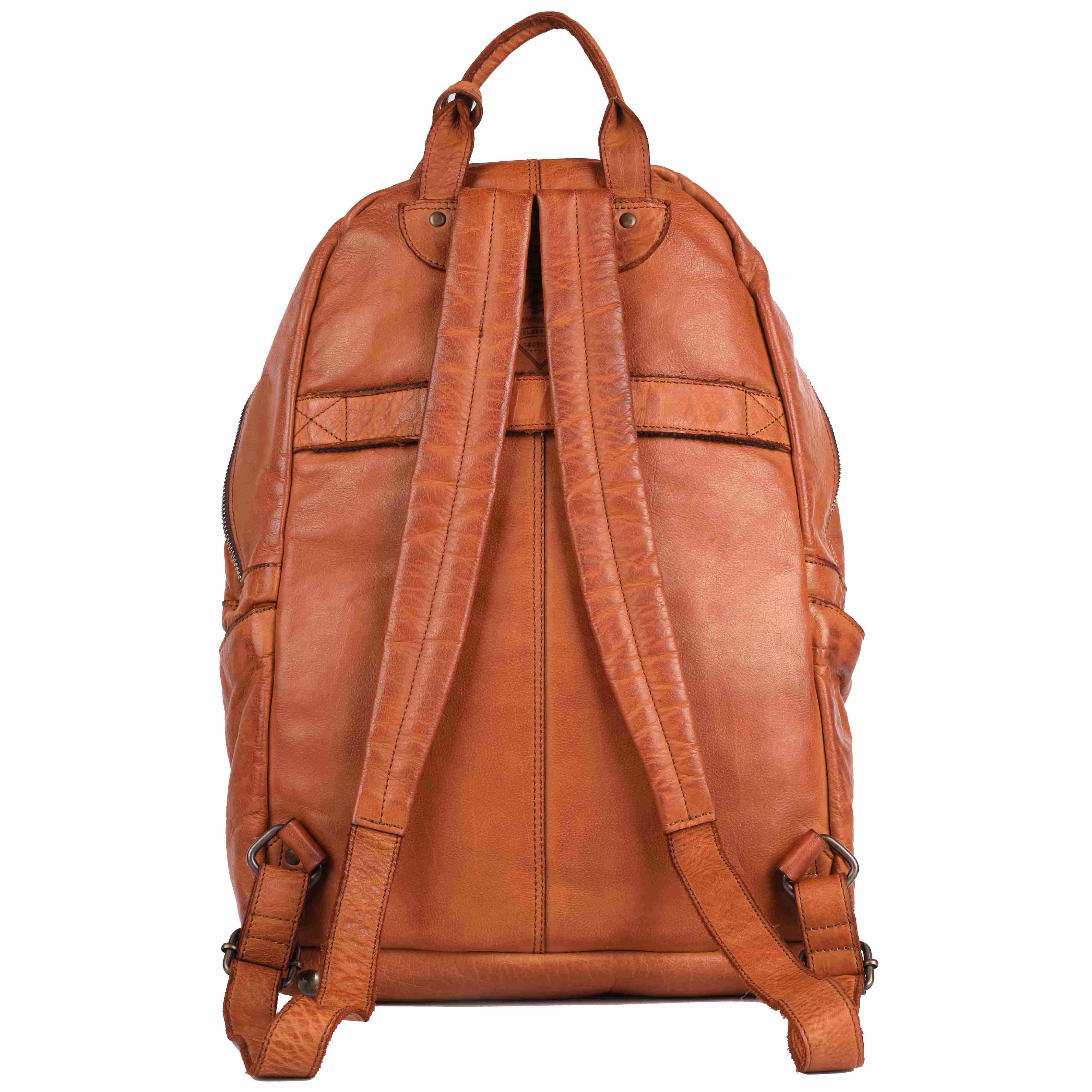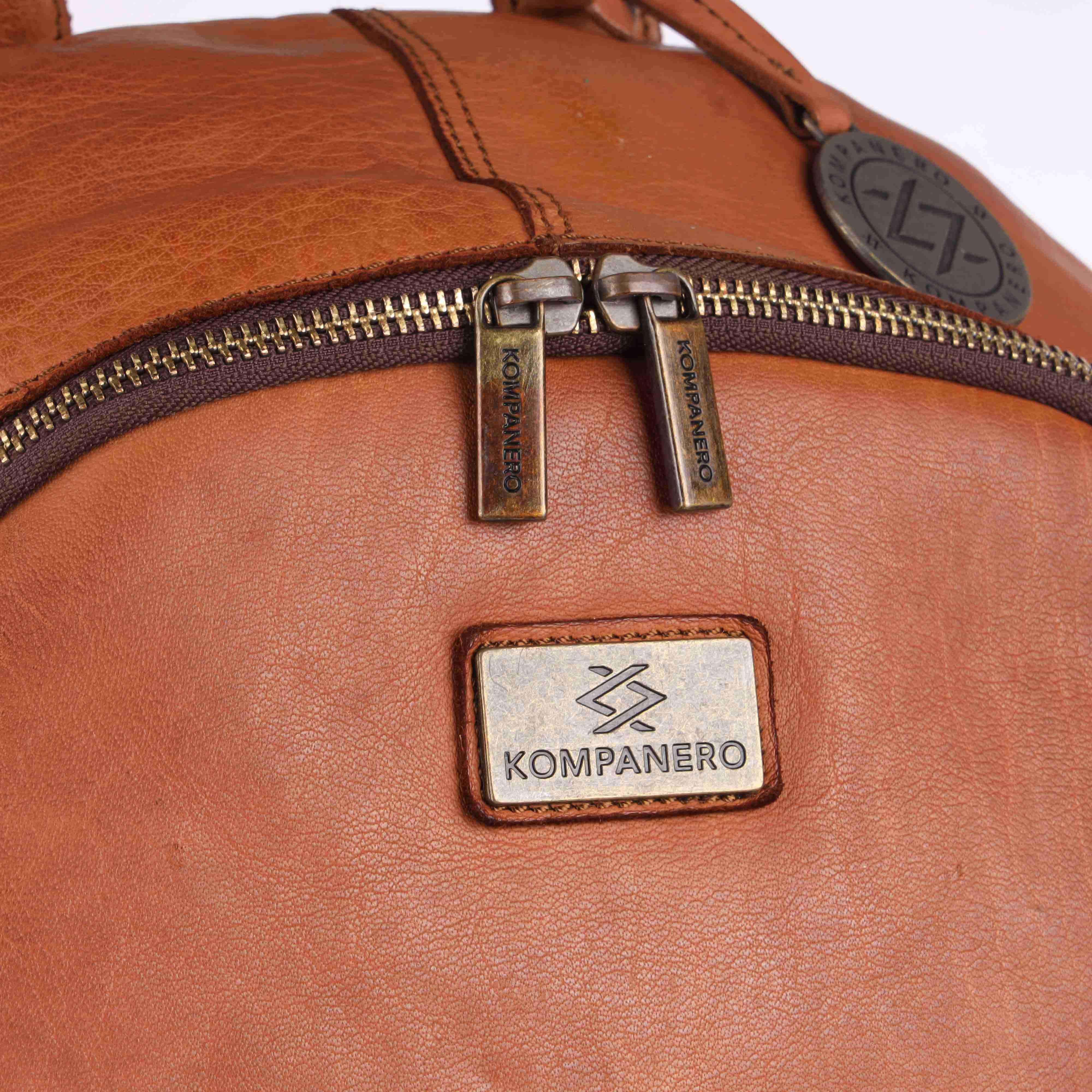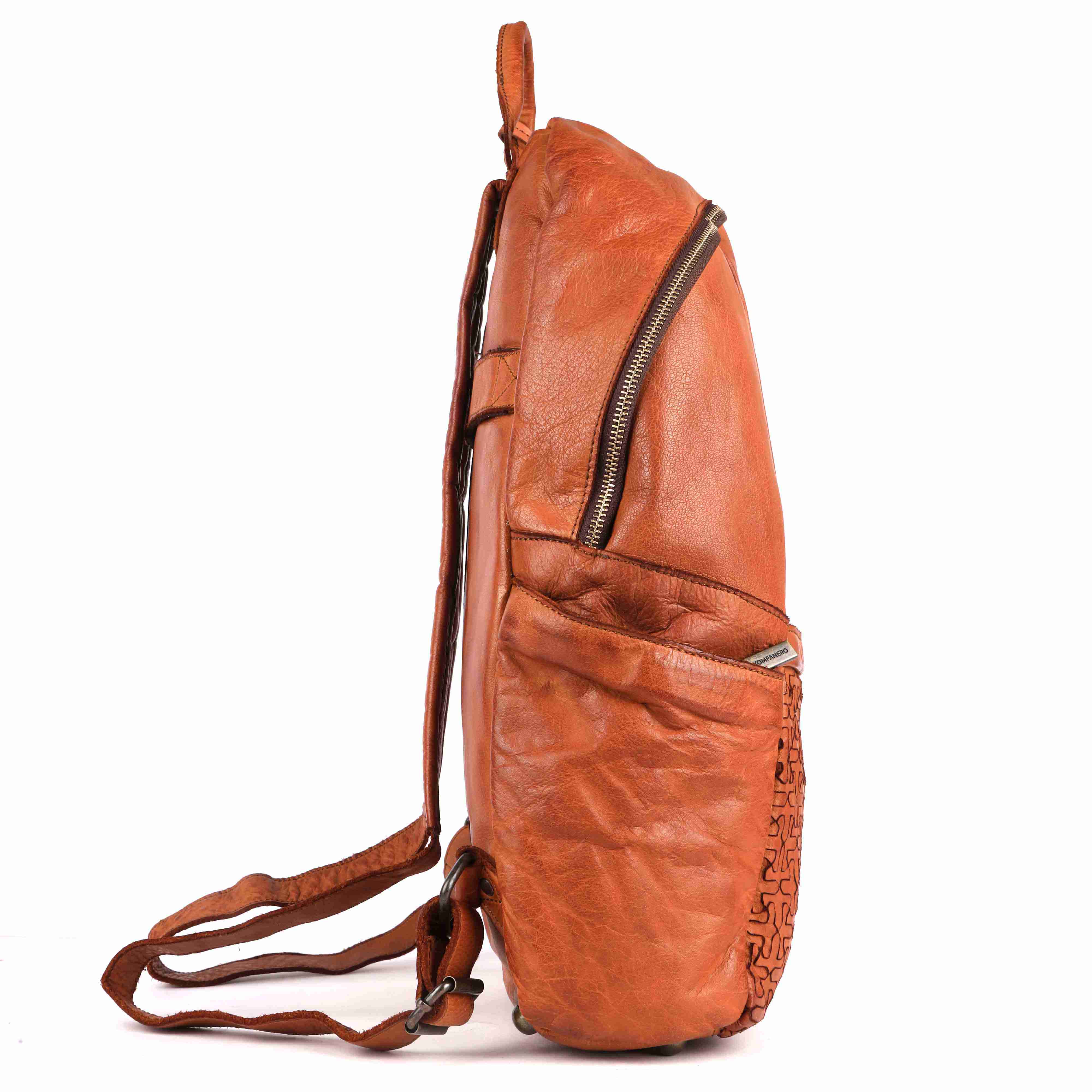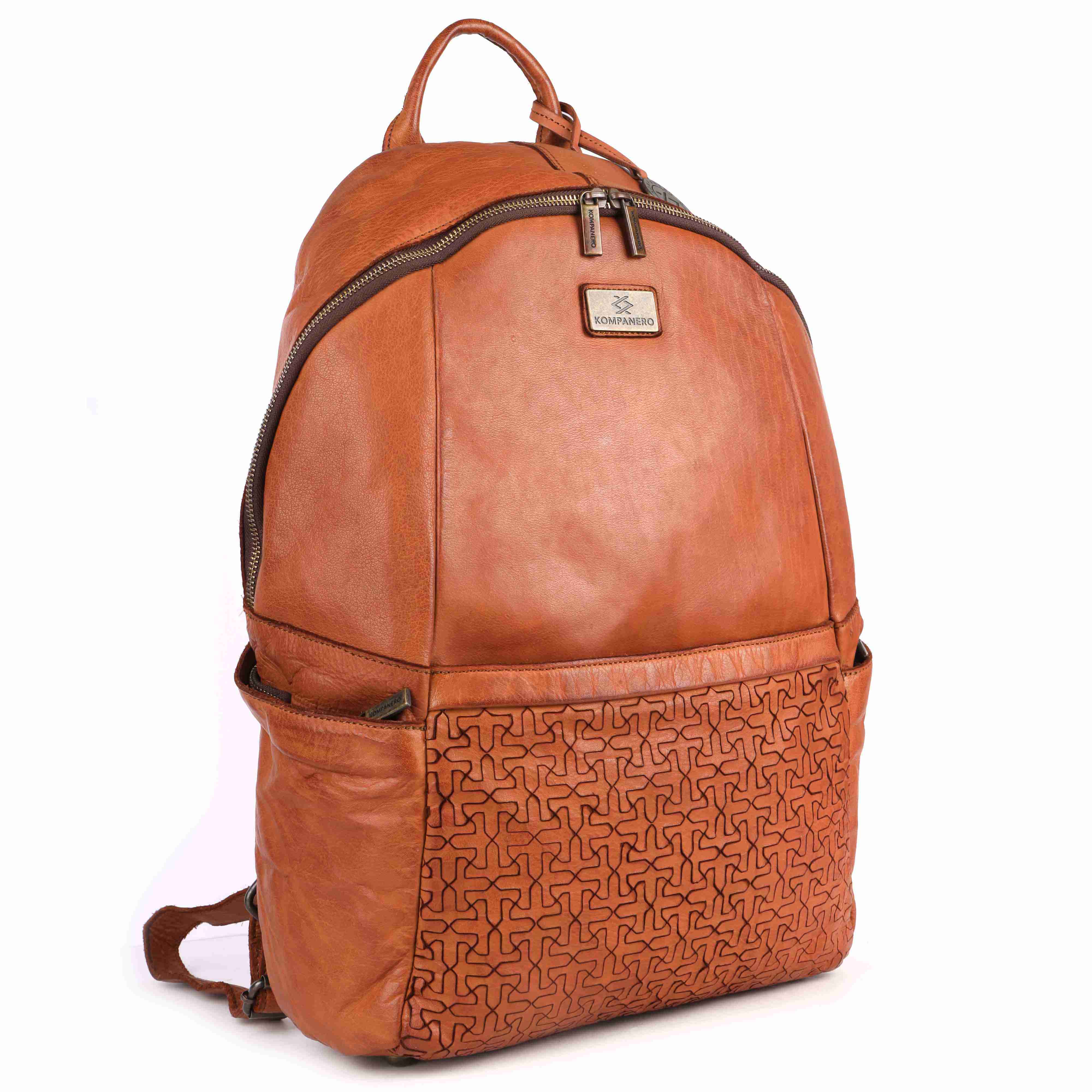 These bags are meticulously crafted from high-quality, vegetabletanned-leather in a warm cognac hue, offering a timeless and sophisticated appeal. The front features a carved, repeating pattern that adds texture and visual interest, embodying a blend of elegance and craftsmanship. The signature Kompanero metal logo is prominently displayed on the front, reinforcing its authenticity and brand heritage.