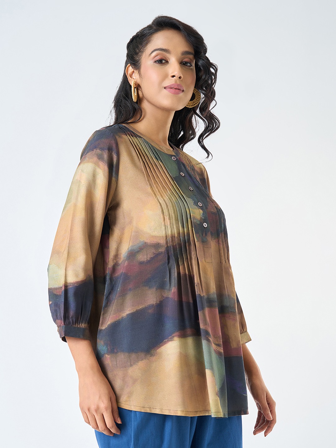 A painterly burst of ochre, rust, and indigo defines this fluid tunic that evokes hand-brushed artistry. Designed with fine pleats on the front and a soft flare, it features a band collar, half placket, and 3/4 sleeves with gathered cuffs. The smooth woven fabric drapes gracefully, lending movement and sophistication to your look.