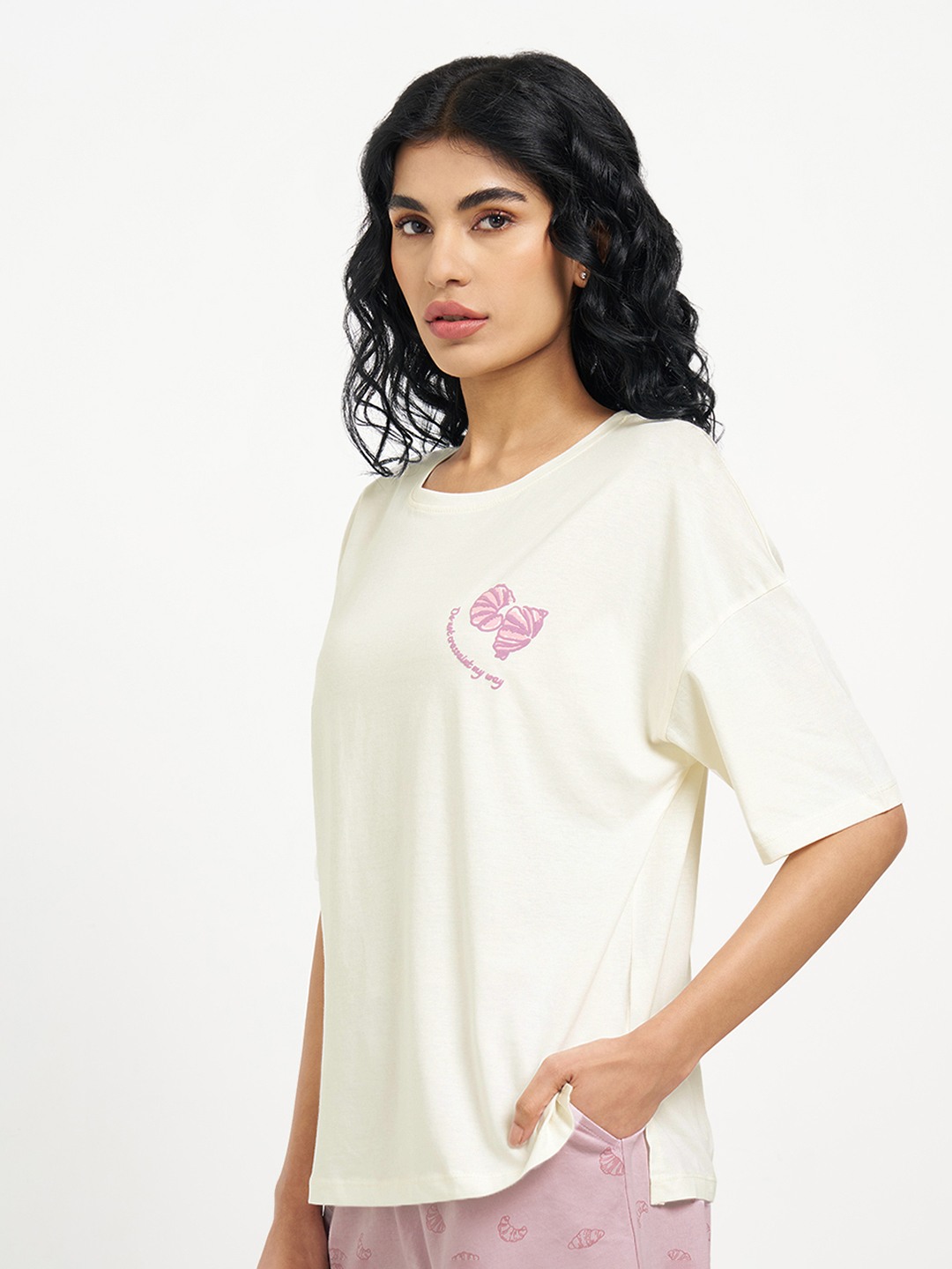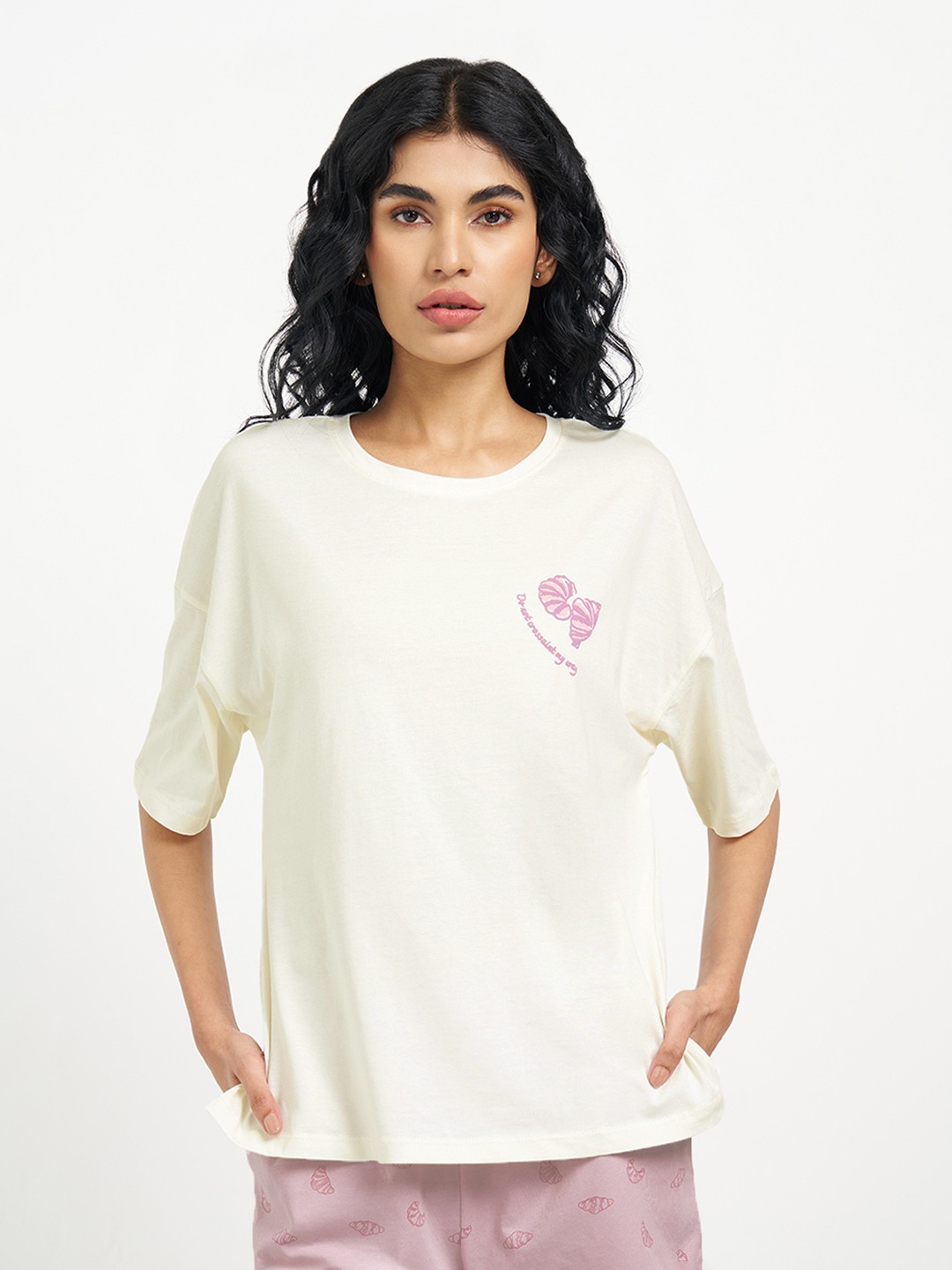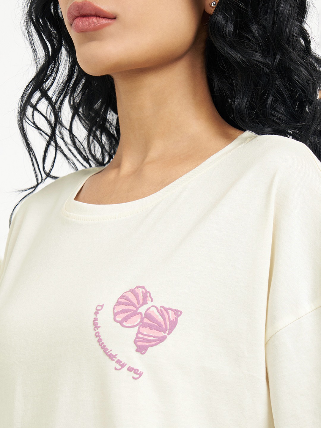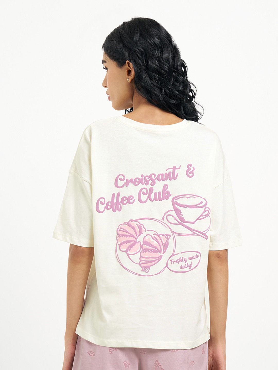 Designed for unhurried mornings, this oversized sleep tee leans into café-core comfort with a playful twist. Cut with a relaxed round neckline, dropped half sleeves and a minimal chest motif, it features a bold Croissant & Coffee Club graphic at the back that adds character without feeling loud. Made from a soft, breathable knit that drapes easy and stays comfortable through long lounging and sleep hours.