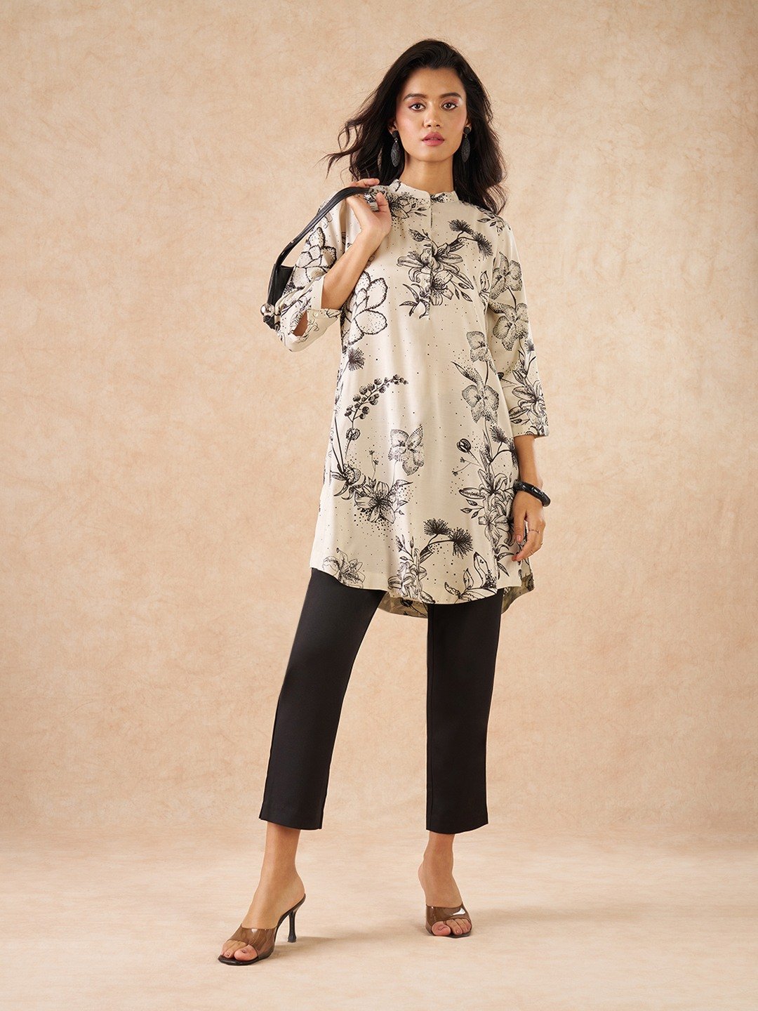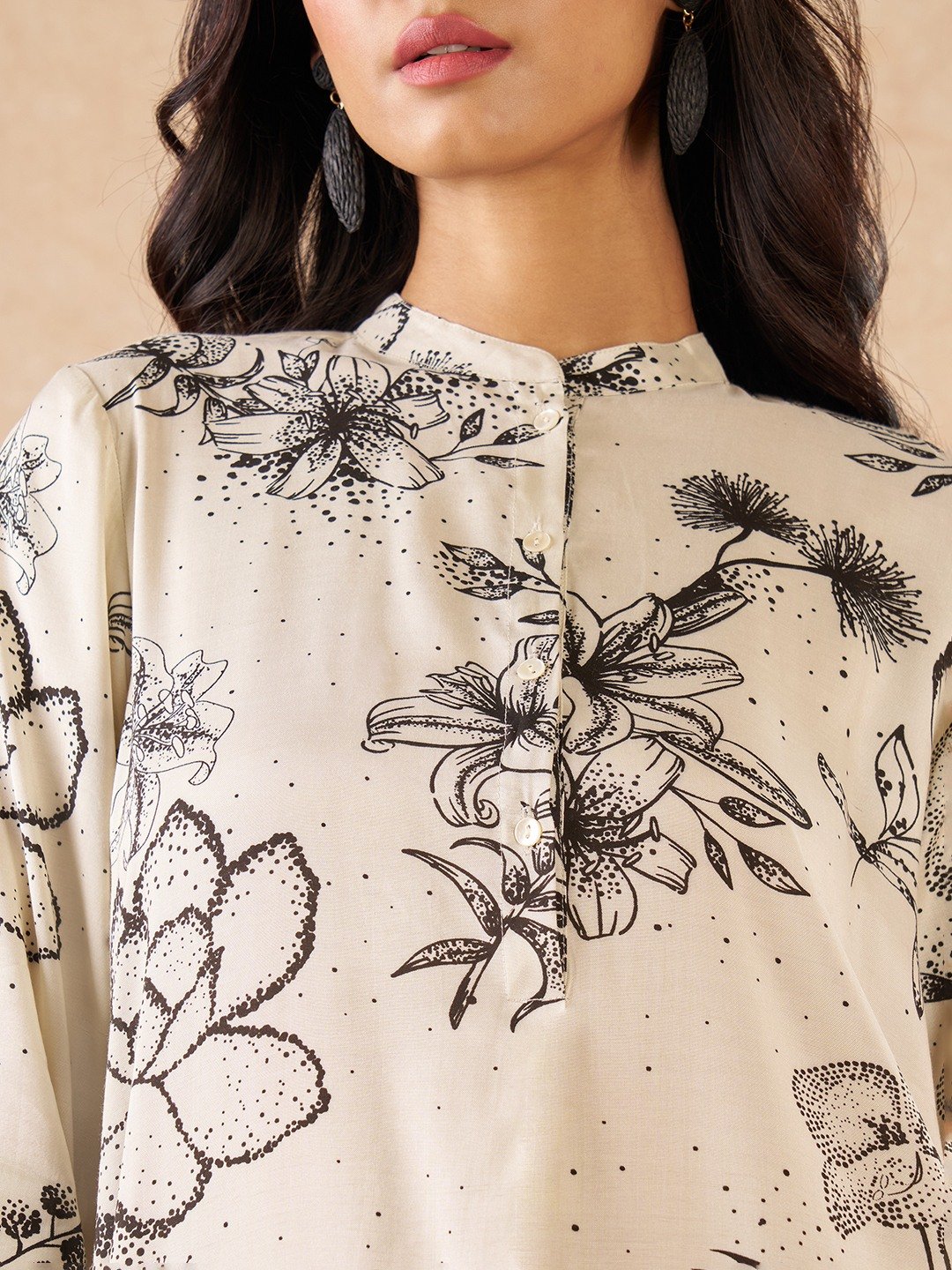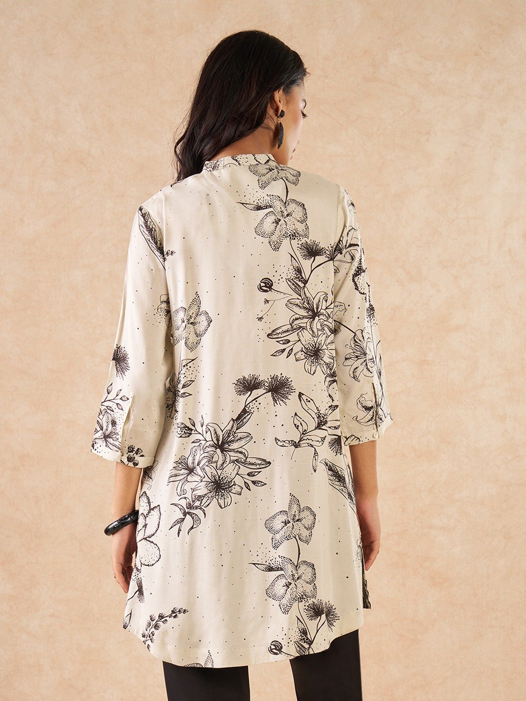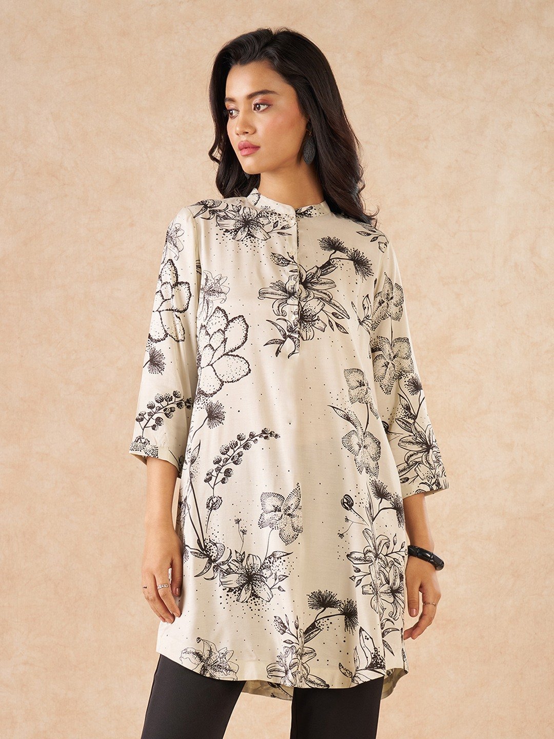 This refined tunic from our Starry Night collection is designed to express understated elegance through clean lines and thoughtful print placement. Shaped in a straight silhouette with a mandarin collar and subtle button placket, it features softly scattered floral motifs and fine speckled accents that lend a calm, celestial rhythm to the surface without overwhelming the form. Crafted in viscose, the fabric offers a fluid drape and breathable comfort, allowing the tunic to move effortlessly while maintaining a polished, composed finish.