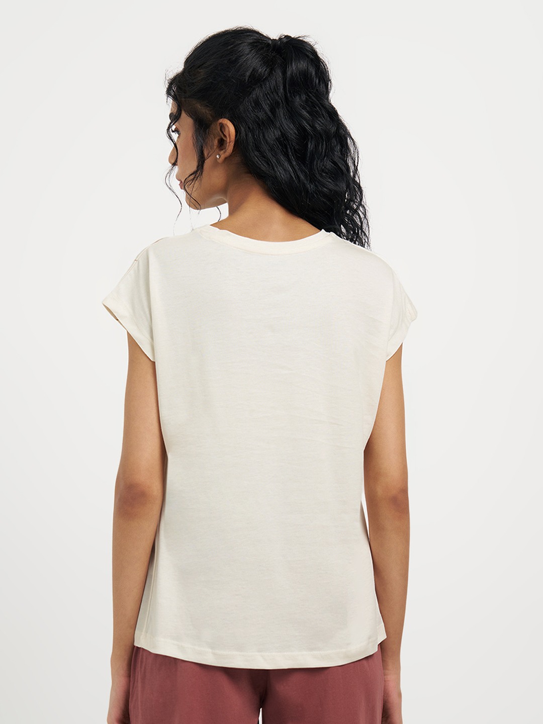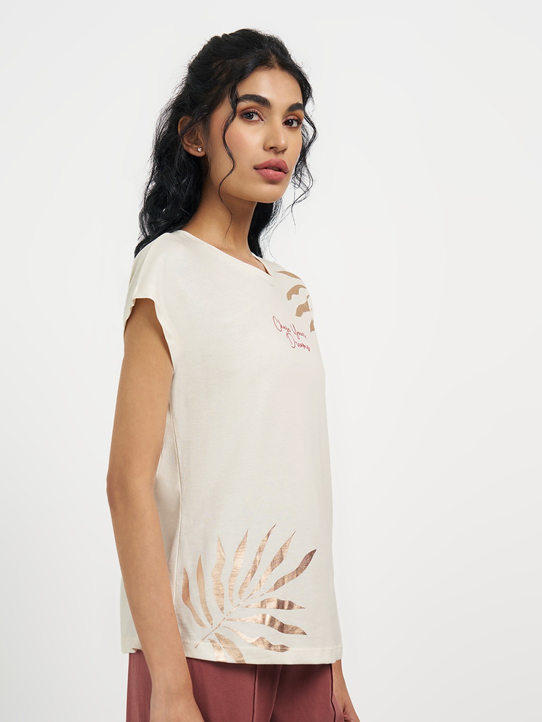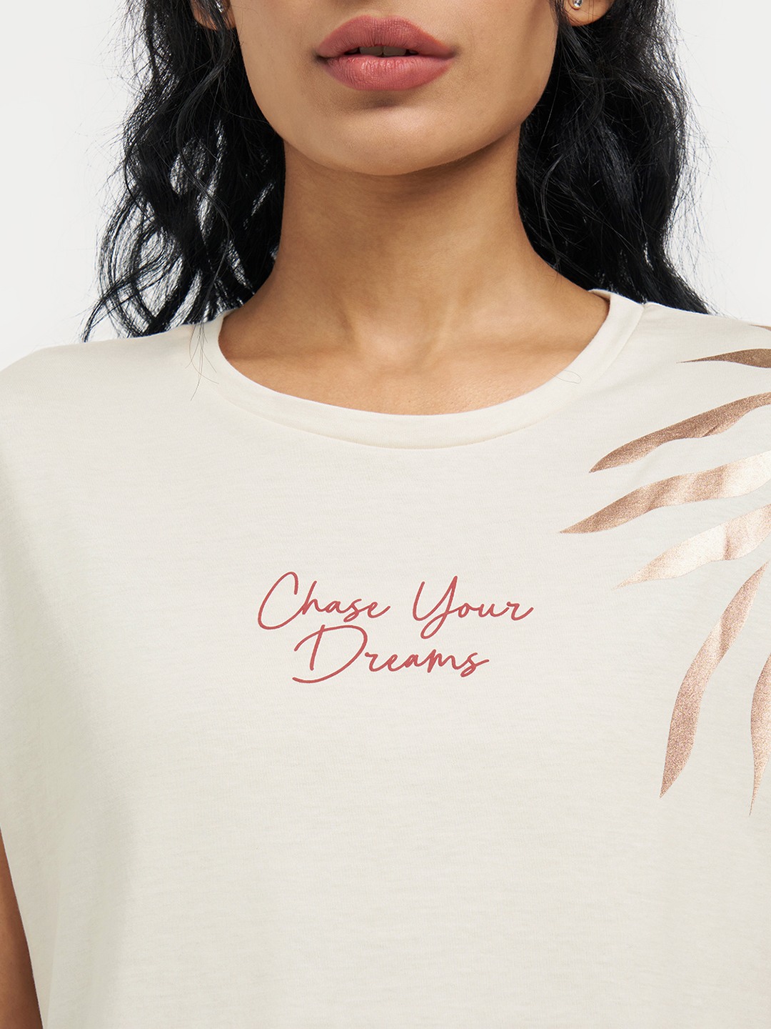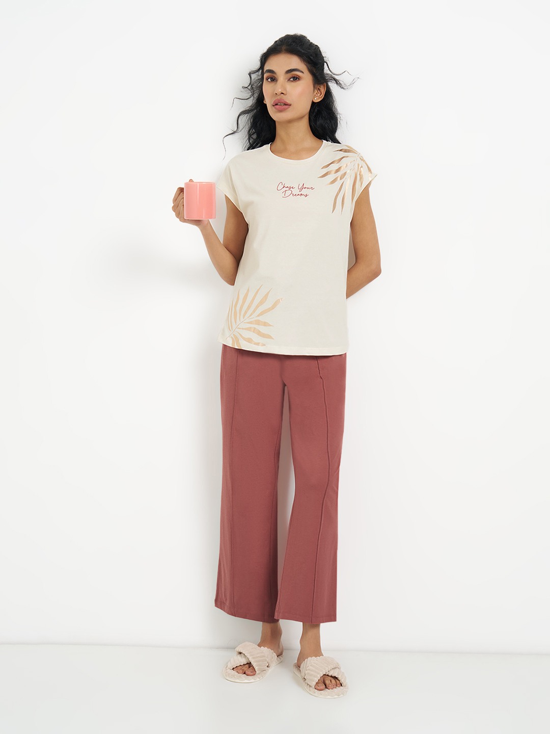 Quiet motivation meets bedtime comfort with a clean, minimal front. Designed with a round neckline, dolman sleeves and a subtle slogan print accented by tonal botanical placement at the shoulder and hem. Made from a soft, breathable knit that feels light on the skin through long hours of rest.