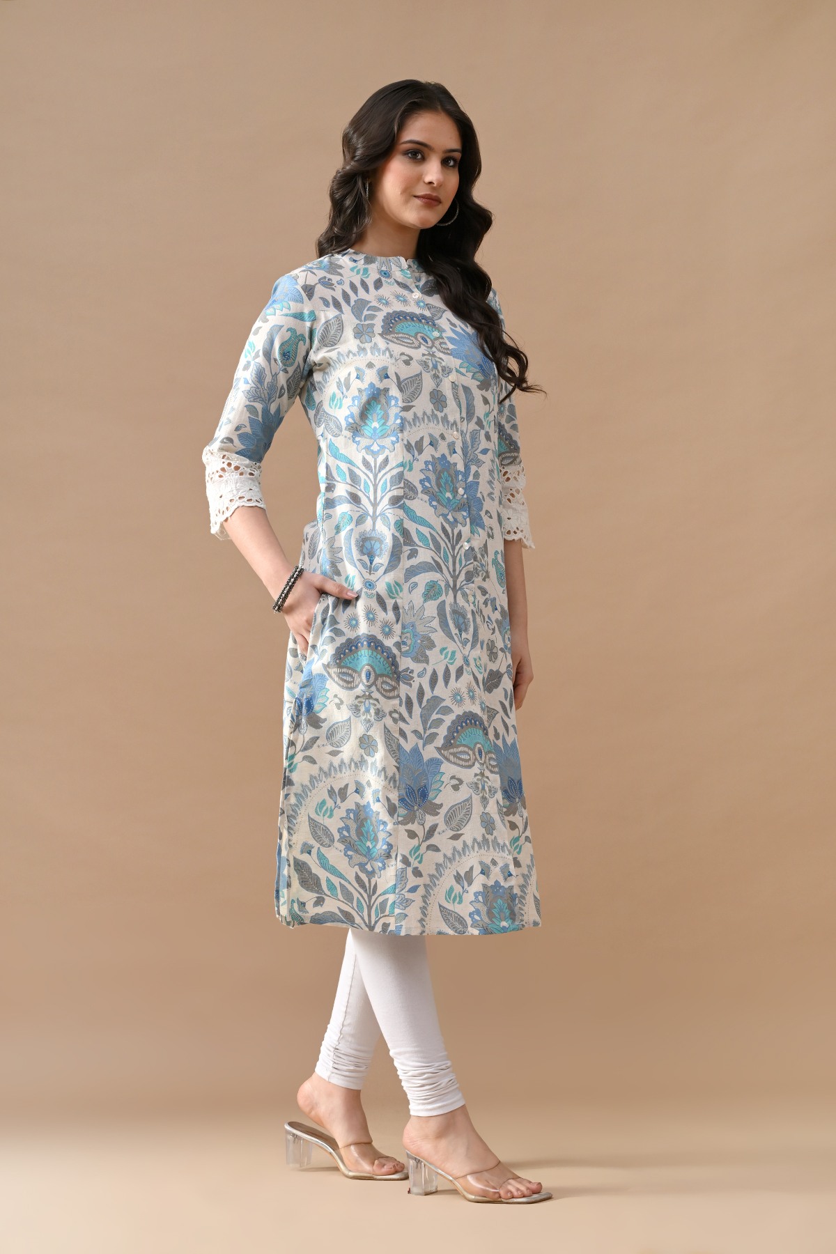 Off white printed a-line kurta with mandarin collar, button-down closure, three-quarter sleeves, a-line hem, two functional pocket and multi slits. elegant and comfortable, perfect for casual outings.