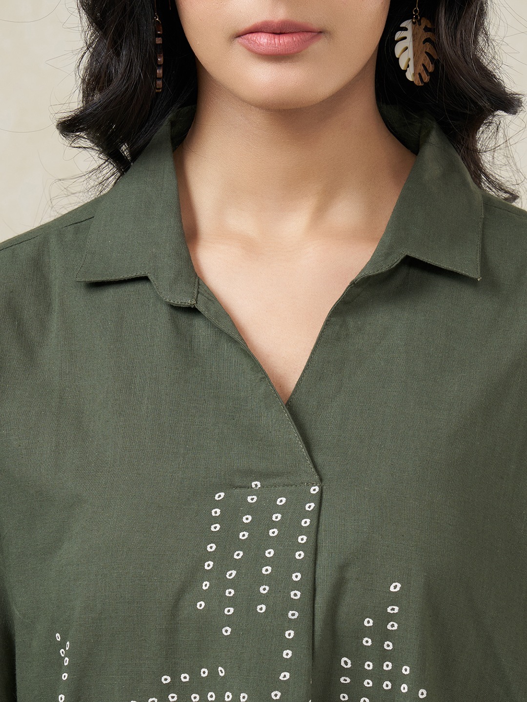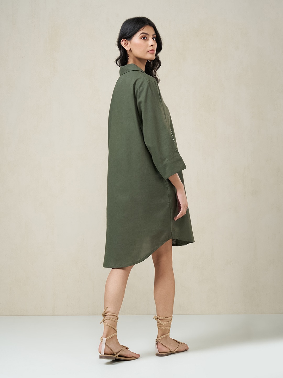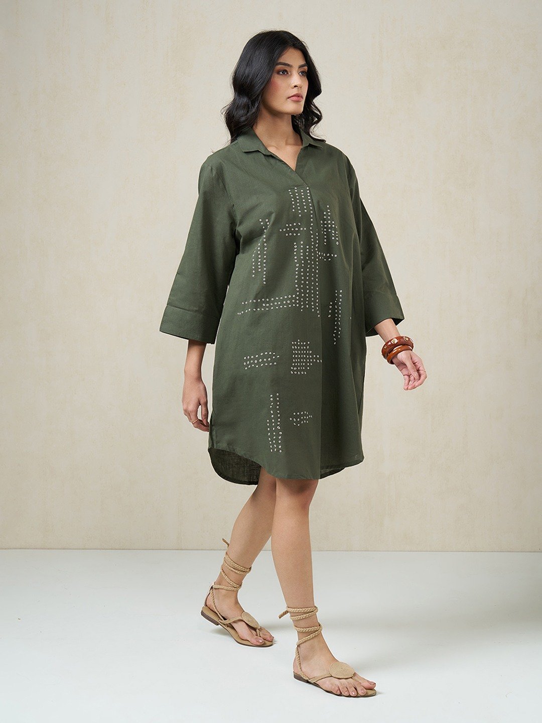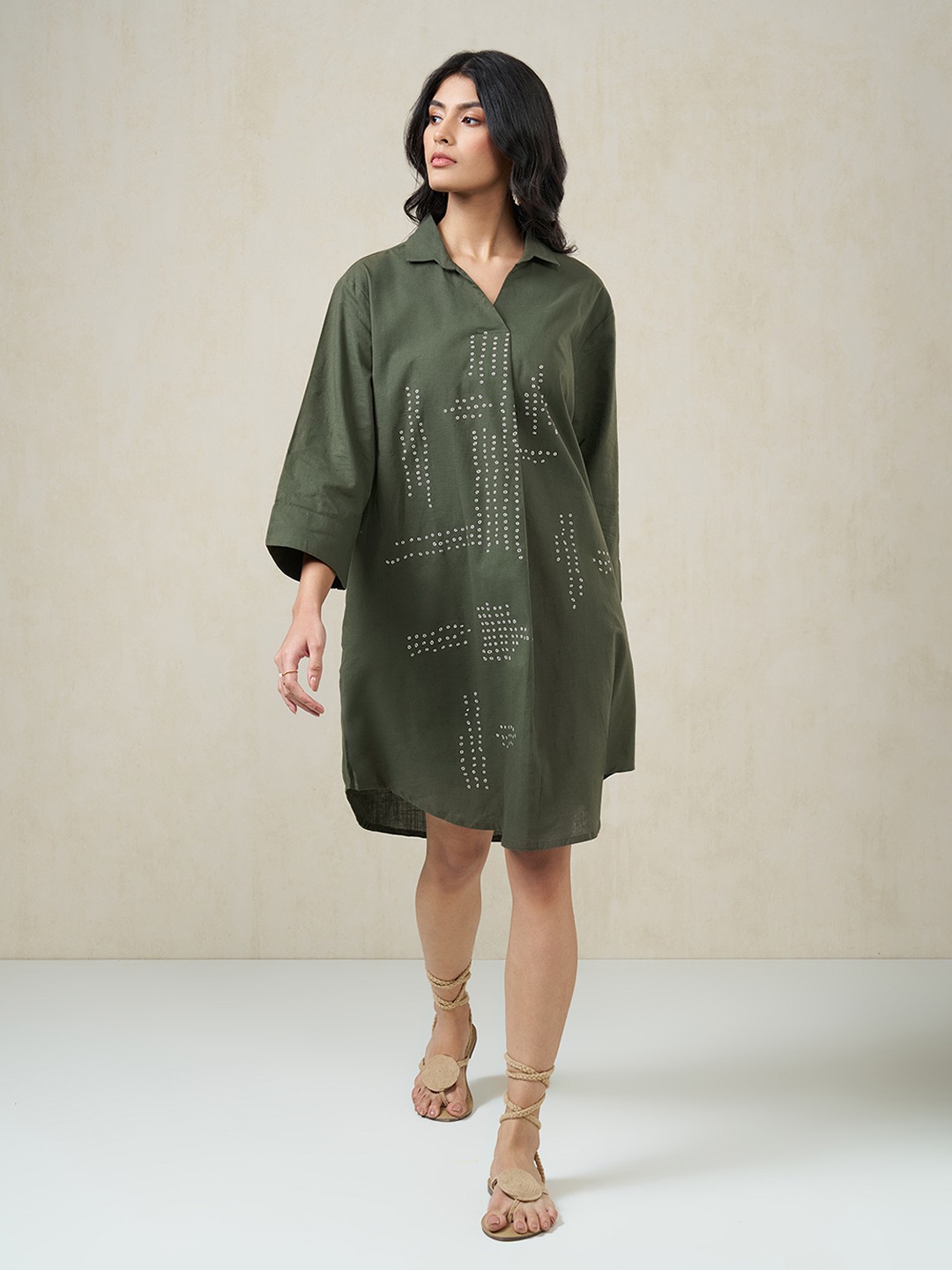 Graphic and understated in its appeal. Designed with a spread collar, relaxed silhouette and 3/4 sleeves, this dress features an all-over geometric placement print arranged in clean, linear motifs. The lightweight woven fabric feels airy and fluid, keeping it comfortable for extended wear.