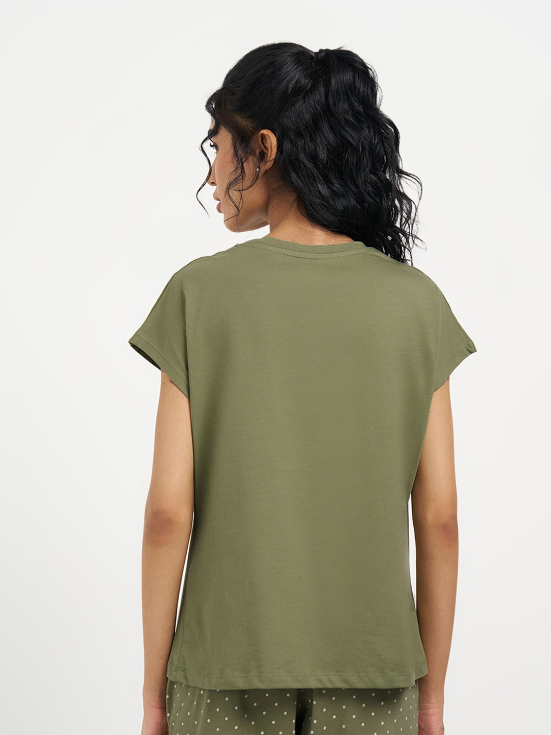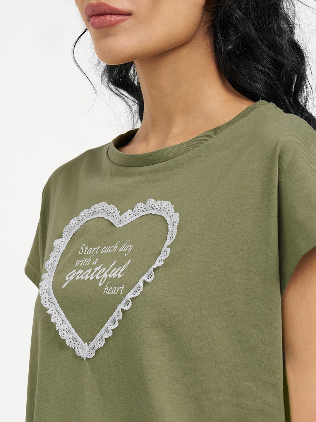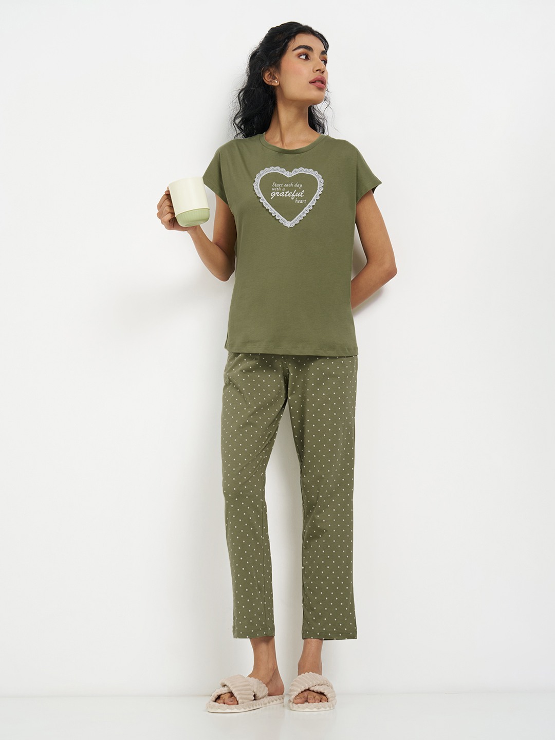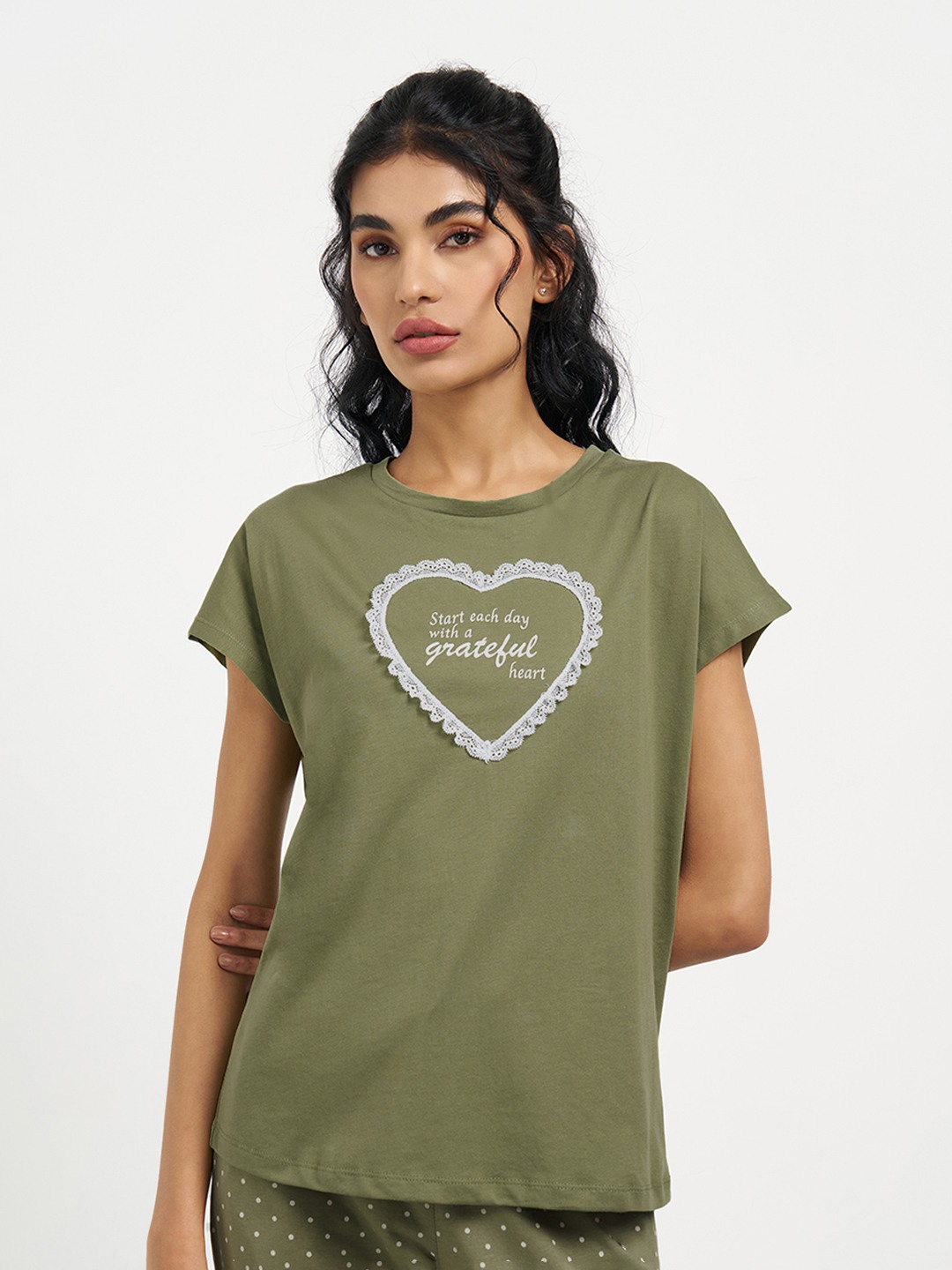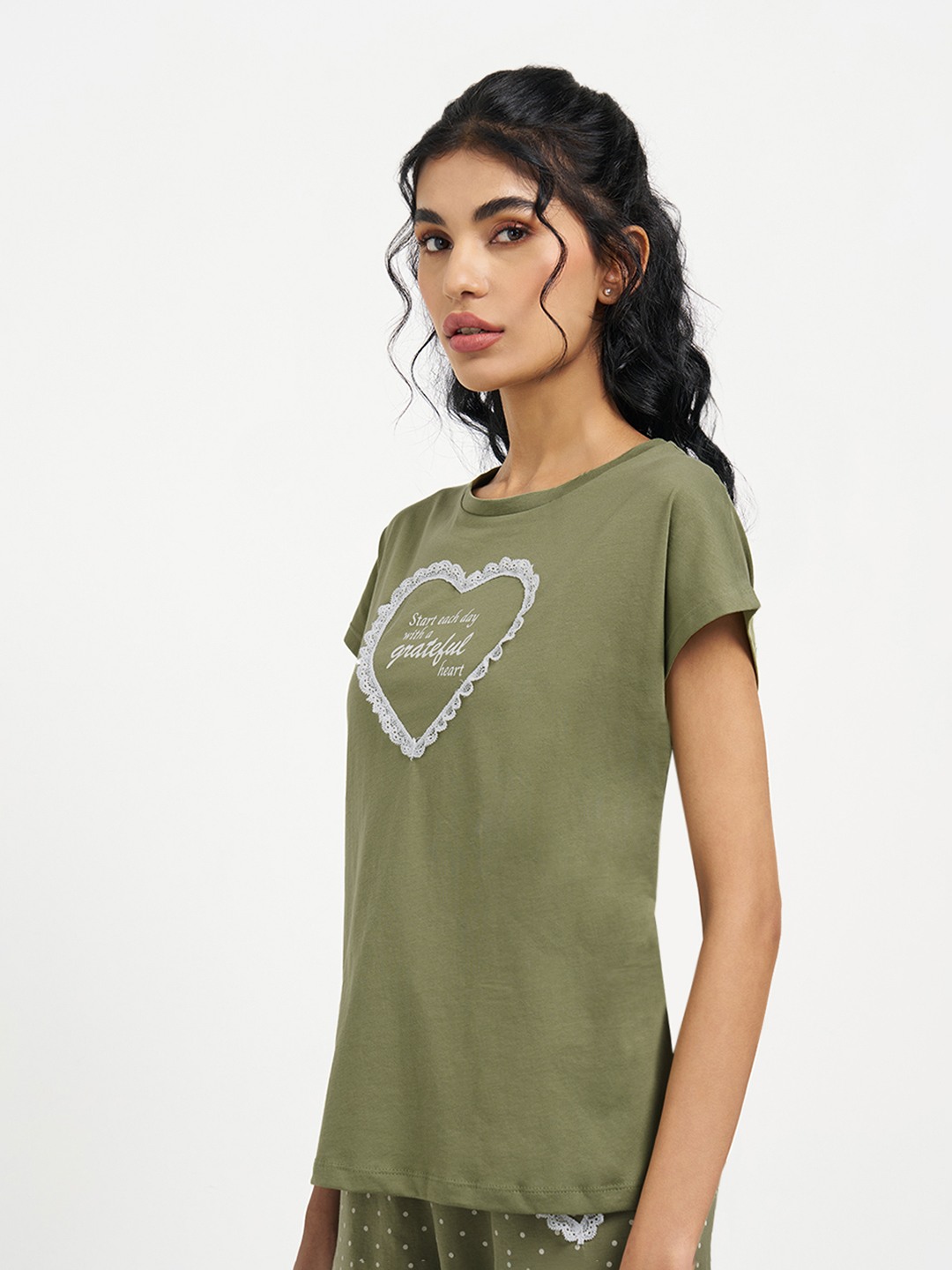A calm start-to-day message, translated into an easy sleepwear essential. Styled with a round neckline, dolman sleeves and a placement heart graphic featuring lace-effect detailing and a grateful slogan at the chest. Crafted in a soft, breathable knit that feels light and comfortable through extended rest hours.
