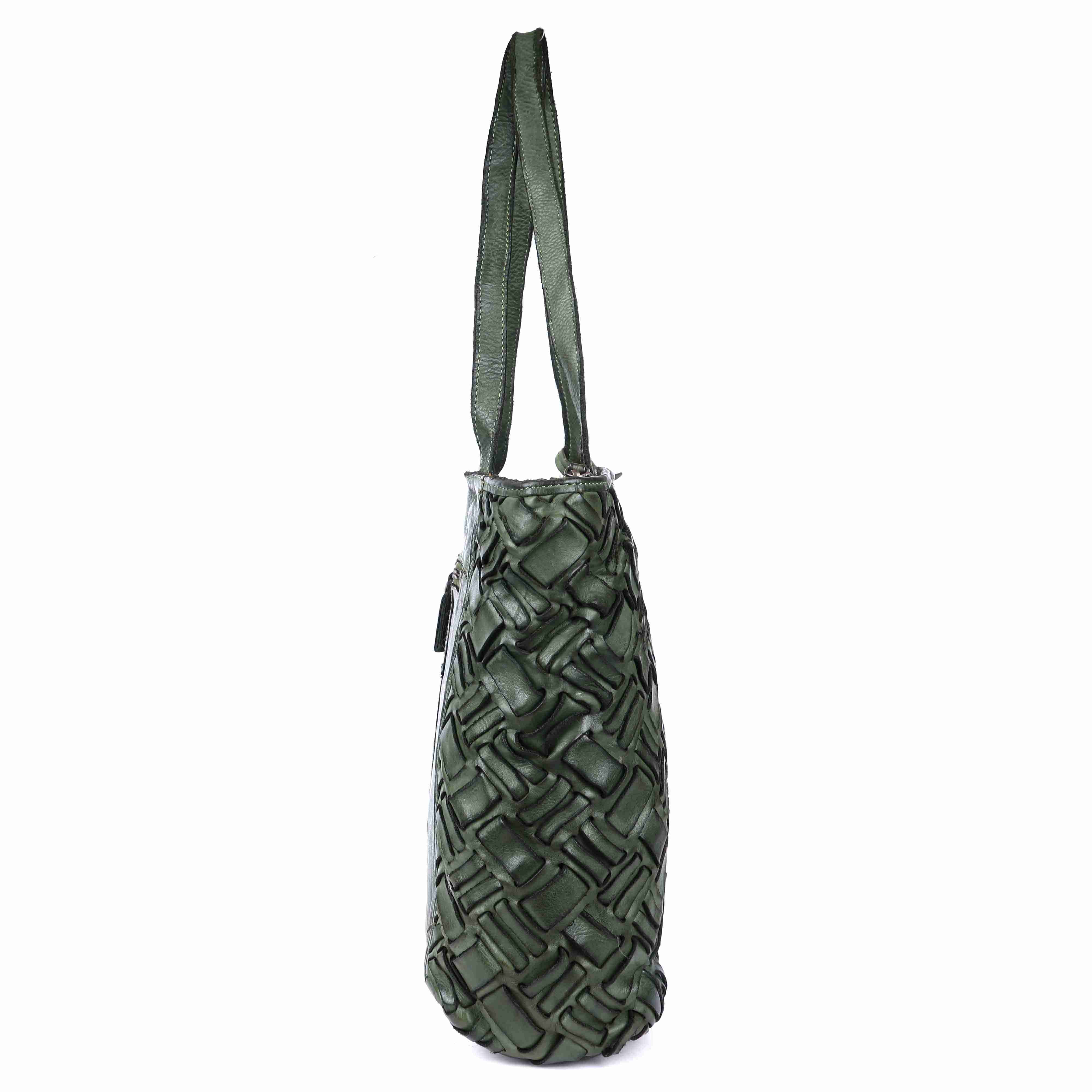 This vegetable-tanned leather weave showcases a bold, structured look with an intricate interlocking pattern of diamond-like segments. The basket-like texture gives it a visually striking, three-dimensional appearance. Cut-out spaces within the weave allow light to pass through, adding depth and enhancing the natural beauty of the leather. The tight and layered construction not only highlights exceptional craftsmanship but also ensures lasting durability, making it a perfect blend of style and strength.