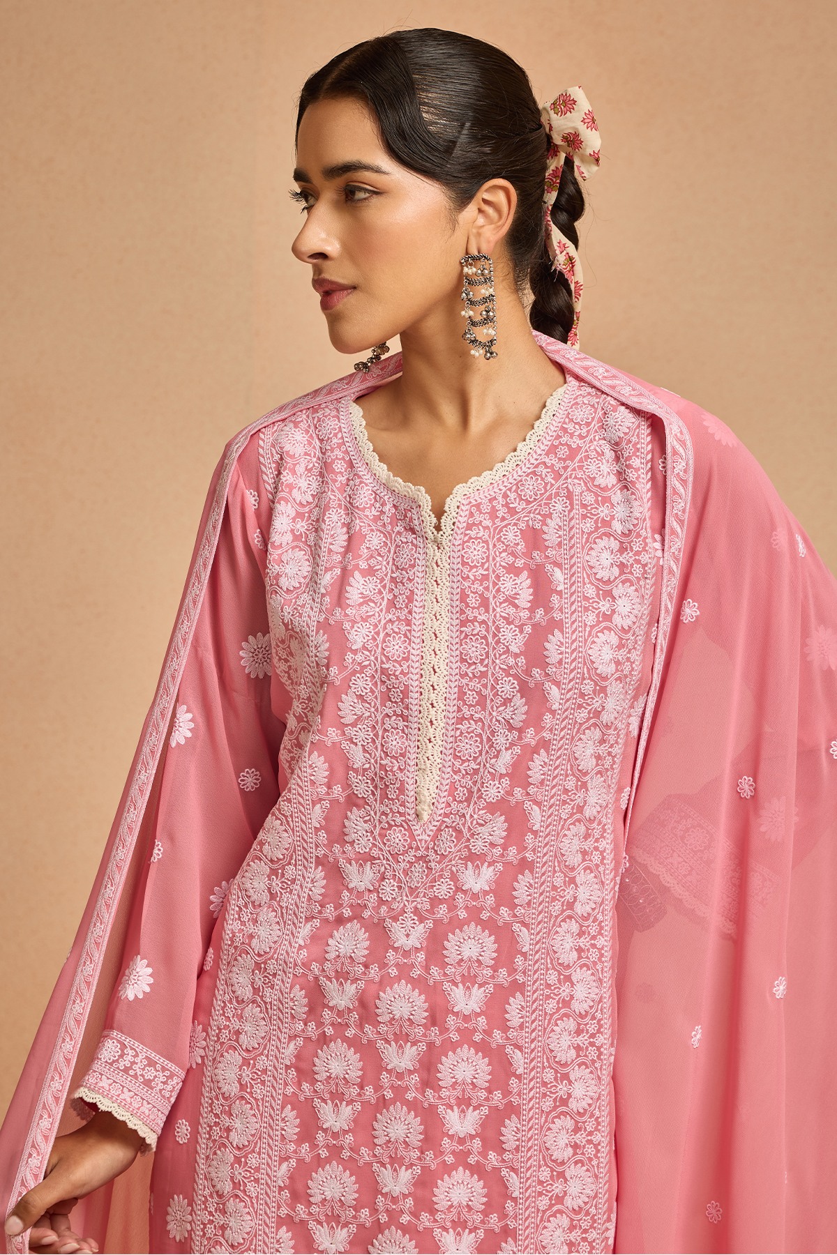 This Peach embroidered straight kurta set features a stylish round neck, three-quarter sleeves, and side slits for a flattering fit. Paired with matching pants and a dupatta, it exudes elegance and charm, making it perfect for both casual and semi-formal occasions.