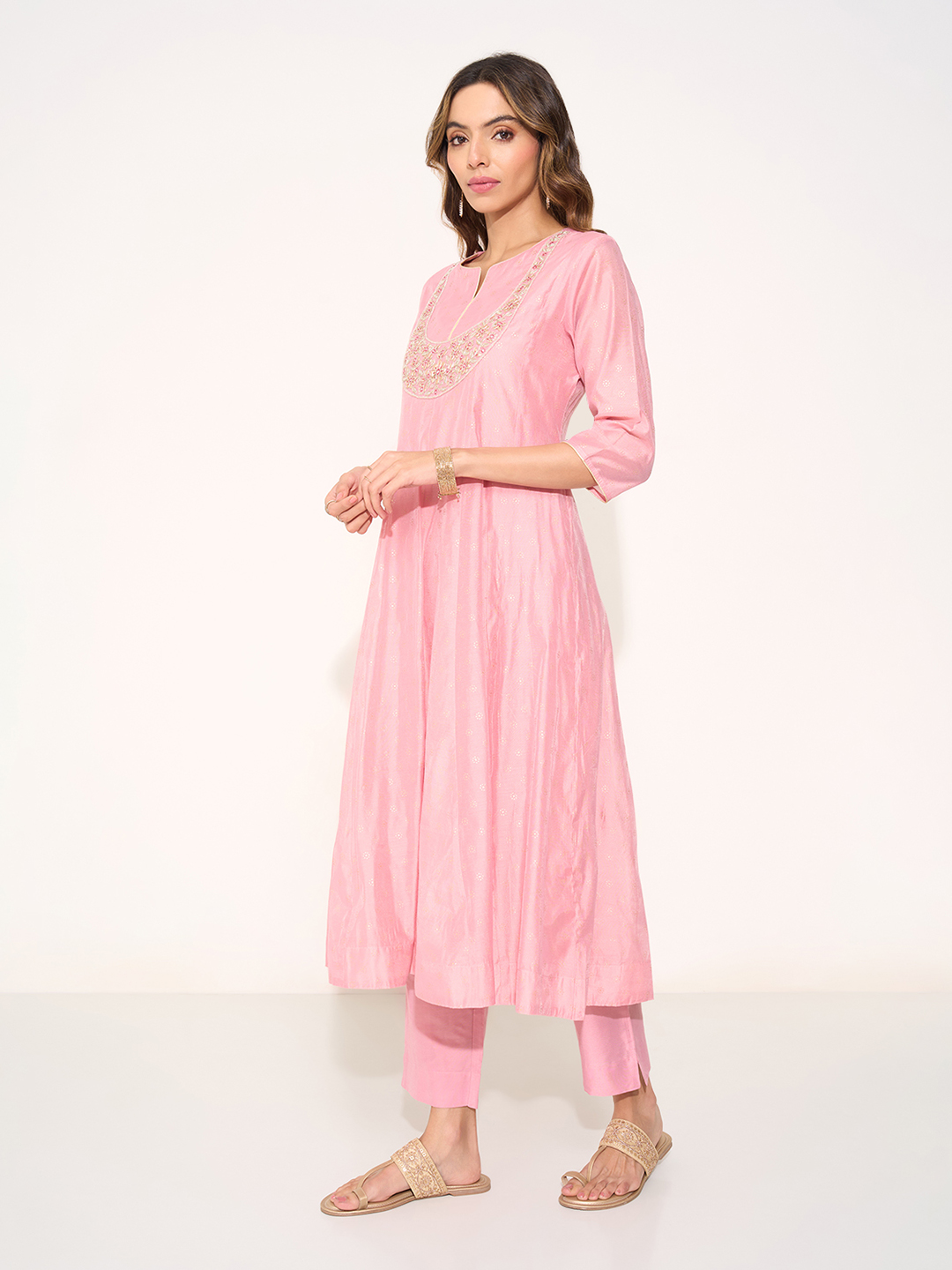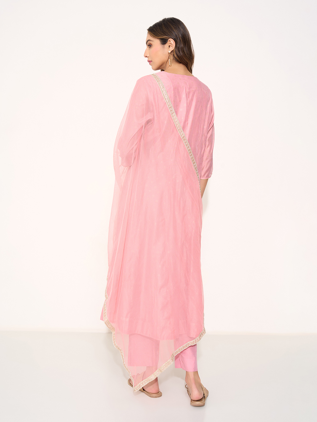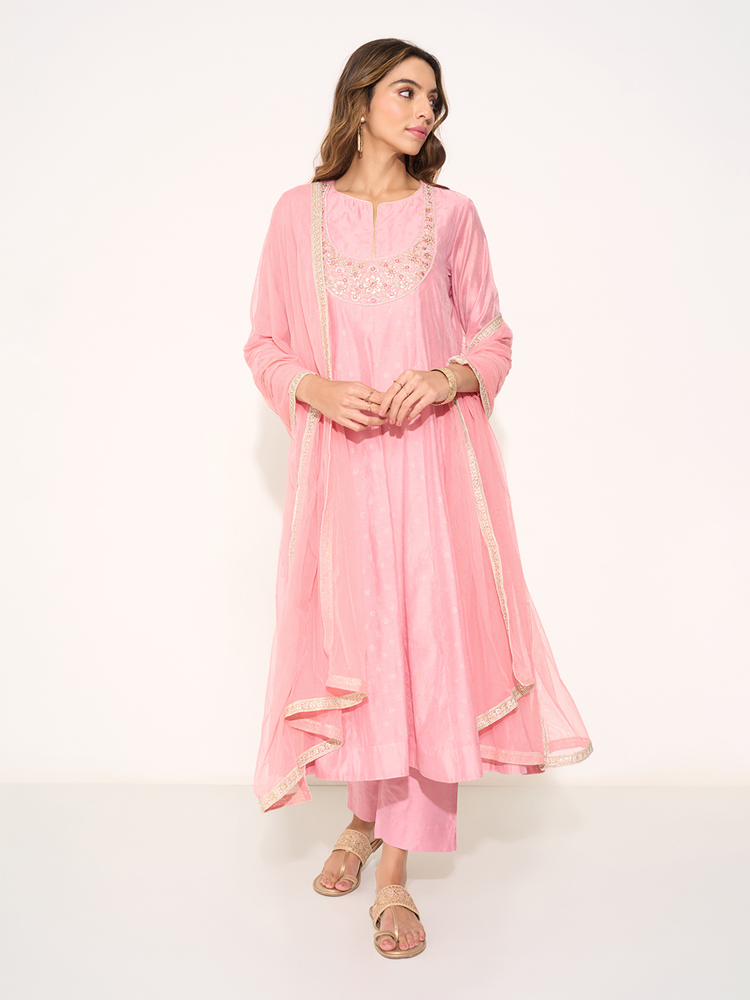 Pink Embroidered A-line Kurta Pants & Sheer Dupatta Set