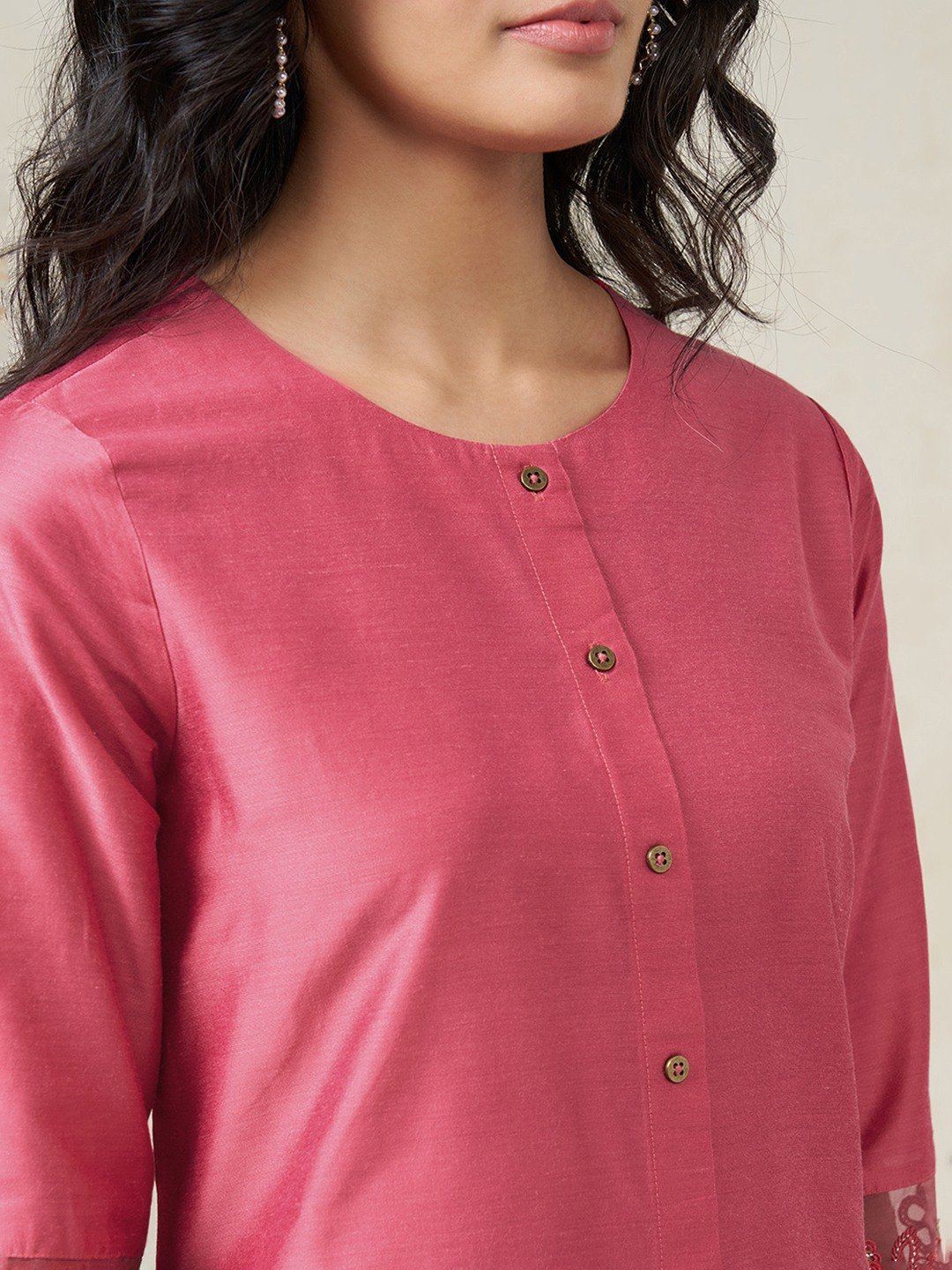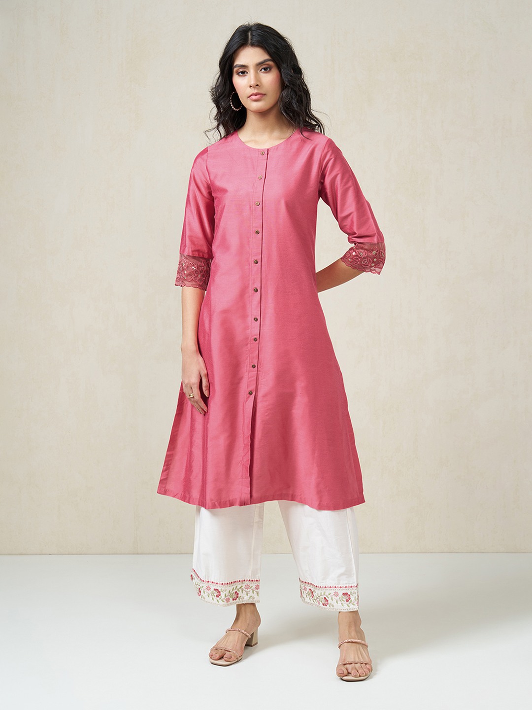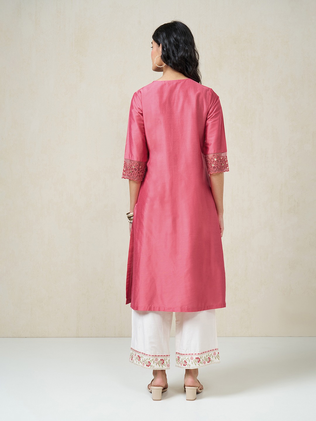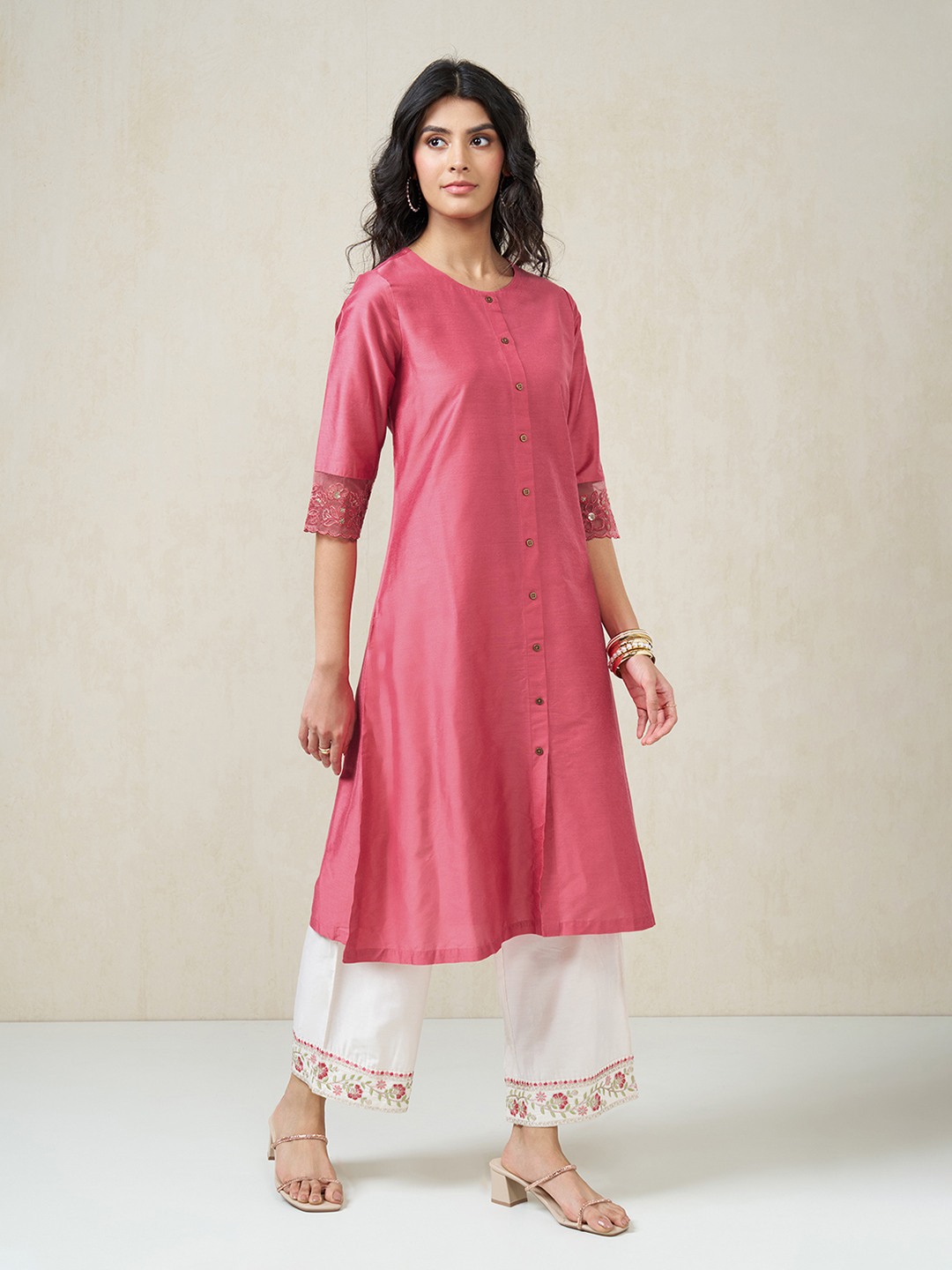 An instant festive lift. Designed with a round neckline, button-up front, A-line cut and 3/4 sleeves, this kurta is finished with delicate floral embroidery at the cuffs for a refined celebratory touch. The lightweight fabric keeps it comfortable while allowing graceful movement through the day.