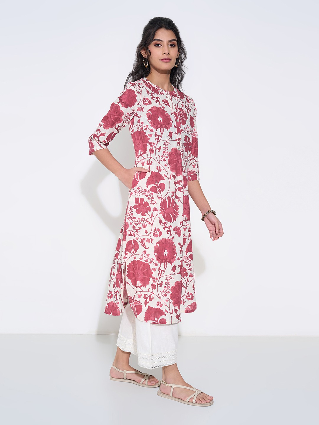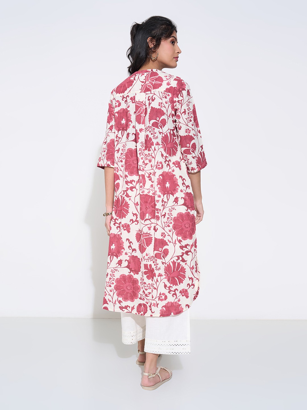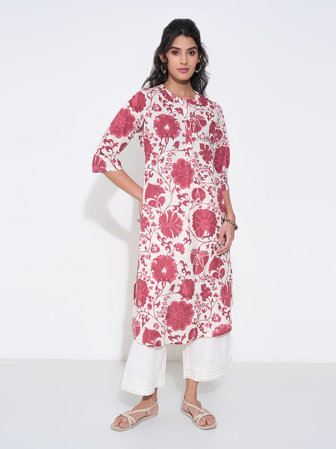 An effortless piece that makes a statement. This kurta has a round neckline with a front button placket, 3/4 sleeves and side slits for ease. The soft woven fabric ensures comfort with a clean fall.