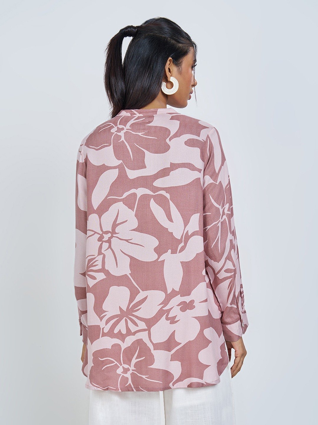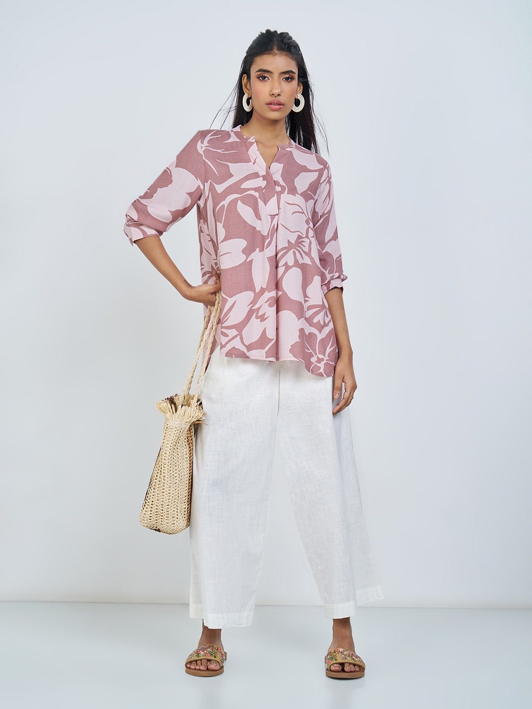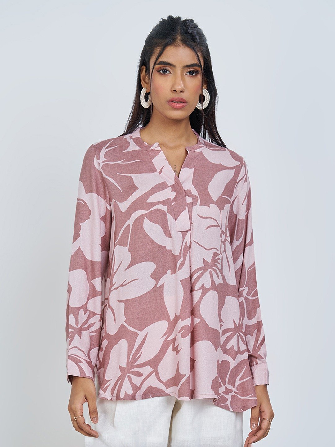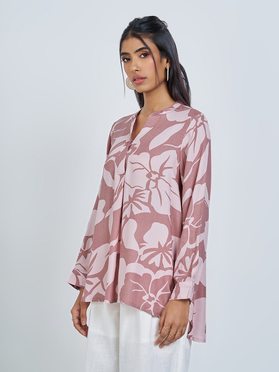 Unfold a soft, serene mood in this breezy floral tunic. Designed with a relaxed A-line silhouette, a gentle split V-neckline and full sleeves, it drapes effortlessly with a fluid fall. Finished in a lightweight woven fabric for an airy, day-long ease.