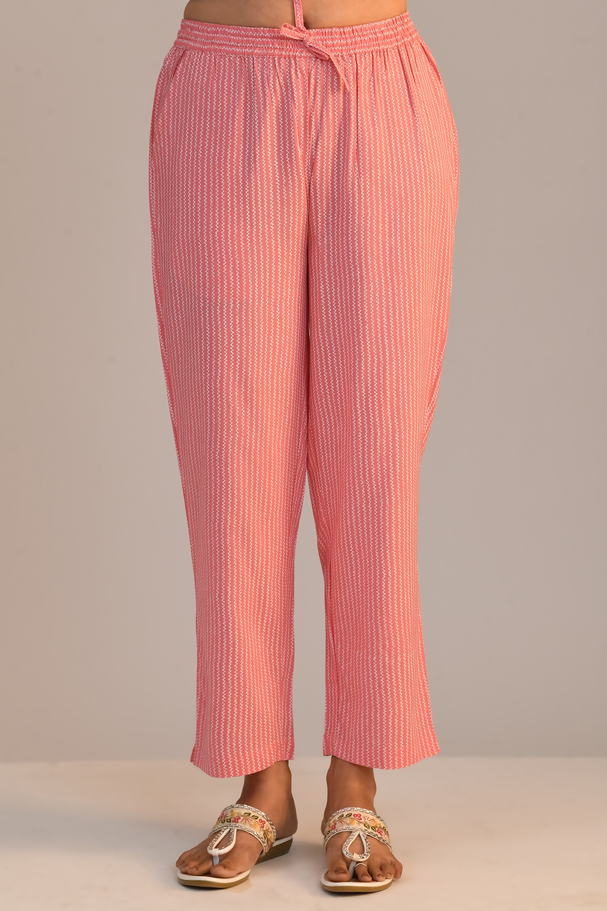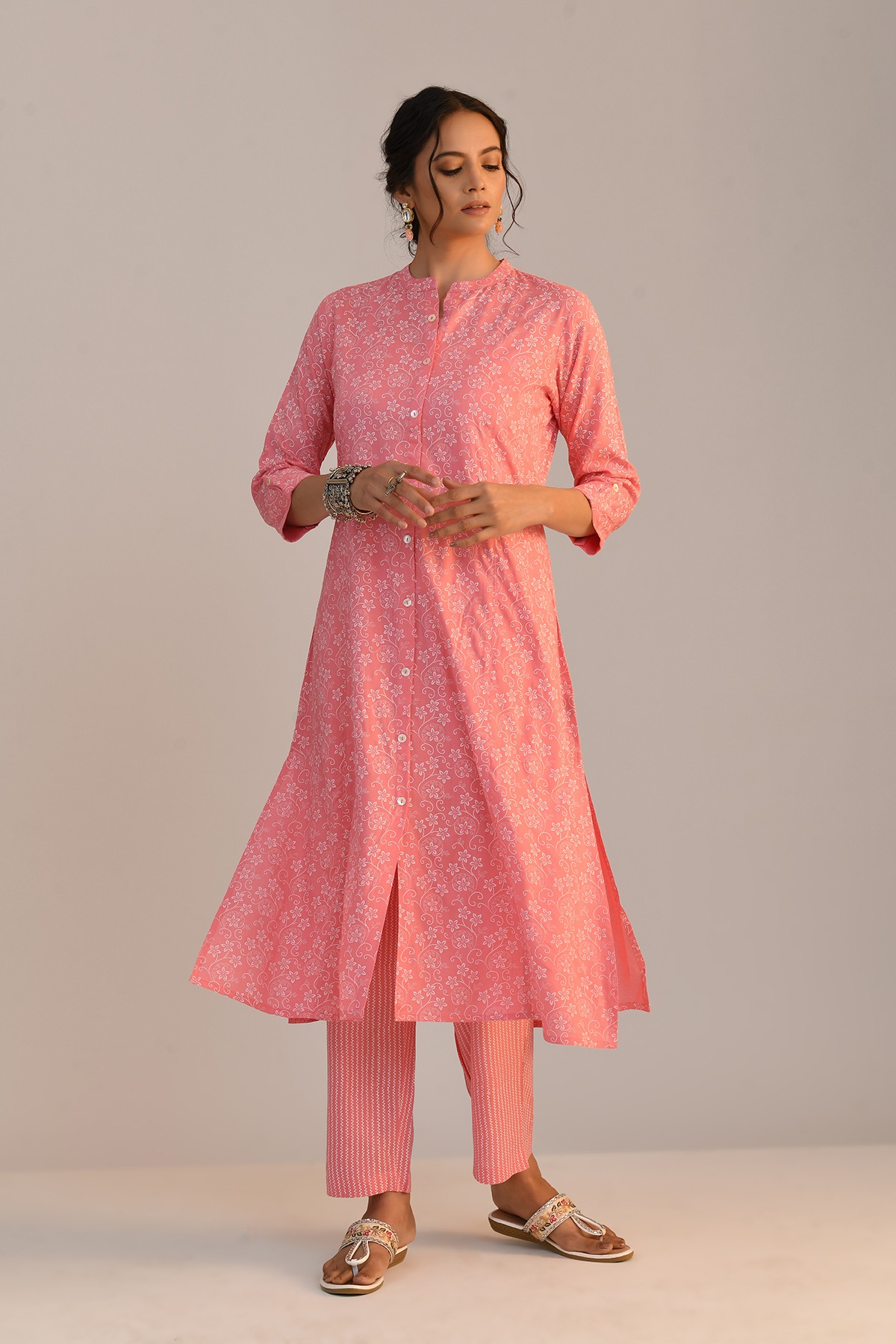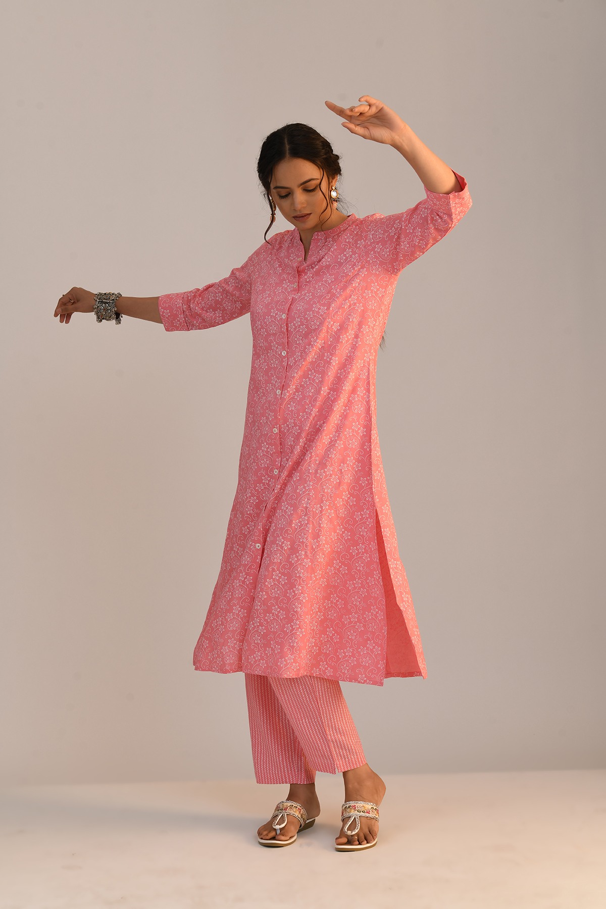 This outfit features a pink floral printed with a A-line kurta with a mandarin collar neck, three-quarter sleeves, multi slits, and pant. the ensemble is a stylish and comfortable choice for various occasions, showcasing a coordinated and fashionable look.
