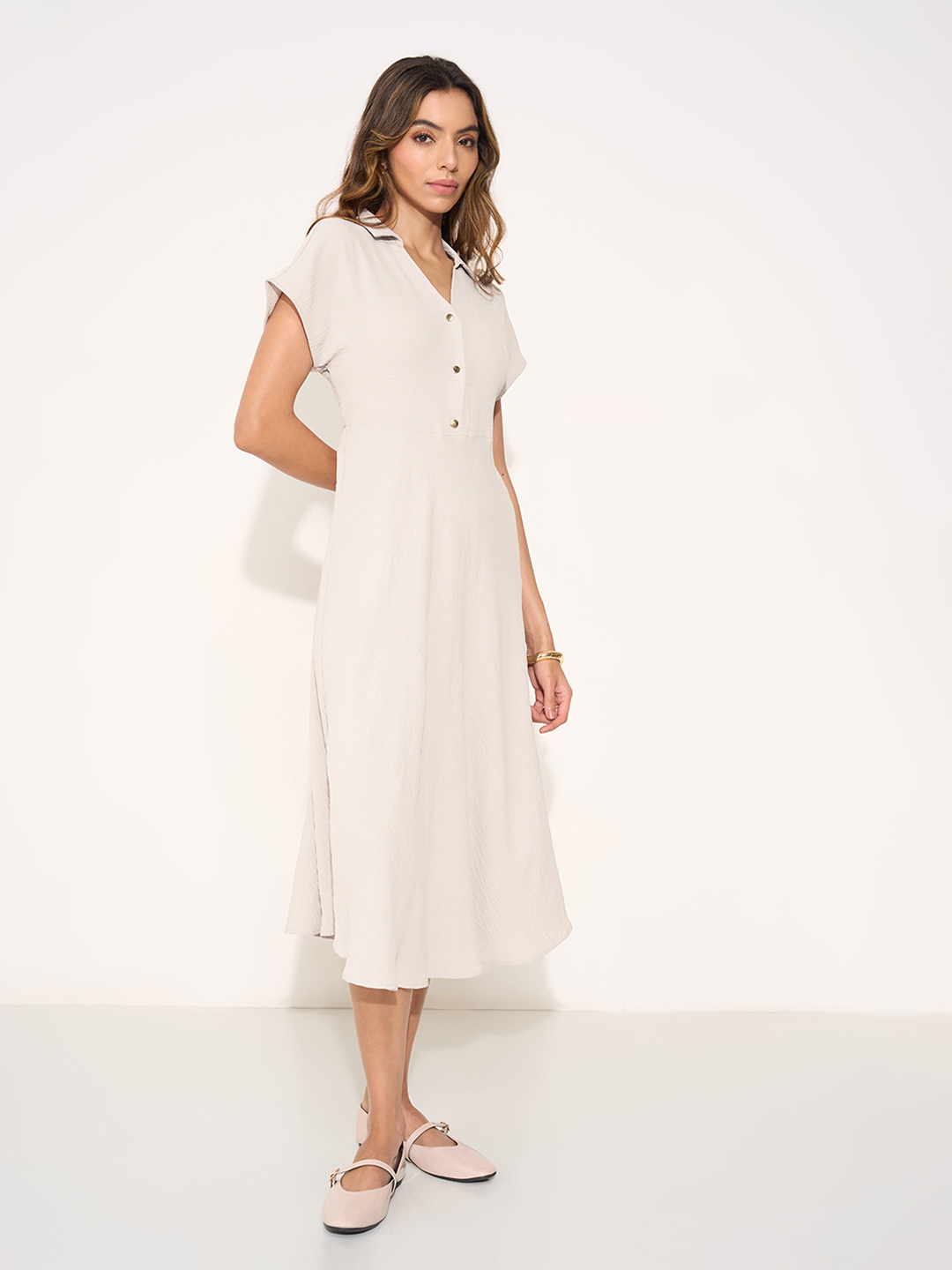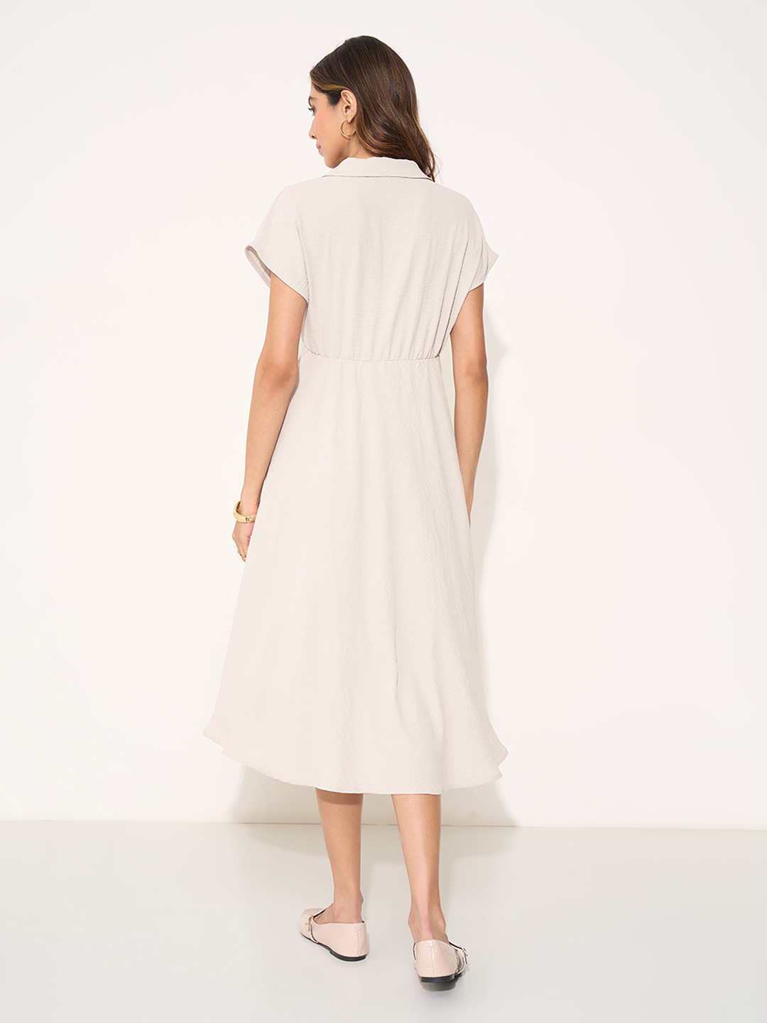 Pink Textured Collared Midi Dress with Dolman Sleeves
