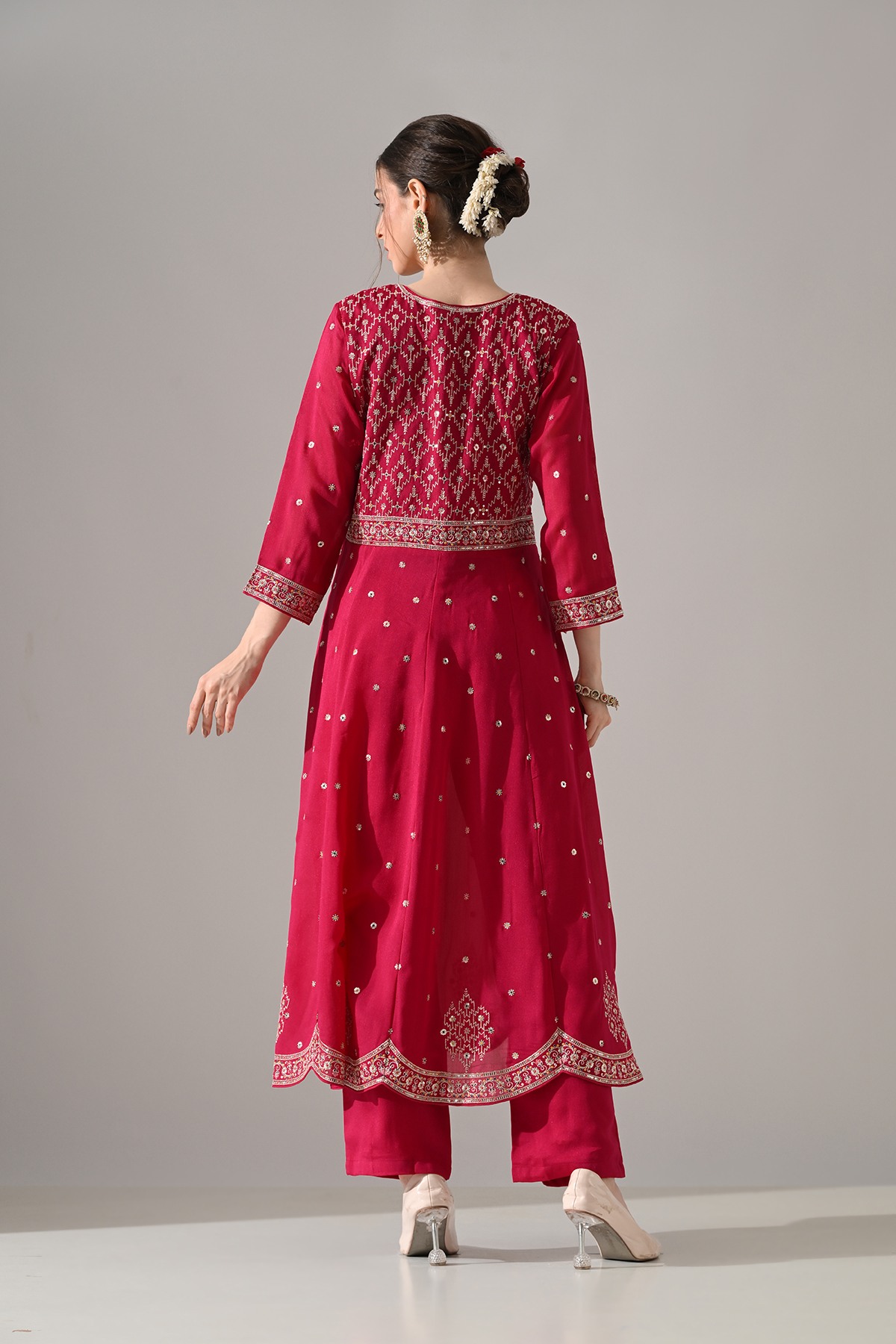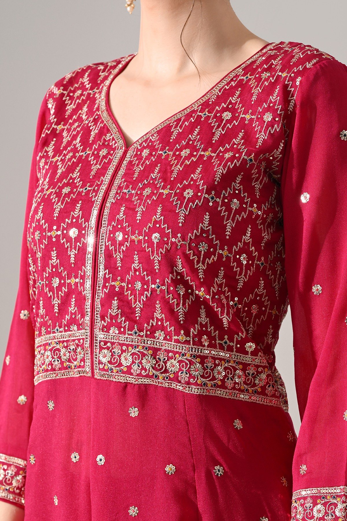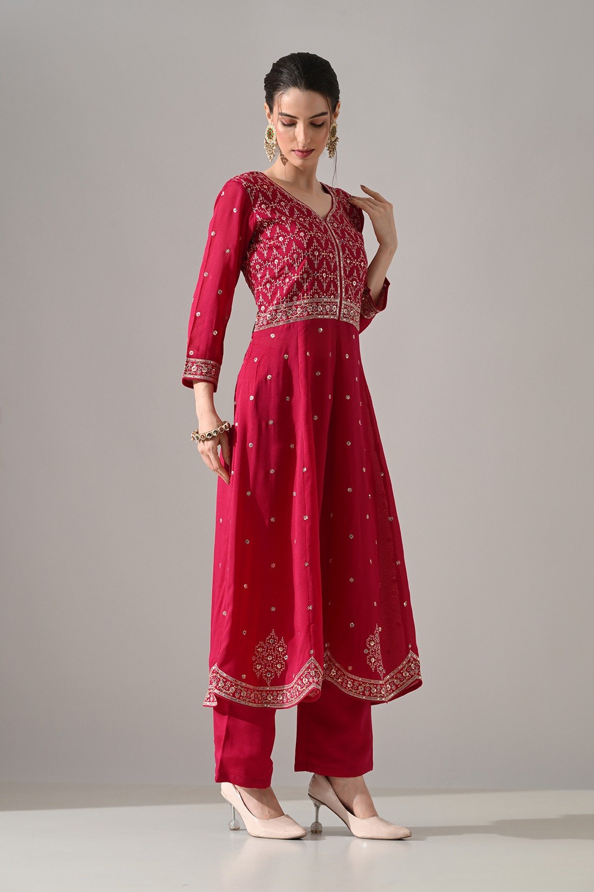 This pink zari embroidered flared kurta set features a stylish v-neck, three-quarter sleeves, and a flared hemline with an embellished yoke. paired with matching pants and a dupatta, it blends elegance and comfort, making it ideal for casual and semi-formal occasions.
