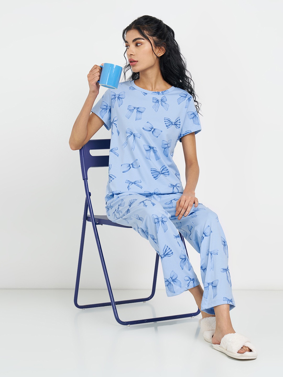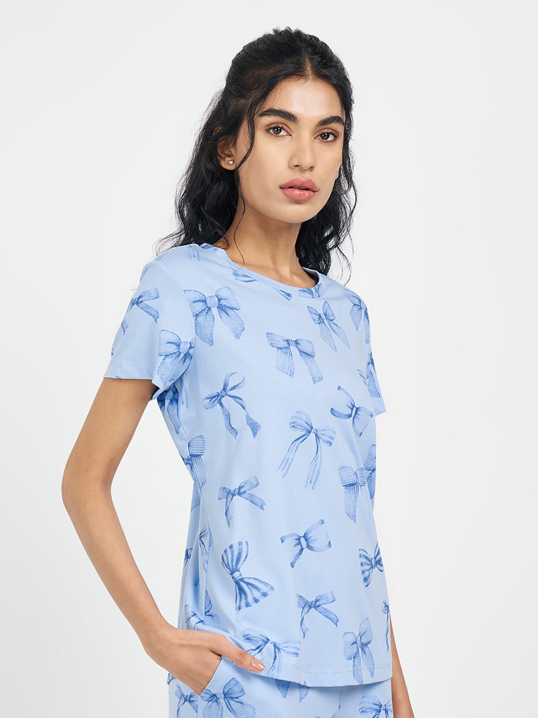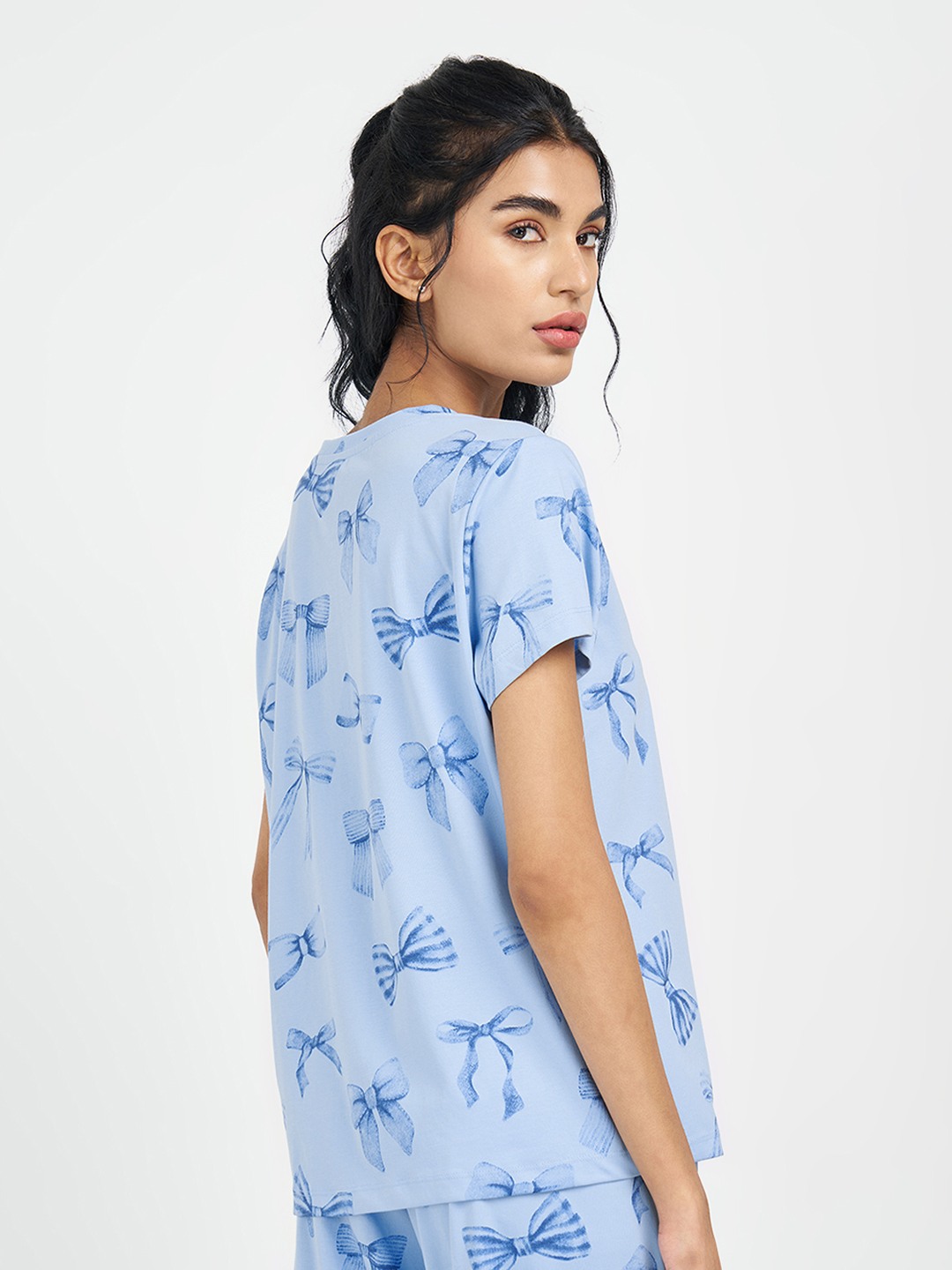 Bow motifs drift across a soft blue base, giving this sleep T-shirt a light, playful charm that feels instantly calming. Designed with a round neckline and short sleeves, the silhouette sits easy on the body, making it ideal for uninterrupted rest. Crafted in a smooth, breathable knit, it keeps comfort front and centre while still looking thoughtfully styled.