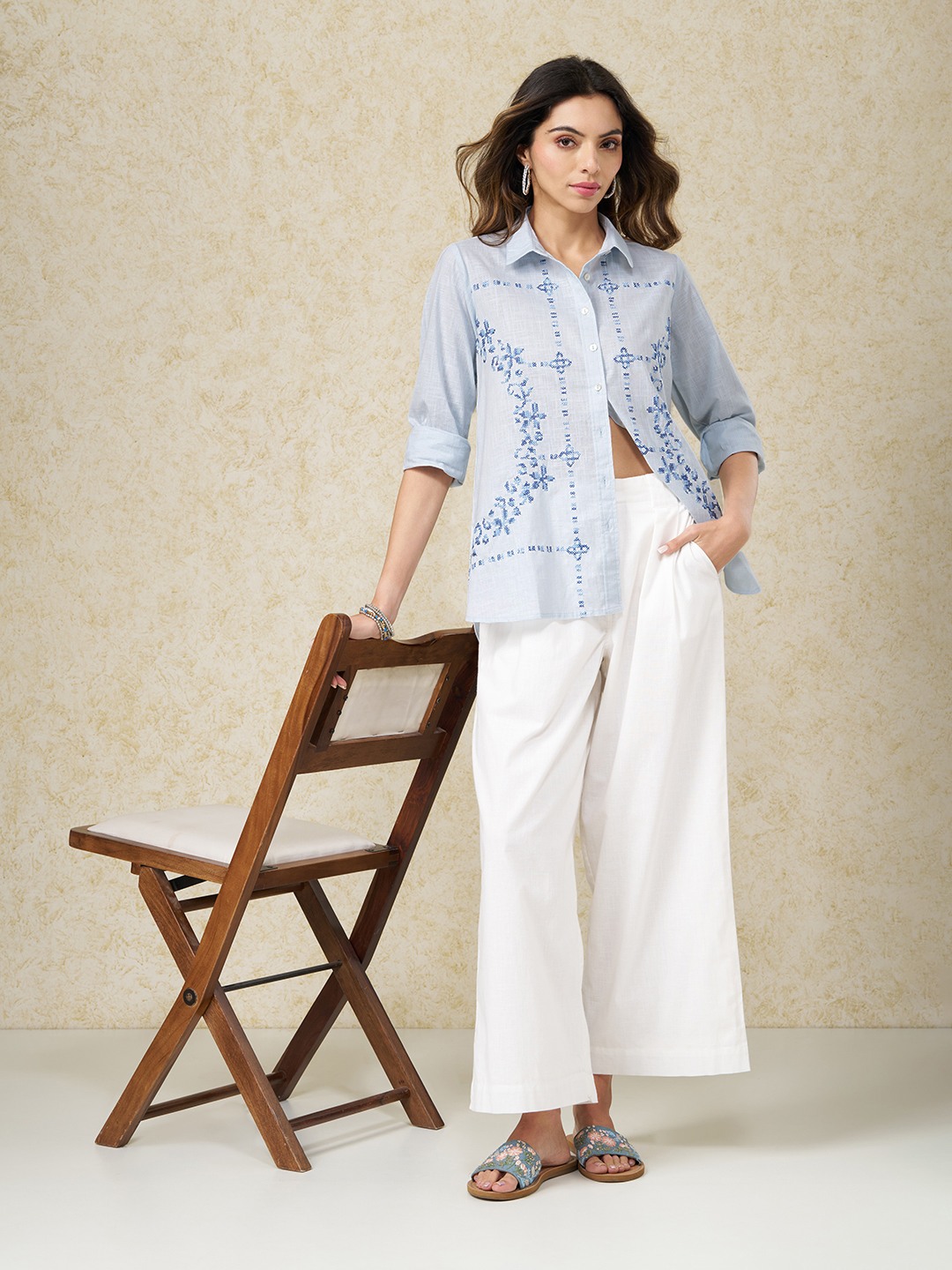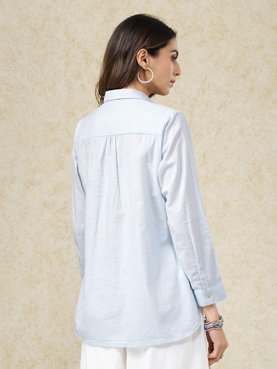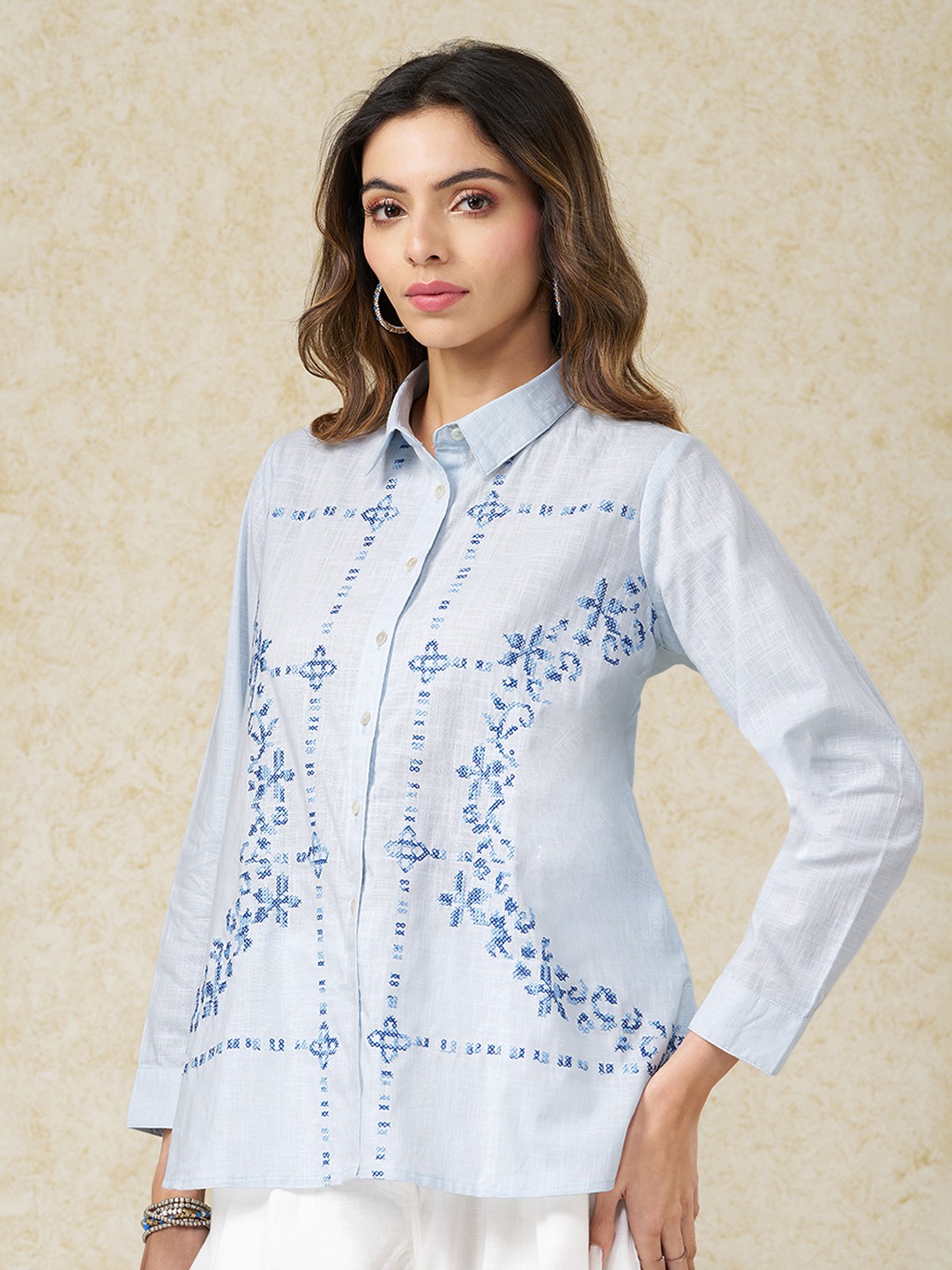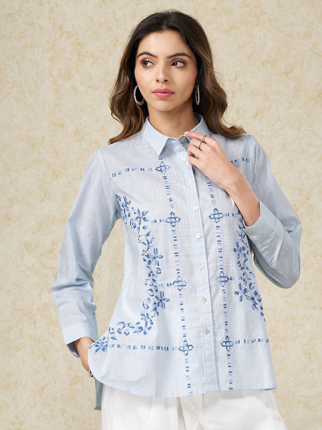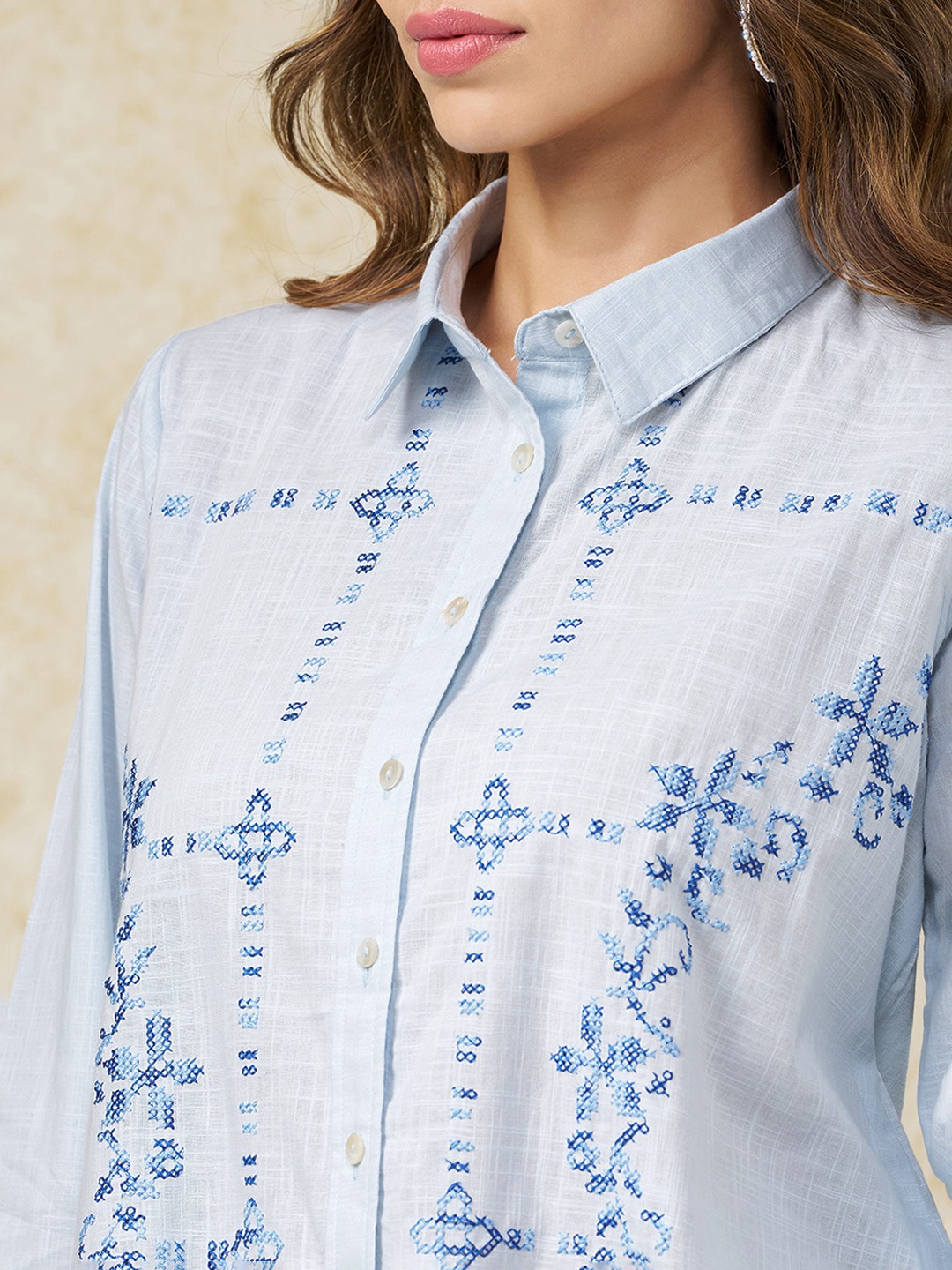 Clean tailoring meets artisanal detail in this softly structured tunic. Designed with a classic collar and full button-up front, it features delicate cross-stitch embroidery placed in a symmetrical, panelled layout, balanced by long sleeves and a straight, easy silhouette. The crisp construction keeps the look polished while letting the embroidery take focus.