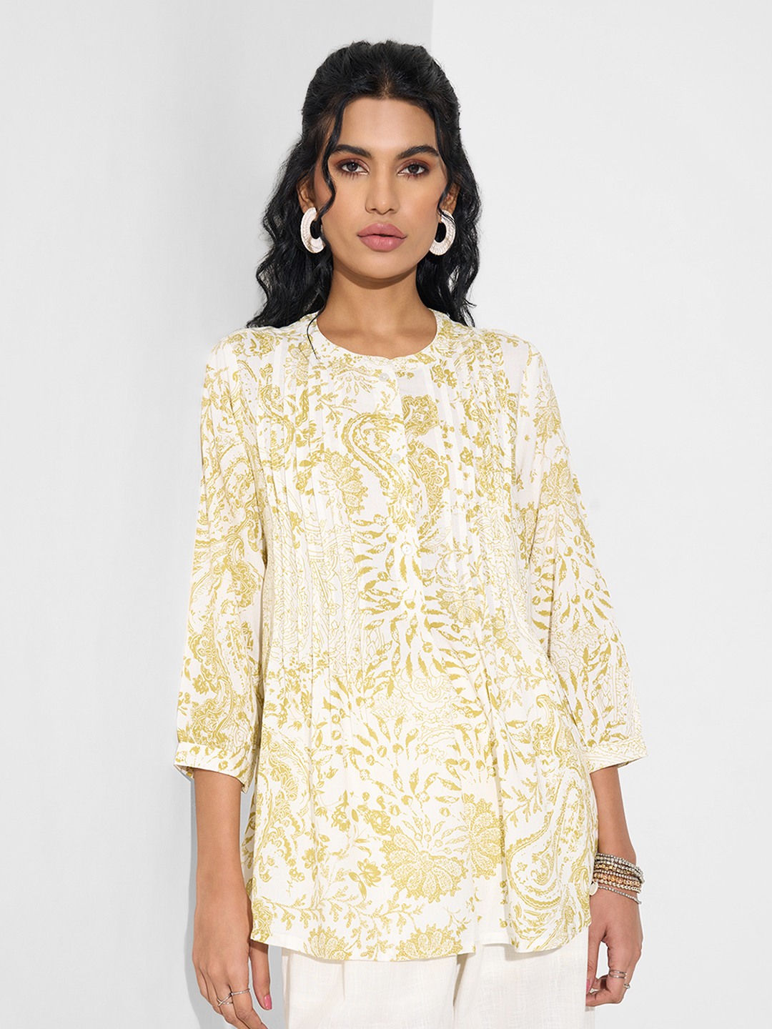 Home/Tunics/Akkriti By Pantaloons/yellow paisley print pintuck tunic with mandarin collar