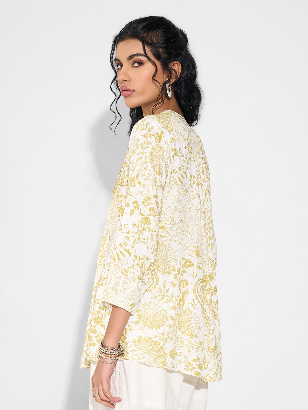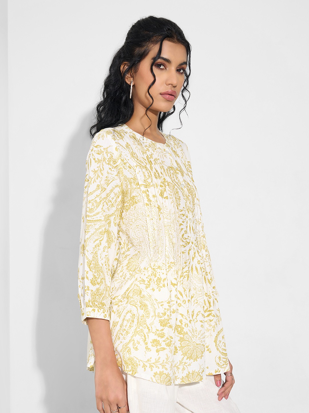 Yellow Paisley Print Pintuck Tunic with Mandarin Collar