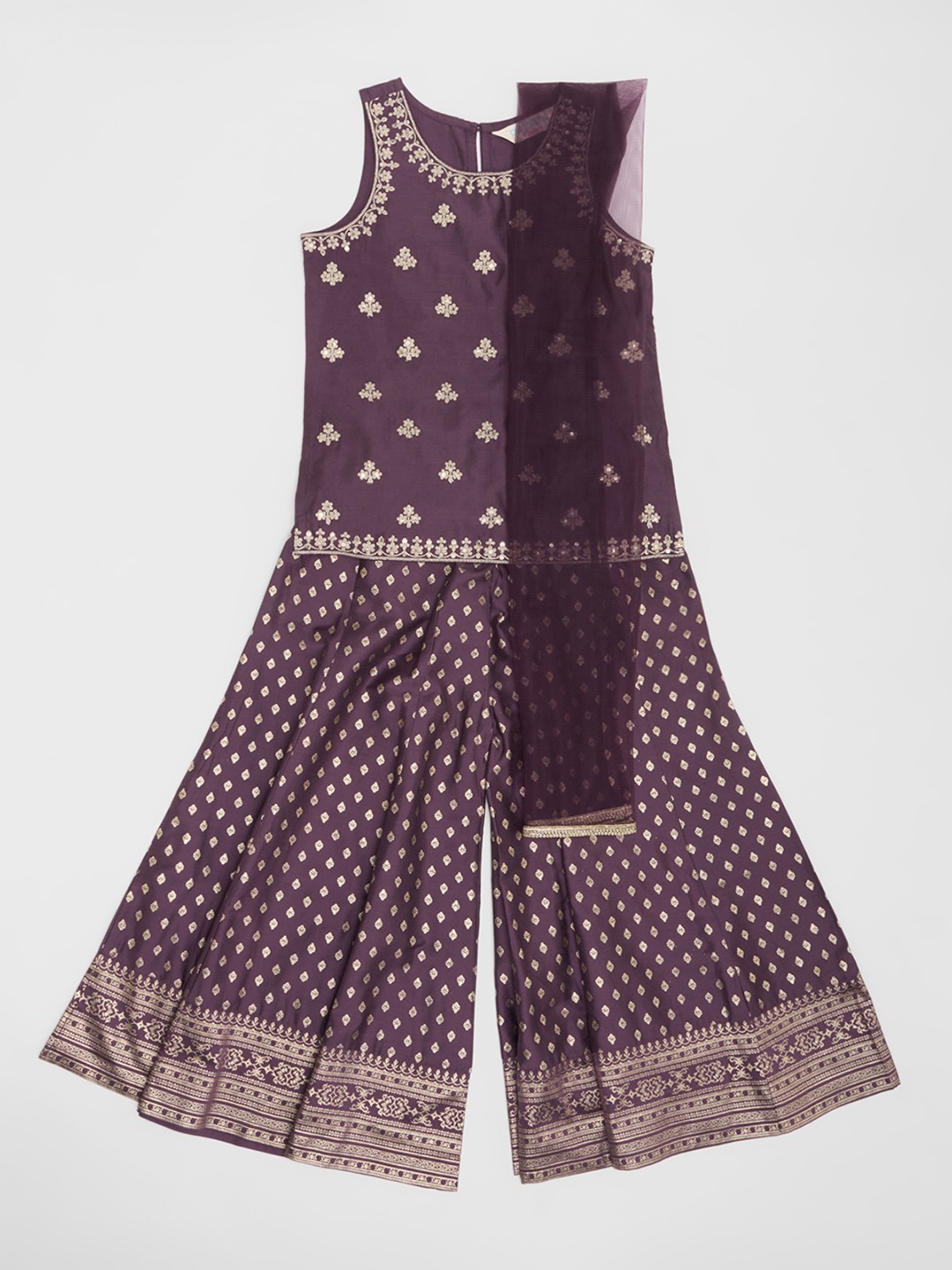 Home/Kurta Sets/Akkriti By Pantaloons/purple embroidered kurta foil print palazzos & sheer dupatta festive set