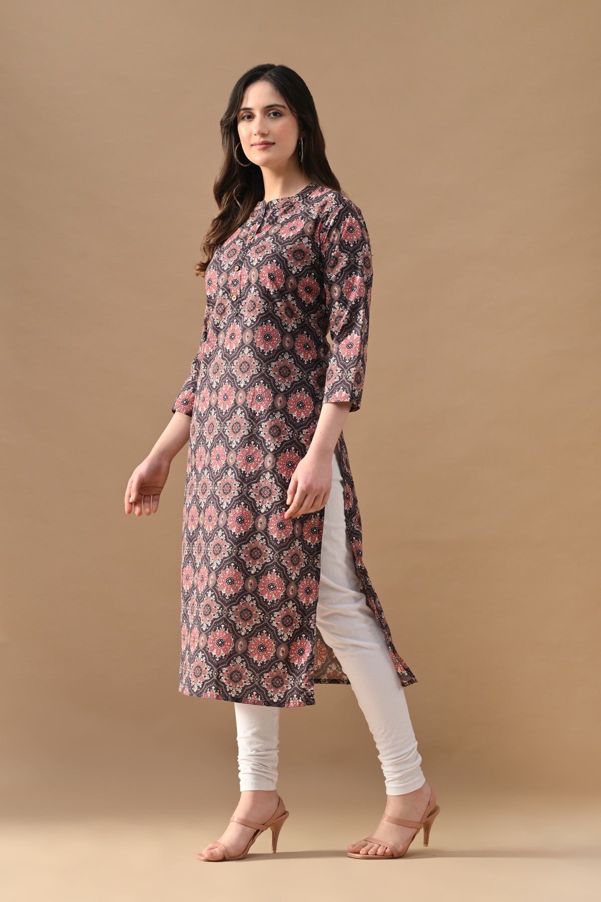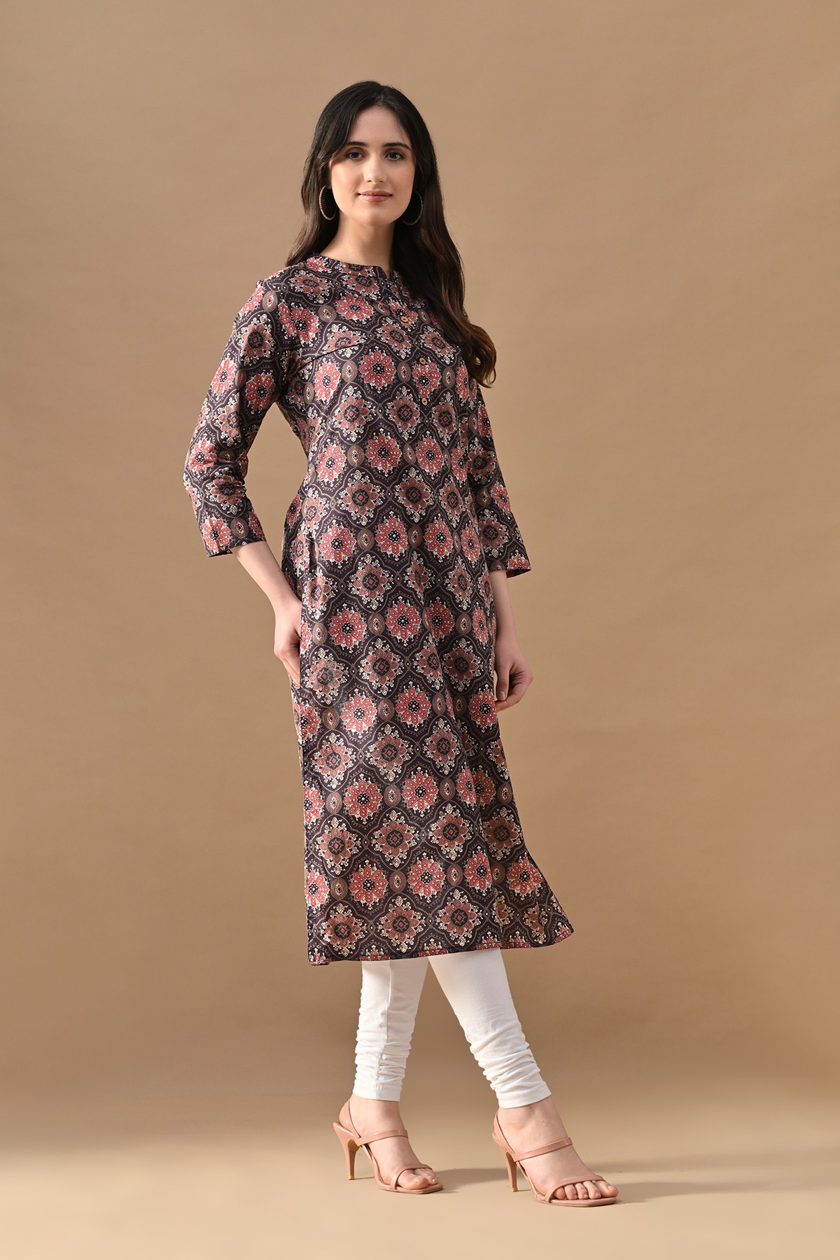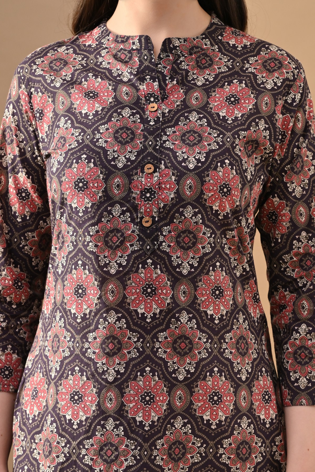 Step out in effortless charm with our purple printed kurta. designed with classic mandarin collar, button down closure, three-quarter sleeves, side-slits, straight hemline, this versatile piece beautifully blends comfort with elegance—making it perfect for casual outings.