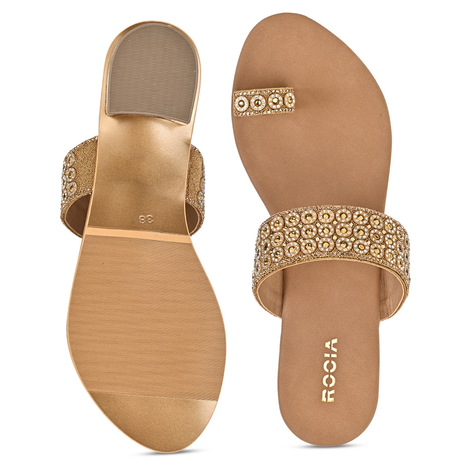 Comfortable Rocia Diamond Studded Low Box Heel One-Toe Sandals. These versatile ethnic sandals featuring straps adorned with glitter and diamonds will add sparkle to your oufits like salwars and sarees. Heel Height : 1.5 inches